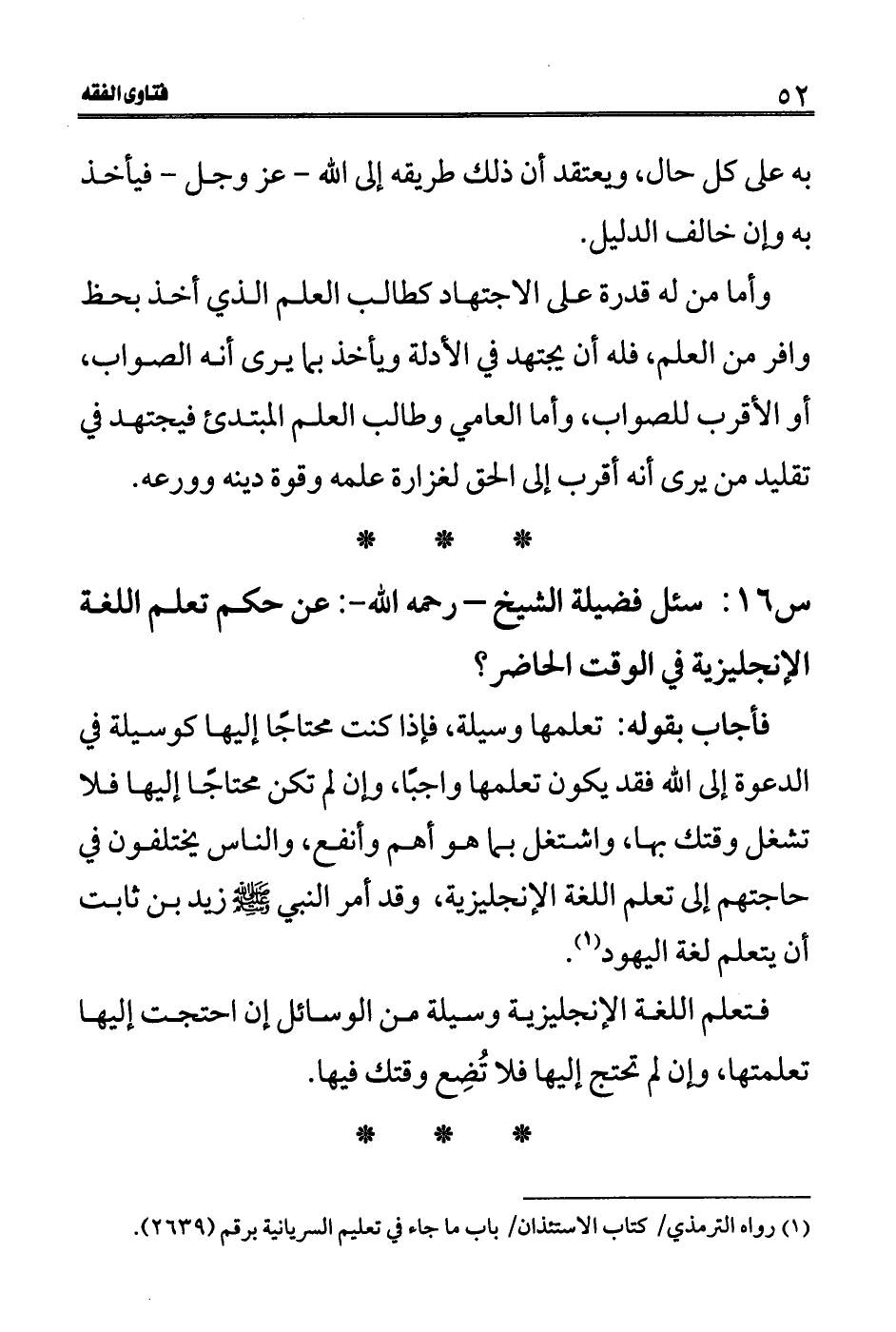 س 16: سئل فضيلة الشيخ- رحمه الله-: عن حكم تعلم اللغة الإنجليزية في الوقت الحاضر؟