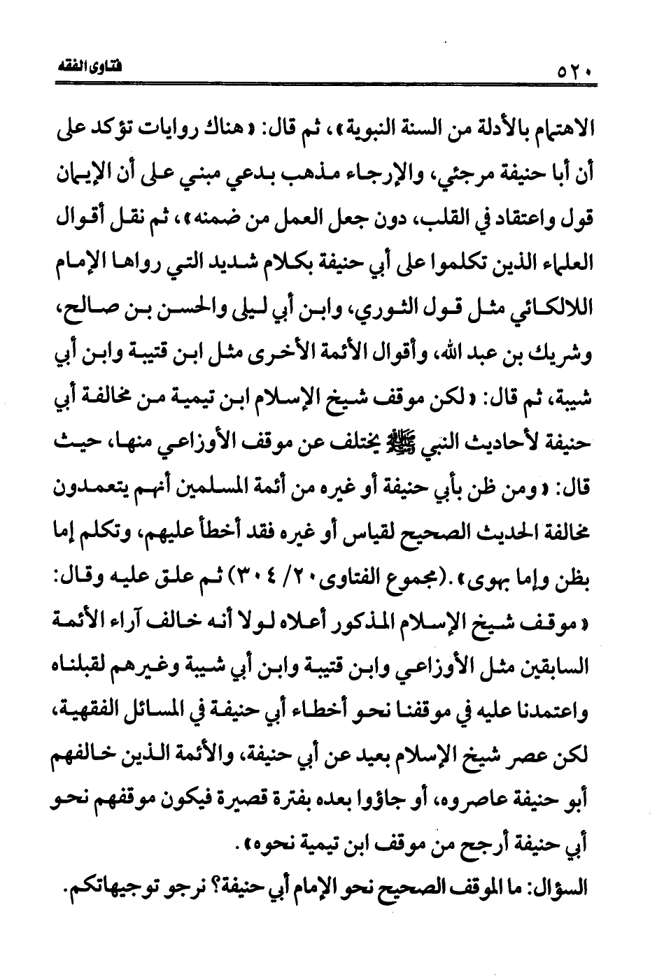 الاهتمام بالأدلة من السنة النبوية"، ثم قال: "هناك روايات تؤكد على أن أبا حنيفة مرجئي، والإرجاء مذهب بدعي مبني على أن الإيمان قول واعتقاد في القلب، دون جعل العمل من ضمنه"، ثم نقل أقوال العلماء الذين تكلموا على أبي حنيفة بكلام شديد التي رواها الإمام اللالكائي مثل قول الثوري، وابن أبي ليلى والحسن بن صالح، وشريك بن عبد الله، وأقوال الأئمة الأخرى مثل ابن قتيبة وابن أبي شيبة، ثم قال: "لكن موقف شيخ الإسلام ابن تيمية من مخالفة أبي حنيفة لأحاديث النبي - صلى الله عليه وسلم - يختلف عن موقف الأوزاعي منها، حيث قال: "ومن ظن بأبي حنيفة أو غيره من أئمة المسلمين أنهم يتعمدون مخالفة الحديث الصحيح لقياس أو غيره فقد أخطأ عليهم، وتكلم إما