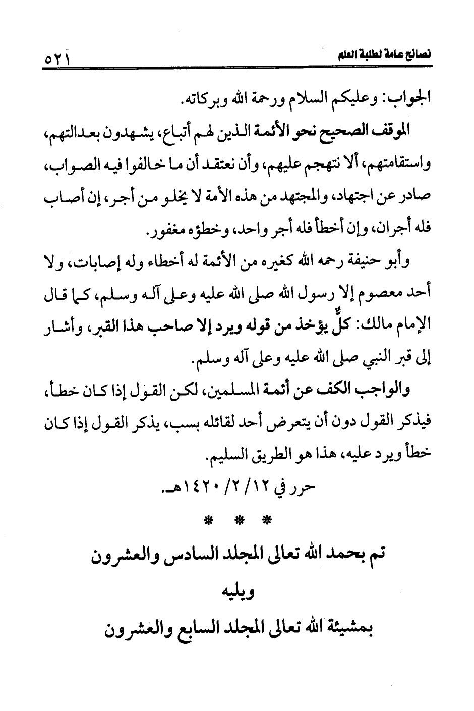 الموقف الصحيح نحو الأئمة الذين لهم أتباع، يشهدون بعدالتهم، واستقامتهم، ألا نتهجم عليهم، وأن نعتقد أن ما خالفوا فيه الصواب، صادر عن اجتهاد، والمجتهد من هذه الأمة لا يخلو من أجر، إن أصاب فله أجران، وإن أخطأ فله أجر واحد، وخطؤه مغفور.