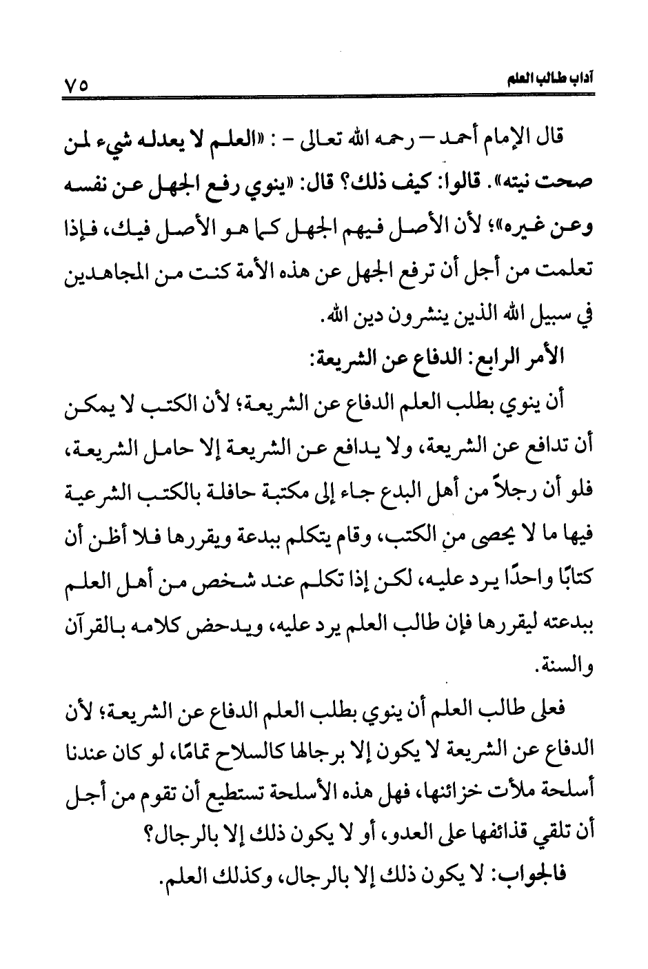 فعلى طالب العلم أن ينوي بطلب العلم الدفاع عن الشريعة؛ لأن الدفاع عن الشريعة لا يكون إلا برجالها كالسلاح تمامًا، لو كان عندنا أسلحة ملأت خزائنها، فهل هذه الأسلحة تستطيع أن تقوم من أجل أن تلقي قذائفها على العدو، أو لا يكون ذلك إلا بالرجال؟