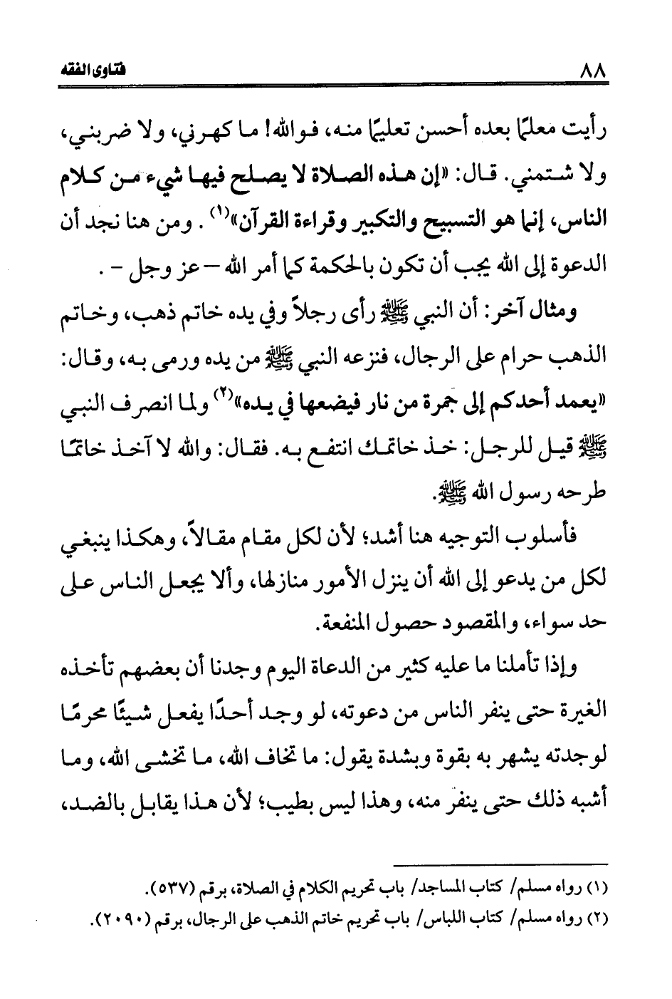 رأيت معلمًا بعده أحسن تعليمًا منه، فوالله! ما كهرني، ولا ضربني، ولا شتمني. قال: "إن هذه الصلاة لا يصلح فيها شيء من كلام الناس، إنما هو التسبيح والتكبير وقراءة القرآن " (1) . ومن هنا نجد أن الدعوة إلى الله يجب أن تكون بالحكمة كما أمر الله- عز وجل-.