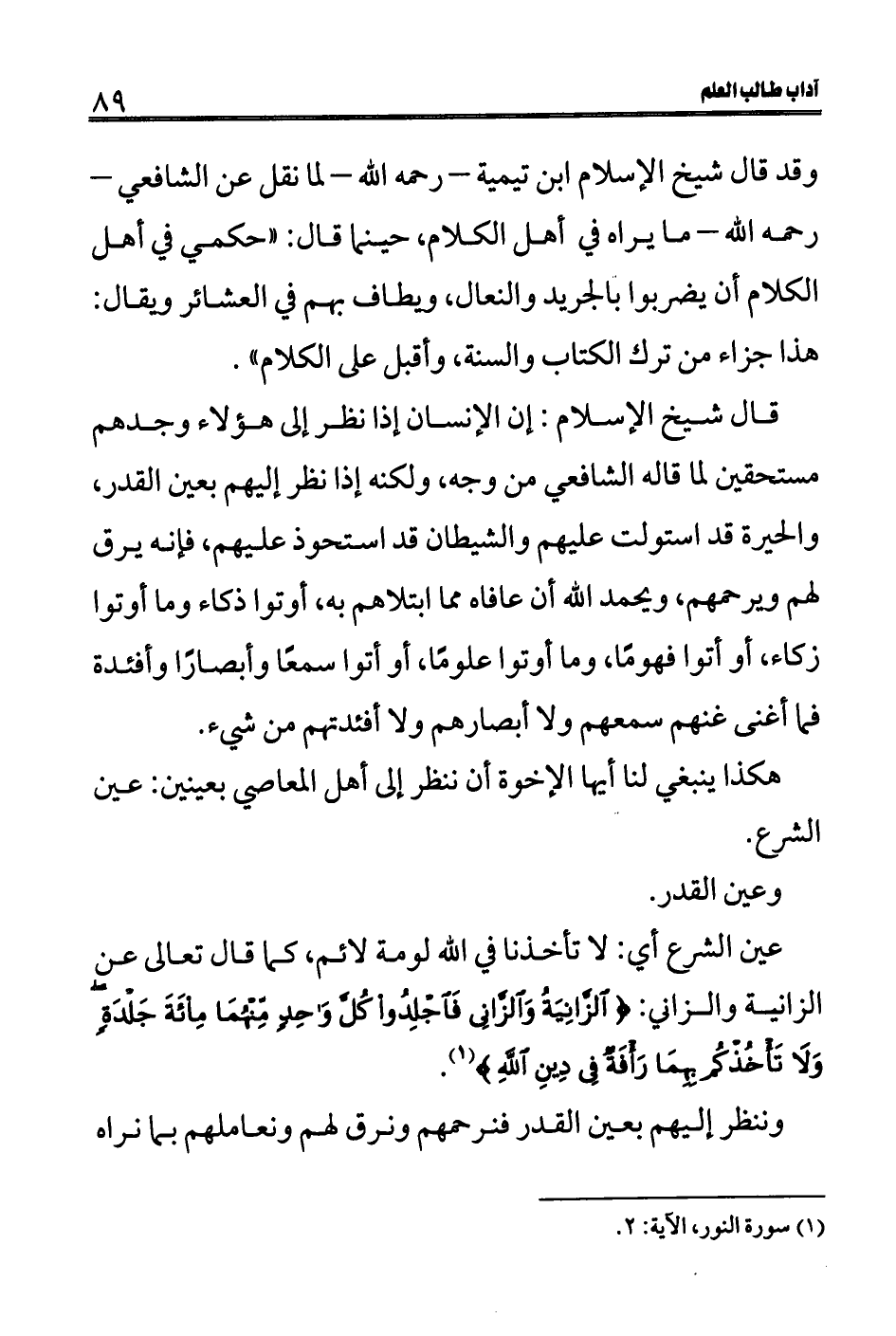وقد قال شيخ الإسلام ابن تيمية- رحمه الله- لما نقل عن الشافعي- رحمه الله- ما يراه في أهل الكلام، حينما قال: "حكمي في أهل الكلام أن يضربوا بالجريد والنعال، ويطاف بهم في العشائر ويقال: هذا جزاء من ترك الكتاب والسنة، وأقبل على الكلام ".
