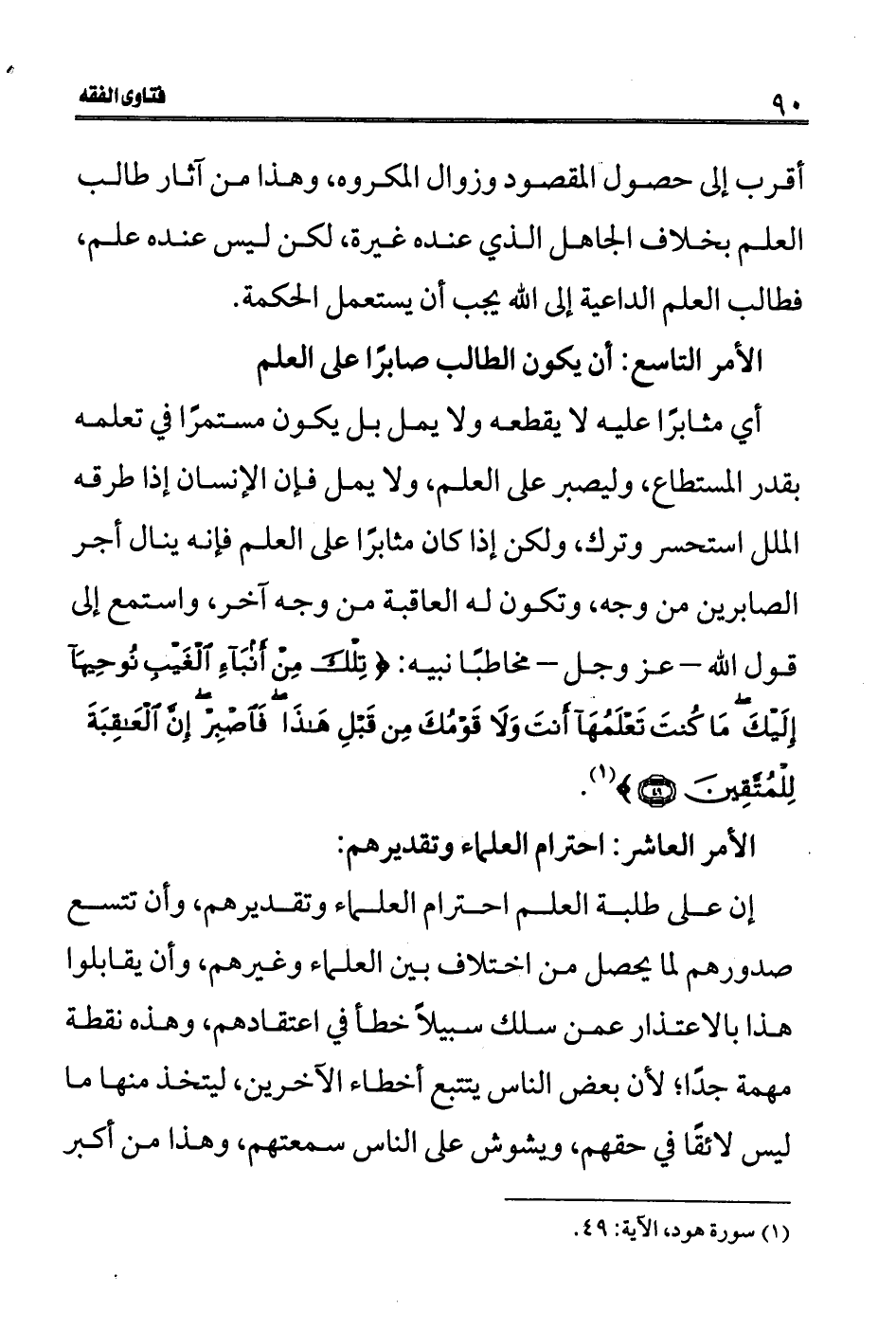 الأمر التاسع: أن يكون الطالب صابرًا على العلم أي مثابرًا عليه لا يقطعه ولا يمل بل يكون مستمرًا في تعلمه بقدر المستطاع، وليصبر على العلم، ولا يمل فإن الإنسان إذا طرقه الملل استحسر وترك، ولكن إذا كان مثابرًا على العلم فإنه ينال أجر الصابرين من وجه، وتكون له العاقبة من وجه آخر، واستمع إلى قول الله- عز وجل- مخاطبًا نبيه: (تِلْكَ مِنْ أَنْبَاءِ الْغَيْبِ نُوحِيهَا إِلَيْكَ مَا كُنْتَ تَعْلَمُهَا أَنْتَ وَلَا قَوْمُكَ مِنْ قَبْلِ هَذَا فَاصْبِرْ إِنَّ الْعَاقِبَةَ لِلْمُتَّقِينَ (49)) (1) .