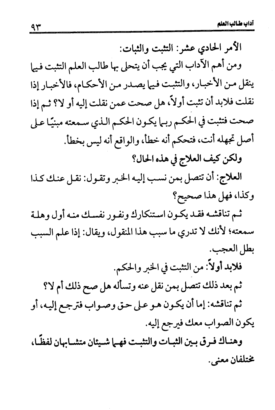 ومن أهم الآداب التي يجب أن يتحلى بها طالب العلم التثبت فيما ينقل من الأخبار، والتثبت فيما يصدر من الأحكام، فالأخبار إذا نقلت فلابد أن تثبت أولاً، هل صحت عمن نقلت إليه أو لا؟ ثم إذا صحت فتثبت في الحكم ربما يكون الحكم الذي سمعته مبنيًا على أصل تجهله أنت، فتحكم أنه خطأ، والواقع أنه ليس بخطأ.
