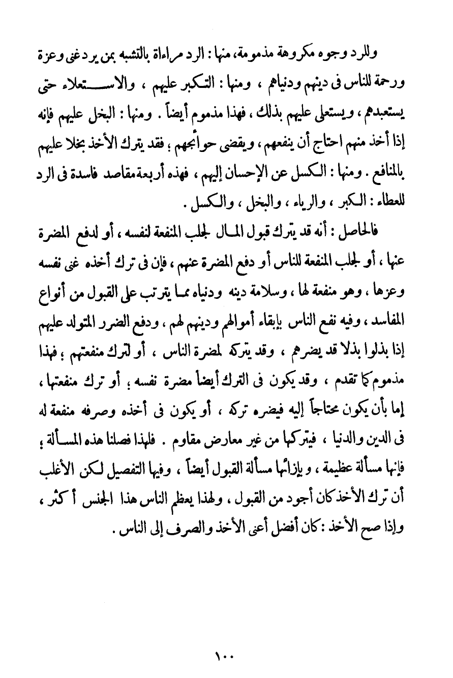 وَلِلرَّدِّ وُجُوهٌ مَكْرُوهَةٌ مَذْمُومَةٌ مِنْهَا: الرَّدُّ مُرَاءَاةً بِالتَّشَبُّهِ بِمَنْ يُرِيدُ غِنًى وَعِزَّةً وَرَحْمَةً لِلنَّاسِ فِي دِينِهِمْ وَدُنْيَاهُمْ. وَمِنْهَا التَّكَبُّرُ عَلَيْهِمْ وَالِاسْتِعْلَاءُ حَتَّى يَسْتَعْبِدَهُمْ وَيَسْتَعْلِيَ عَلَيْهِمْ بِذَلِكَ فَهَذَا مَذْمُومٌ أَيْضًا. وَمِنْهَا الْبُخْلُ عَلَيْهِمْ فَإِنَّهُ إذَا أَخَذَ مِنْهُمْ احْتَاجَ أَنْ يَنْفَعَهُمْ وَيَقْضِيَ حَوَائِجَهُمْ فَقَدْ يَتْرُكُ الْأَخْذَ بُخْلًا عَلَيْهِمْ بِالْمَنَافِعِ. وَمِنْهَا الْكَسَلُ عَنْ الْإِحْسَانِ إلَيْهِمْ فَهَذِهِ أَرْبَعُ مَقَاصِدَ فَاسِدَةٌ فِي الرَّدِّ لِلْعَطَاءِ: الْكِبْرُ وَالرِّيَاءُ وَالْبُخْلُ وَالْكَسَلُ. فَالْحَاصِلُ أَنَّهُ قَدْ يَتْرُكُ قَبُولَ الْمَالِ لِجَلْبِ الْمَنْفَعَةِ لِنَفْسِهِ أَوْ لِدَفْعِ الْمَضَرَّةِ عَنْهَا أَوْ لِجَلْبِ الْمَنْفَعَةِ لِلنَّاسِ أَوْ دَفْعِ الْمَضَرَّةِ عَنْهُمْ فَإِنَّ فِي تَرْكِ أَخْذِهِ غِنَى نَفْسِهِ وَعِزَّهَا وَهُوَ مَنْفَعَةٌ لَهَا وَسَلَامَةُ دِينِهِ وَدُنْيَاهُ مِمَّا يَتَرَتَّبُ عَلَى الْقَبُولِ مِنْ أَنْوَاعِ الْمَفَاسِدِ وَفِيهِ نَفْعُ النَّاسِ بِإِبْقَاءِ أَمْوَالِهِمْ وَدِينِهِمْ لَهُمْ وَدَفْعِ الضَّرَرِ الْمُتَوَلِّدِ عَلَيْهِمْ إذَا بَذَلُوا بَذْلًا قَدْ يَضُرُّهُمْ وَقَدْ يَتْرُكُهُ لِمَضَرَّةِ النَّاسِ أَوْ لِتَرْكِ مَنْفَعَتِهِمْ فَهَذَا مَذْمُومٌ كَمَا تَقَدَّمَ وَقَدْ يَكُونُ فِي التَّرْكِ أَيْضًا مَضَرَّةُ نَفْسِهِ أَوْ تَرْكُ مَنْفَعَتِهَا إمَّا بِأَنْ يَكُونَ مُحْتَاجًا إلَيْهِ فَيَضُرُّهُ تَرْكُهُ أَوْ يَكُونَ فِي أَخْذِهِ وَصَرْفِهِ مَنْفَعَةٌ لَهُ فِي الدِّينِ وَالدُّنْيَا فَيَتْرُكُهَا مِنْ غَيْرِ مُعَارِضٍ مُقَاوِمٍ. فَلِهَذَا فَصَّلْنَا هَذِهِ الْمَسْأَلَةَ فَإِنَّهَا مَسْأَلَةٌ عَظِيمَةٌ وَبِإِزَائِهَا مَسْأَلَةُ الْقَبُولِ أَيْضًا وَفِيهَا التَّفْصِيلُ لَكِنَّ الْأَغْلَبَ أَنَّ تَرْكَ الْأَخْذِ كَانَ أَجْوَدَ مِنْ الْقَبُولِ وَلِهَذَا يُعَظِّمُ النَّاسُ هَذَا الْجِنْسَ أَكْثَرَ وَإِذَا صَحَّ الْأَخْذُ كَانَ أَفْضَلَ أَعْنِي الْأَخْذَ وَالصَّرْفَ إلَى النَّاسِ.