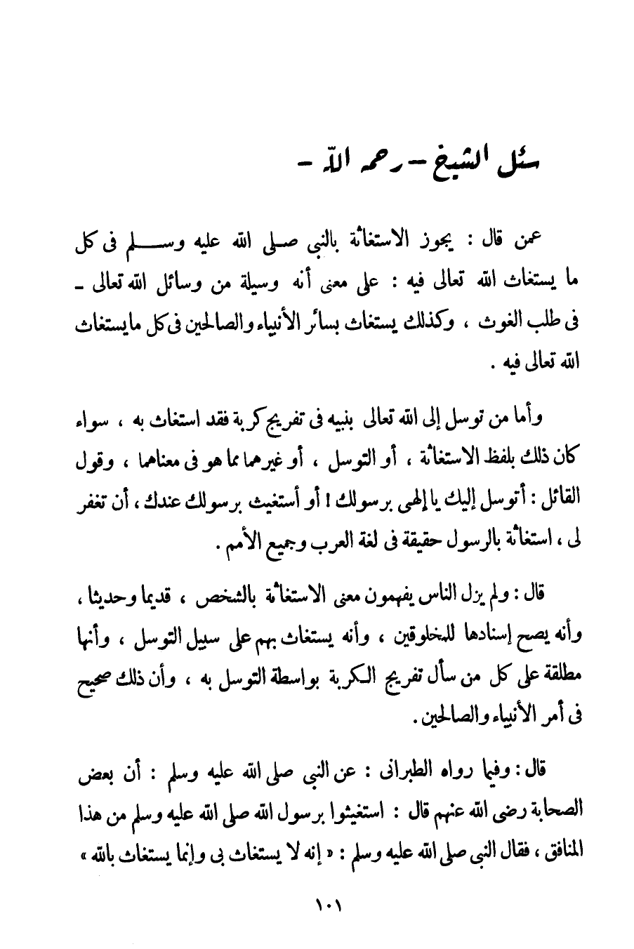 عَمَّنْ قَالَ: يَجُوزُ الِاسْتِغَاثَةُ بِالنَّبِيِّ صَلَّى اللَّهُ عَلَيْهِ وَسَلَّمَ فِي كُلِّ مَا يُسْتَغَاثُ اللَّهُ تَعَالَى فِيهِ: عَلَى مَعْنَى أَنَّهُ وَسِيلَةٌ مِنْ وَسَائِلِ اللَّهِ تَعَالَى - فِي طَلَبِ الْغَوْثِ وَكَذَلِكَ يُسْتَغَاثُ بِسَائِرِ الْأَنْبِيَاءِ وَالصَّالِحِينَ فِي كُلِّ مَا يُسْتَغَاثُ اللَّهُ تَعَالَى فِيهِ. وَأَمَّا مَنْ تَوَسَّلَ إلَى اللَّهِ تَعَالَى بِنَبِيِّهِ فِي تَفْرِيجِ كُرْبَةٍ فَقَدْ اسْتَغَاثَ بِهِ سَوَاءٌ كَانَ ذَلِكَ بِلَفْظِ الِاسْتِغَاثَةِ أَوْ التَّوَسُّلِ أَوْ غَيْرِهِمَا مِمَّا هُوَ فِي مَعْنَاهُمَا وَقَوْلُ الْقَائِلِ: أَتَوَسَّلُ إلَيْك يَا إلَهِي بِرَسُولِك أَوْ أَسْتَغِيثُ بِرَسُولِك عِنْدَك أَنْ تَغْفِرَ لِي اسْتِغَاثَةٌ بِالرَّسُولِ حَقِيقَةً فِي لُغَةِ الْعَرَبِ وَجَمِيعِ الْأُمَمِ. قَالَ: وَلَمْ يَزَلْ النَّاسُ يَفْهَمُونَ مَعْنَى الِاسْتِغَاثَةِ بِالشَّخْصِ قَدِيمًا وَحَدِيثًا وَأَنَّهُ يَصِحُّ إسْنَادُهَا لِلْمَخْلُوقِينَ وَأَنَّهُ يُسْتَغَاثُ بِهِمْ عَلَى سَبِيلِ التَّوَسُّلِ وَأَنَّهَا مُطْلَقَةٌ عَلَى كُلِّ مَنْ سَأَلَ تَفْرِيجَ الْكُرْبَةِ بِوَاسِطَةِ التَّوَسُّلِ بِهِ، وَأَنَّ ذَلِكَ صَحِيحٌ فِي أَمْرِ الْأَنْبِيَاءِ وَالصَّالِحِينَ. قَالَ: وَفِيمَا رَوَاهُ الطَّبَرَانِي: عَنْ النَّبِيِّ صَلَّى اللَّهُ عَلَيْهِ وَسَلَّمَ {أَنَّ بَعْضَ الصَّحَابَةِ رَضِيَ اللَّهُ عَنْهُمْ قَالَ: اسْتَغِيثُوا بِرَسُولِ اللَّهِ صَلَّى اللَّهُ عَلَيْهِ وَسَلَّمَ مِنْ هَذَا الْمُنَافِقِ فَقَالَ النَّبِيُّ صَلَّى اللَّهُ عَلَيْهِ وَسَلَّمَ إنَّهُ لَا يُسْتَغَاثُ بِي وَإِنَّمَا يُسْتَغَاثُ بِاَللَّهِ}