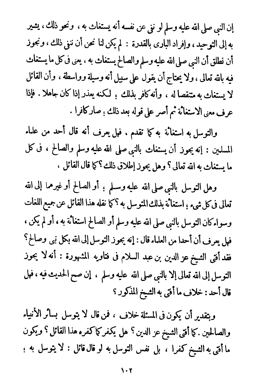 إنَّ النَّبِيَّ صَلَّى اللَّهُ عَلَيْهِ وَسَلَّمَ لَوْ نَفَى عَنْ نَفْسِهِ أَنَّهُ يُسْتَغَاثُ بِهِ وَنَحْوُ ذَلِكَ يُشِيرُ بِهِ إلَى التَّوْحِيدِ وَإِفْرَادِ الْبَارِي بِالْقُدْرَةِ: لَمْ يَكُنْ لَنَا نَحْنُ أَنْ نَنْفِيَ ذَلِكَ وَنُجَوِّزَ أَنْ نُطْلِقَ أَنَّ النَّبِيَّ صَلَّى اللَّهُ عَلَيْهِ وَسَلَّمَ وَالصَّالِحَ يُسْتَغَاثُ بِهِ يَعْنِي فِي كُلِّ مَا يُسْتَغَاثُ فِيهِ بِاَللَّهِ تَعَالَى وَلَا يَحْتَاجُ أَنْ يَقُولَ عَلَى سَبِيلِ أَنَّهُ وَسِيلَةٌ وَوَاسِطَةٌ وَأَنَّ الْقَائِلَ لَا يُسْتَغَاثُ بِهِ مُنْتَقِصًا لَهُ وَأَنَّهُ كَافِرٌ بِذَلِكَ؛ لَكِنَّهُ يُعْذَرُ إذَا كَانَ جَاهِلًا. فَإِذَا عَرَفَ مَعْنَى الِاسْتِغَاثَةِ ثُمَّ أَصَرَّ عَلَى قَوْلِهِ بَعْدَ ذَلِكَ؛ صَارَ كَافِرًا. وَالتَّوَسُّلُ بِهِ اسْتِغَاثَةٌ بِهِ كَمَا تَقَدَّمَ فَهَلْ يُعْرَفُ أَنَّهُ قَالَ أَحَدٌ مِنْ عُلَمَاءِ الْمُسْلِمِينَ: إنَّهُ يَجُوزُ أَنْ يُسْتَغَاثَ بِالنَّبِيِّ صَلَّى اللَّهُ عَلَيْهِ وَسَلَّمَ وَالصَّالِحِ فِي كُلِّ مَا يُسْتَغَاثُ بِهِ اللَّهُ تَعَالَى؟ وَهَلْ يَجُوزُ إطْلَاقُ ذَلِكَ؟ كَمَا قَالَ الْقَائِلُ وَهَلْ التَّوَسُّلُ بِالنَّبِيِّ صَلَّى اللَّهُ عَلَيْهِ وَسَلَّمَ أَوْ الصَّالِحِ أَوْ غَيْرِهِمَا إلَى اللَّهِ تَعَالَى فِي كُلِّ شَيْءٍ؛ اسْتِغَاثَةٌ بِذَلِكَ الْمُتَوَسَّلِ بِهِ؟ كَمَا نَقَلَهُ هَذَا الْقَائِلُ عَنْ جَمِيعِ اللُّغَاتِ وَسَوَاءٌ كَانَ التَّوَسُّلُ بِالنَّبِيِّ صَلَّى اللَّهُ عَلَيْهِ وَسَلَّمَ أَوْ الصَّالِحِ اسْتِغَاثَةً بِهِ أَوْ لَمْ يَكُنْ فَهَلْ يُعْرَفُ أَنَّ أَحَدًا مِنْ الْعُلَمَاءِ قَالَ: إنَّهُ يَجُوزُ التَّوَسُّلُ إلَى اللَّهِ بِكُلِّ نَبِيٍّ وَصَالِحٍ؟ فَقَدْ أَفْتَى الشَّيْخُ عِزُّ الدِّينِ بْنُ عَبْدِ السَّلَامِ فِي فَتَاوِيهِ الْمَشْهُورَةِ: أَنَّهُ لَا يَجُوزُ التَّوَسُّلُ إلَى اللَّهِ تَعَالَى إلَّا بِالنَّبِيِّ صَلَّى اللَّهُ عَلَيْهِ وَسَلَّمَ إنْ صَحَّ الْحَدِيثُ فِيهِ فَهَلْ قَالَ أَحَدٌ خِلَافَ مَا أَفْتَى بِهِ الشَّيْخُ الْمَذْكُورُ؟ وَبِتَقْدِيرِ أَنْ يَكُونَ فِي الْمَسْأَلَةِ خِلَافٌ فَمَنْ قَالَ: لَا يُتَوَسَّلُ بِسَائِرِ الْأَنْبِيَاءِ وَالصَّالِحِينَ. كَمَا أَفْتَى الشَّيْخُ عِزُّ الدِّينِ؟ هَلْ يَكْفُرُ كَمَا كَفَّرَهُ هَذَا الْقَائِلُ؟ وَيَكُونُ مَا أَفْتَى بِهِ الشَّيْخُ كُفْرًا بَلْ نَفْسُ التَّوَسُّلِ بِهِ لَوْ قَالَ قَائِلٌ: لَا يُتَوَسَّلُ بِهِ؛
