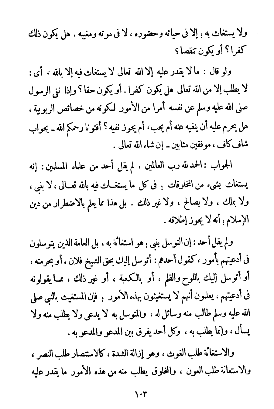 الْجَوَابُ: الْحَمْدُ لِلَّهِ رَبِّ الْعَالَمِينَ، لَمْ يَقُلْ أَحَدٌ مِنْ عُلَمَاءِ الْمُسْلِمِينَ: إنَّهُ يُسْتَغَاثُ بِشَيْءِ مِنْ الْمَخْلُوقَاتِ؛ فِي كُلِّ مَا يُسْتَغَاثُ فِيهِ بِاَللَّهِ تَعَالَى لَا بِنَبِيِّ وَلَا بِمَلَكِ وَلَا بِصَالِحِ وَلَا غَيْرِ ذَلِكَ. بَلْ هَذَا مِمَّا يُعْلَمُ بِالِاضْطِرَارِ مِنْ دِينِ الْإِسْلَامِ؛ أَنَّهُ لَا يَجُوزُ إطْلَاقُهُ. وَلَمْ يَقُلْ أَحَدٌ: إنَّ التَّوَسُّلَ بِنَبِيِّ؛ هُوَ اسْتِغَاثَةٌ بِهِ بَلْ الْعَامَّةُ الَّذِينَ يَتَوَسَّلُونَ فِي أَدْعِيَتِهِمْ بِأُمُورِ كَقَوْلِ أَحَدِهِمْ: أَتَوَسَّلُ إلَيْك بِحَقِّ الشَّيْخِ فُلَانٍ أَوْ بِحُرْمَتِهِ أَوْ أَتَوَسَّلُ إلَيْك بِاللَّوْحِ وَالْقَلَمِ أَوْ بِالْكَعْبَةِ أَوْ غَيْرِ ذَلِكَ مِمَّا يَقُولُونَهُ فِي أَدْعِيَتِهِمْ يَعْلَمُونَ أَنَّهُمْ لَا يَسْتَغِيثُونَ بِهَذِهِ الْأُمُورِ؛ فَإِنَّ الْمُسْتَغِيثَ بِالنَّبِيِّ صَلَّى اللَّهُ عَلَيْهِ وَسَلَّمَ طَالِبٌ مِنْهُ وَسَائِلٌ لَهُ وَالْمُتَوَسَّلُ بِهِ لَا يُدْعَى وَلَا يُطْلَبُ مِنْهُ وَلَا يُسْأَلُ وَإِنَّمَا يُطْلَبُ بِهِ وَكُلُّ أَحَدٍ يُفَرِّقُ بَيْنَ الْمَدْعُوِّ وَالْمَدْعُوِّ بِهِ. وَالِاسْتِغَاثَةُ طَلَبُ الْغَوْثِ وَهُوَ إزَالَةُ الشِّدَّةِ كَالِاسْتِنْصَارِ طَلَبُ النَّصْرِ وَالِاسْتِعَانَةِ طَلَبُ الْعَوْنِ وَالْمَخْلُوقُ يُطْلَبُ مِنْهُ مِنْ هَذِهِ الْأُمُورِ مَا يَقْدِرُ عَلَيْهِ