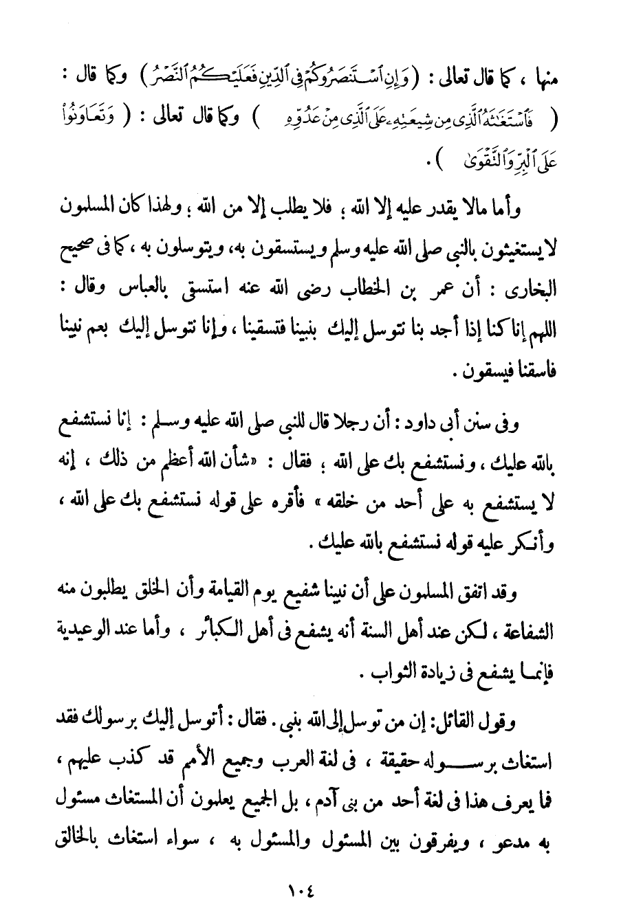 مِنْهَا كَمَا قَالَ تَعَالَى: {وَإِنِ اسْتَنْصَرُوكُمْ فِي الدِّينِ فَعَلَيْكُمُ النَّصْرُ} وَكَمَا قَالَ: {فَاسْتَغَاثَهُ الَّذِي مِنْ شِيعَتِهِ عَلَى الَّذِي مِنْ عَدُوِّهِ} وَكَمَا قَالَ تَعَالَى: {وَتَعَاوَنُوا عَلَى الْبِرِّ وَالتَّقْوَى} . وَأَمَّا مَا لَا يَقْدِرُ عَلَيْهِ إلَّا اللَّهُ؛ فَلَا يُطْلَبُ إلَّا مِنْ اللَّهِ؛ وَلِهَذَا كَانَ الْمُسْلِمُونَ لَا يَسْتَغِيثُونَ بِالنَّبِيِّ صَلَّى اللَّهُ عَلَيْهِ وَسَلَّمَ وَيَسْتَسْقُونَ بِهِ وَيَتَوَسَّلُونَ بِهِ كَمَا فِي صَحِيحِ الْبُخَارِيِّ: أَنَّ عُمَرَ بْنَ الْخَطَّابِ رَضِيَ اللَّهُ عَنْهُ اسْتَسْقَى بِالْعَبَّاسِ وَقَالَ: اللَّهُمَّ إنَّا كُنَّا إذَا أَجْدَبْنَا نَتَوَسَّلُ إلَيْك بِنَبِيِّنَا فَتَسْقِينَا وَإِنَّا نَتَوَسَّلُ إلَيْك بِعَمِّ نَبِيِّنَا فَاسْقِنَا فَيُسْقَوْنَ. وَفِي سُنَنِ أَبِي دَاوُد: {أَنَّ رَجُلًا قَالَ لِلنَّبِيِّ صَلَّى اللَّهُ عَلَيْهِ وَسَلَّمَ إنَّا نَسْتَشْفِعُ بِاَللَّهِ عَلَيْك وَنَسْتَشْفِعُ بِك عَلَى اللَّهِ؛ فَقَالَ: شَأْنُ اللَّهِ أَعْظَمُ مِنْ ذَلِكَ إنَّهُ لَا يُسْتَشْفَعُ بِهِ عَلَى أَحَدٍ مِنْ خَلْقِهِ} فَأَقَرَّهُ عَلَى قَوْلِهِ نَسْتَشْفِعُ بِك عَلَى اللَّهِ وَأَنْكَرَ عَلَيْهِ قَوْلَهُ نَسْتَشْفِعُ بِاَللَّهِ عَلَيْك. وَقَدْ اتَّفَقَ الْمُسْلِمُونَ عَلَى أَنَّ نَبِيَّنَا شَفِيعٌ يَوْمَ الْقِيَامَةِ وَأَنَّ الْخَلْقَ يَطْلُبُونَ مِنْهُ الشَّفَاعَةَ لَكِنْ عِنْدَ أَهْلِ السُّنَّةِ أَنَّهُ يُشَفَّعُ فِي أَهْلِ الْكَبَائِرِ وَأَمَّا عِنْدَ الوعيدية فَإِنَّمَا يُشَفَّعُ فِي زِيَادَةِ الثَّوَابِ. وَقَوْلُ الْقَائِلِ: إنَّ مَنْ تَوَسَّلَ إلَى اللَّهِ بِنَبِيِّ. فَقَالَ: أَتَوَسَّلُ إلَيْك بِرَسُولِك فَقَدْ اسْتَغَاثَ بِرَسُولِهِ حَقِيقَةً، فِي لُغَةِ الْعَرَبِ وَجَمِيعِ الْأُمَمِ قَدْ كُذِّبَ عَلَيْهِمْ فَمَا يُعْرَفُ هَذَا فِي لُغَةِ أَحَدٍ مِنْ بَنِي آدَمَ بَلْ الْجَمِيعُ يَعْلَمُونَ أَنَّ الْمُسْتَغَاثَ مَسْئُولٌ بِهِ مَدْعُوٌّ وَيُفَرِّقُونَ بَيْنَ الْمَسْئُولِ وَالْمَسْئُولِ بِهِ سَوَاءٌ اسْتَغَاثَ بِالْخَالِقِ