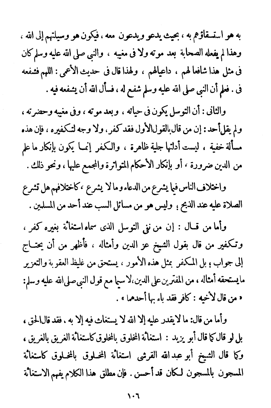 بِهِ هُوَ اسْتِسْقَاؤُهُمْ بِهِ بِحَيْثُ يَدْعُو وَيَدْعُونَ مَعَهُ فَيَكُونُ هُوَ وَسِيلَتَهُمْ إلَى اللَّهِ وَهَذَا لَمْ يَفْعَلْهُ الصَّحَابَةُ بَعْدَ مَوْتِهِ وَلَا فِي مَغِيبِهِ وَالنَّبِيُّ صَلَّى اللَّهُ عَلَيْهِ وَسَلَّمَ كَانَ فِي مِثْلِ هَذَا شَافِعًا لَهُمْ دَاعِيًا لَهُمْ وَلِهَذَا قَالَ فِي حَدِيثِ الْأَعْمَى: اللَّهُمَّ فَشَفِّعْهُ فِيَّ. فَعَلِمَ أَنَّ النَّبِيَّ صَلَّى اللَّهُ عَلَيْهِ وَسَلَّمَ شَفَعَ لَهُ فَسَأَلَ اللَّهَ أَنْ يُشَفِّعَهُ فِيهِ. وَالثَّانِي: أَنَّ التَّوَسُّلَ يَكُونُ فِي حَيَاتِهِ وَبَعْدَ مَوْتِهِ وَفِي مَغِيبِهِ وَحَضْرَتِهِ وَلَمْ يَقُلْ أَحَدٌ: إنَّ مَنْ قَالَ بِالْقَوْلِ الْأَوَّلِ فَقَدْ كَفَرَ وَلَا وَجْهَ لِتَكْفِيرِهِ فَإِنَّ هَذِهِ مَسْأَلَةٌ خَفِيَّةٌ لَيْسَتْ أَدِلَّتُهَا جَلِيَّةً ظَاهِرَةً وَالْكُفْرُ إنَّمَا يَكُونُ بِإِنْكَارِ مَا عُلِمَ مِنْ الدِّينِ ضَرُورَةً أَوْ بِإِنْكَارِ الْأَحْكَامِ الْمُتَوَاتِرَةِ وَالْمُجْمَعِ عَلَيْهَا وَنَحْوِ ذَلِكَ. وَاخْتِلَافُ النَّاسِ فِيمَا يُشْرَعُ مِنْ الدُّعَاءِ وَمَا لَا يُشْرَعُ كَاخْتِلَافِهِمْ هَلْ تُشْرَعُ الصَّلَاةُ عَلَيْهِ عِنْدَ الذَّبْحِ؛ وَلَيْسَ هُوَ مِنْ مَسَائِلِ السَّبِّ عِنْدَ أَحَدٍ مِنْ الْمُسْلِمِينَ. وَأَمَّا مَنْ قَالَ: إنَّ مَنْ نَفَى التَّوَسُّلَ الَّذِي سَمَّاهُ اسْتِغَاثَةً بِغَيْرِهِ كَفَرَ وَتَكْفِيرُ مَنْ قَالَ بِقَوْلِ الشَّيْخِ عِزِّ الدِّينِ وَأَمْثَالِهِ فَأَظْهَرُ مِنْ أَنْ يَحْتَاجَ إلَى جَوَابٍ؛ بَلْ الْمُكَفِّرُ بِمِثْلِ هَذِهِ الْأُمُورِ يَسْتَحِقُّ مِنْ غَلِيظِ الْعُقُوبَةِ وَالتَّعْزِيرِ مَا يَسْتَحِقُّهُ أَمْثَالُهُ مِنْ الْمُفْتَرِينَ عَلَى الدِّينِ لَا سِيَّمَا مَعَ قَوْلِ النَّبِيِّ صَلَّى اللَّهُ عَلَيْهِ وَسَلَّمَ {مَنْ قَالَ لِأَخِيهِ: كَافِرٌ فَقَدْ بَاءَ بِهَا أَحَدُهُمَا} . وَأَمَّا مَنْ قَالَ: مَا لَا يَقْدِرُ عَلَيْهِ إلَّا اللَّهُ لَا يُسْتَغَاثُ فِيهِ إلَّا بِهِ فَقَدْ قَالَ الْحَقَّ بَلْ لَوْ قَالَ كَمَا قَالَ أَبُو يَزِيدَ: اسْتِغَاثَةُ الْمَخْلُوقِ بِالْمَخْلُوقِ كَاسْتِغَاثَةِ الْغَرِيقِ بِالْغَرِيقِ وَكَمَا قَالَ الشَّيْخُ أَبُو عَبْدِ اللَّهِ الْقُرَشِيُّ اسْتِغَاثَةُ الْمَخْلُوقِ بِالْمَخْلُوقِ كَاسْتِغَاثَةِ الْمَسْجُونِ بِالْمَسْجُونِ لَكَانَ قَدْ أَحْسَنَ. فَإِنَّ مُطْلَقَ هَذَا الْكَلَامِ يُفْهِمُ الِاسْتِغَاثَةَ