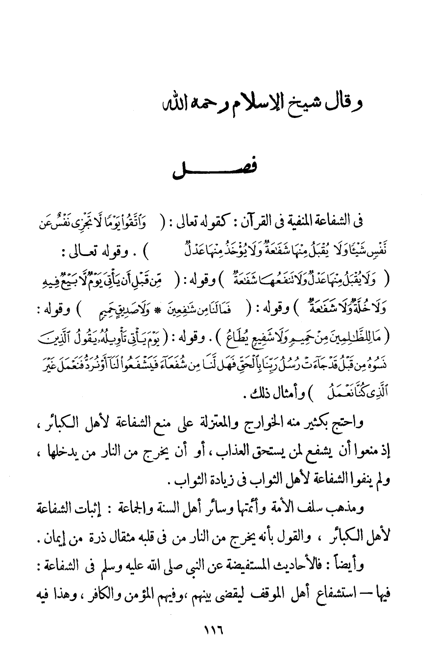 فِي الشَّفَاعَةِ الْمَنْفِيَّةِ فِي الْقُرْآنِ، كَقَوْلِهِ تَعَالَى: {وَاتَّقُوا يَوْمًا لَا تَجْزِي نَفْسٌ عَنْ نَفْسٍ شَيْئًا وَلَا يُقْبَلُ مِنْهَا شَفَاعَةٌ وَلَا يُؤْخَذُ مِنْهَا عَدْلٌ} . وقَوْله تَعَالَى {وَلَا يُقْبَلُ مِنْهَا عَدْلٌ وَلَا تَنْفَعُهَا شَفَاعَةٌ} وَقَوْلِهِ: {مِنْ قَبْلِ أَنْ يَأْتِيَ يَوْمٌ لَا بَيْعٌ فِيهِ وَلَا خُلَّةٌ وَلَا شَفَاعَةٌ} وَقَوْلِهِ: {فَمَا لَنَا مِنْ شَافِعِينَ} {وَلَا صَدِيقٍ حَمِيمٍ} وَقَوْلِهِ: {مَا لِلظَّالِمِينَ مِنْ حَمِيمٍ وَلَا شَفِيعٍ يُطَاعُ} . وَقَوْلِهِ: {يَوْمَ يَأْتِي تَأْوِيلُهُ يَقُولُ الَّذِينَ نَسُوهُ مِنْ قَبْلُ قَدْ جَاءَتْ رُسُلُ رَبِّنَا بِالْحَقِّ فَهَلْ لَنَا مِنْ شُفَعَاءَ فَيَشْفَعُوا لَنَا أَوْ نُرَدُّ فَنَعْمَلَ غَيْرَ الَّذِي كُنَّا نَعْمَلُ} وَأَمْثَالِ ذَلِكَ. وَاحْتَجَّ بِكَثِيرِ مِنْهُ الْخَوَارِجُ وَالْمُعْتَزِلَةُ عَلَى مَنْعِ الشَّفَاعَةِ لِأَهْلِ الْكَبَائِرِ إذْ مَنَعُوا أَنْ يَشْفَعَ لِمَنْ يَسْتَحِقُّ الْعَذَابَ أَوْ أَنْ يَخْرُجَ مِنْ النَّارِ مَنْ يَدْخُلُهَا وَلَمْ يَنْفُوا الشَّفَاعَةَ لِأَهْلِ الثَّوَابِ فِي زِيَادَةِ الثَّوَابِ. وَمَذْهَبُ سَلَفِ الْأُمَّةِ وَأَئِمَّتِهَا وَسَائِرِ أَهْلِ السُّنَّةِ وَالْجَمَاعَةِ: إثْبَاتُ الشَّفَاعَةِ لِأَهْلِ الْكَبَائِرِ وَالْقَوْلُ بِأَنَّهُ يَخْرُجُ مِنْ النَّارِ مَنْ فِي قَلْبِهِ مِثْقَالُ ذَرَّةٍ مِنْ إيمَانٍ. وَأَيْضًا: فَالْأَحَادِيثُ الْمُسْتَفِيضَةُ عَنْ النَّبِيِّ صَلَّى اللَّهُ عَلَيْهِ وَسَلَّمَ فِي الشَّفَاعَةِ: فِيهَا - اسْتِشْفَاعُ أَهْلِ الْمَوْقِفِ لِيُقْضَى بَيْنَهُمْ وَفِيهِمْ الْمُؤْمِنُ وَالْكَافِرُ وَهَذَا فِيهِ
