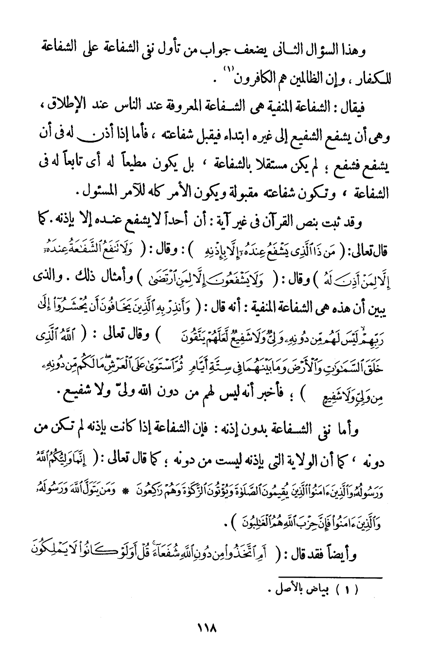 فَيُقَالُ: الشَّفَاعَةُ الْمَنْفِيَّةُ هِيَ الشَّفَاعَةُ الْمَعْرُوفَةُ عِنْدَ النَّاسِ عِنْدَ الْإِطْلَاقِ وَهِيَ أَنْ يَشْفَعَ الشَّفِيعُ إلَى غَيْرِهِ ابْتِدَاءً فَيَقْبَلُ شَفَاعَتَهُ فَأَمَّا إذَا أَذِنَ لَهُ فِي أَنْ يَشْفَعَ فَشَفَعَ؛ لَمْ يَكُنْ مُسْتَقِلًّا بِالشَّفَاعَةِ بَلْ يَكُونُ مُطِيعًا لَهُ أَيْ تَابِعًا لَهُ فِي الشَّفَاعَةِ وَتَكُونُ شَفَاعَتُهُ مَقْبُولَةً وَيَكُونُ الْأَمْرُ كُلُّهُ لِلْآمِرِ الْمَسْئُولِ. وَقَدْ ثَبَتَ بِنَصِّ الْقُرْآنِ فِي غَيْرِ آيَةٍ: أَنَّ أَحَدًا لَا يَشْفَعُ عِنْدَهُ إلَّا بِإِذْنِهِ. كَمَا قَالَ تَعَالَى: {مَنْ ذَا الَّذِي يَشْفَعُ عِنْدَهُ إلَّا بِإِذْنِهِ} وَقَالَ: {وَلَا تَنْفَعُ الشَّفَاعَةُ عِنْدَهُ إلَّا لِمَنْ أَذِنَ لَهُ} وَقَالَ: {وَلَا يَشْفَعُونَ إلَّا لِمَنِ ارْتَضَى} وَأَمْثَالِ ذَلِكَ. وَاَلَّذِي يُبَيِّنُ أَنَّ هَذِهِ هِيَ الشَّفَاعَةُ الْمَنْفِيَّةُ: أَنَّهُ قَالَ: {وَأَنْذِرْ بِهِ الَّذِينَ يَخَافُونَ أَنْ يُحْشَرُوا إلَى رَبِّهِمْ لَيْسَ لَهُمْ مِنْ دُونِهِ وَلِيٌّ وَلَا شَفِيعٌ لَعَلَّهُمْ يَتَّقُونَ} وَقَالَ تَعَالَى: {اللَّهُ الَّذِي خَلَقَ السَّمَاوَاتِ وَالْأَرْضَ وَمَا بَيْنَهُمَا فِي سِتَّةِ أَيَّامٍ ثُمَّ اسْتَوَى عَلَى الْعَرْشِ مَا لَكُمْ مِنْ دُونِهِ مِنْ وَلِيٍّ وَلَا شَفِيعٍ} فَأَخْبَرَ أَنَّهُ لَيْسَ لَهُمْ مِنْ دُونِ اللَّهِ وَلِيٌّ وَلَا شَفِيعٌ. وَأَمَّا نَفْيُ الشَّفَاعَةِ بِدُونِ إذْنِهِ: فَإِنَّ الشَّفَاعَةَ إذَا كَانَتْ بِإِذْنِهِ لَمْ تَكُنْ مِنْ دُونِهِ كَمَا أَنَّ الْوِلَايَةَ الَّتِي بِإِذْنِهِ لَيْسَتْ مِنْ دُونِهِ؛ كَمَا قَالَ تَعَالَى: {إنَّمَا وَلِيُّكُمُ اللَّهُ وَرَسُولُهُ وَالَّذِينَ آمَنُوا الَّذِينَ يُقِيمُونَ الصَّلَاةَ وَيُؤْتُونَ الزَّكَاةَ وَهُمْ رَاكِعُونَ وَمَنْ يَتَوَلَّ اللَّهَ وَرَسُولَهُ وَالَّذِينَ آمَنُوا فَإِنَّ حِزْبَ اللَّهِ هُمُ الْغَالِبُونَ} . وَأَيْضًا فَقَدْ قَالَ: {أَمِ اتَّخَذُوا مِنْ دُونِ اللَّهِ شُفَعَاءَ قُلْ أَوَلَوْ كَانُوا لَا يَمْلِكُونَ