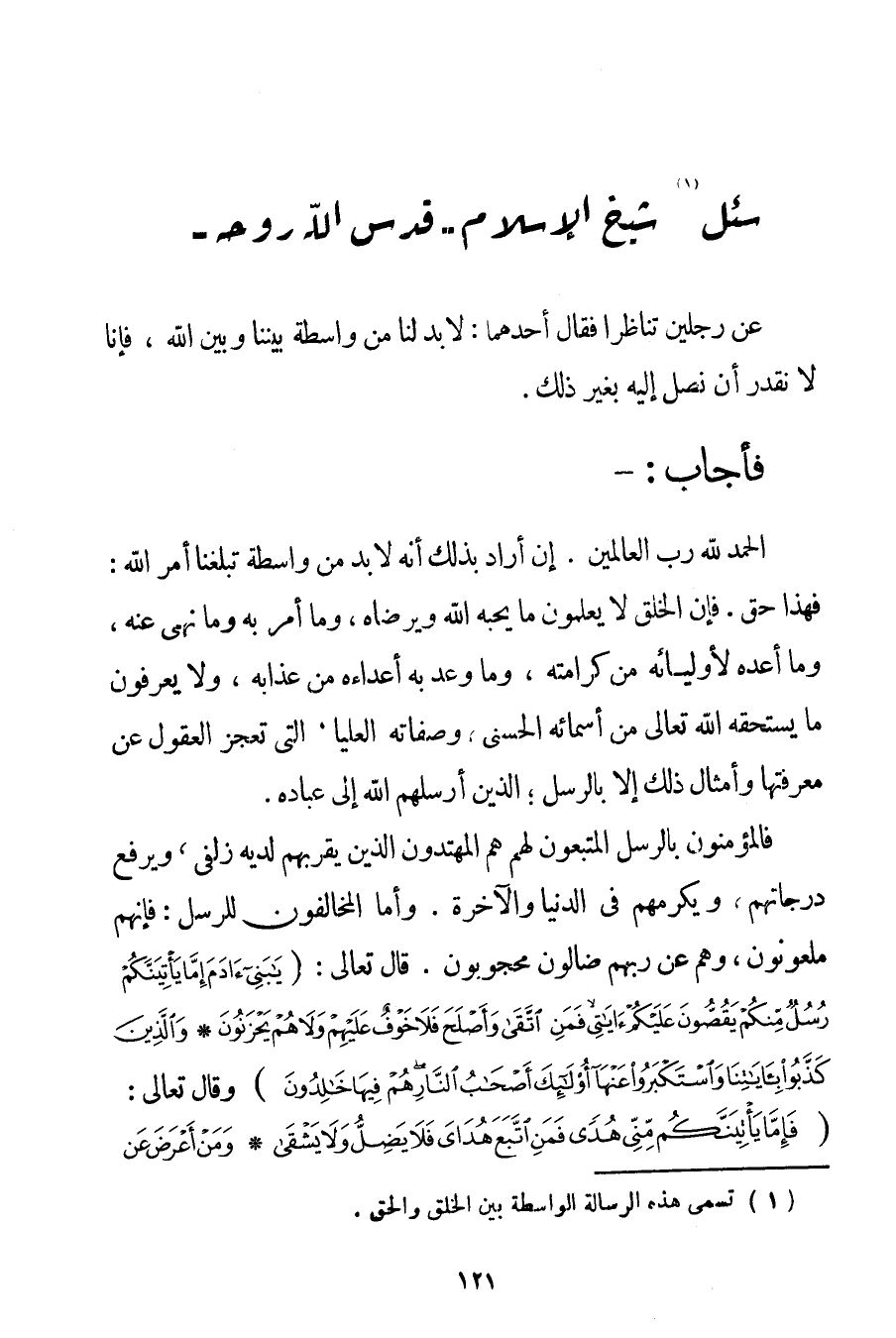 عَنْ رَجُلَيْنِ تَنَاظَرَا فَقَالَ أَحَدُهُمَا: لَا بُدَّ لَنَا مِنْ وَاسِطَةٍ بَيْنَنَا وَبَيْنَ اللَّهِ فَإِنَّا لَا نَقْدِرُ أَنْ نَصِلَ إلَيْهِ بِغَيْرِ ذَلِكَ.