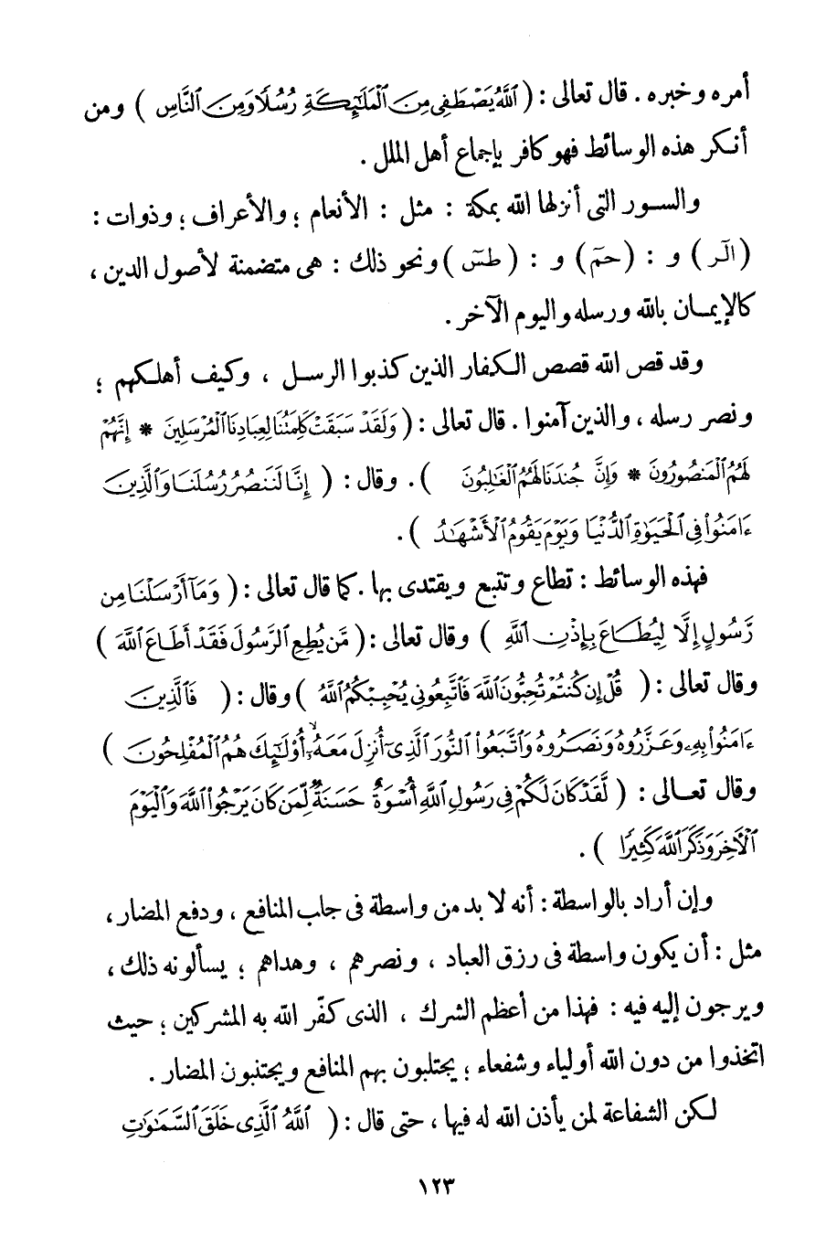 أَمْرَهُ وَخَبَرَهُ. قَالَ تَعَالَى: {اللَّهُ يَصْطَفِي مِنَ الْمَلَائِكَةِ رُسُلًا وَمِنَ النَّاسِ} وَمَنْ أَنْكَرَ هَذِهِ الْوَسَائِطَ فَهُوَ كَافِرٌ بِإِجْمَاعِ أَهْلِ الْمِلَلِ. وَالسُّوَرُ الَّتِي أَنْزَلَهَا اللَّهُ بِمَكَّةَ مِثْلُ: الْأَنْعَامِ؛ وَالْأَعْرَافِ؛ وَذَوَاتِ: (الر) و (حم) و (طس) وَنَحْوِ ذَلِكَ؛ هِيَ مُتَضَمِّنَةٌ لِأُصُولِ الدِّينِ كَالْإِيمَانِ بِاَللَّهِ وَرُسُلِهِ وَالْيَوْمِ الْآخِرِ. وَقَدْ قَصَّ اللَّهُ قِصَصَ الْكُفَّارِ الَّذِينَ كَذَّبُوا الرُّسُلَ وَكَيْفَ أَهْلَكَهُمْ؛ وَنَصَرَ رُسُلَهُ وَاَلَّذِينَ آمَنُوا. قَالَ تَعَالَى: {وَلَقَدْ سَبَقَتْ كَلِمَتُنَا لِعِبَادِنَا الْمُرْسَلِينَ} {إنَّهُمْ لَهُمُ الْمَنْصُورُونَ} {وَإِنَّ جُنْدَنَا لَهُمُ الْغَالِبُونَ} . وَقَالَ: {إنَّا لَنَنْصُرُ رُسُلَنَا وَالَّذِينَ آمَنُوا فِي الْحَيَاةِ الدُّنْيَا وَيَوْمَ يَقُومُ الْأَشْهَادُ} . فَهَذِهِ الْوَسَائِطُ: تُطَاعُ وَتُتَّبَعُ وَيُقْتَدَى بِهَا. كَمَا قَالَ تَعَالَى: {وَمَا أَرْسَلْنَا مِنْ رَسُولٍ إلَّا لِيُطَاعَ بِإِذْنِ اللَّهِ} وَقَالَ تَعَالَى: {مَنْ يُطِعِ الرَّسُولَ فَقَدْ أَطَاعَ اللَّهَ} وَقَالَ تَعَالَى: {قُلْ إنْ كُنْتُمْ تُحِبُّونَ اللَّهَ فَاتَّبِعُونِي يُحْبِبْكُمُ اللَّهُ} وَقَالَ: {فَالَّذِينَ آمَنُوا بِهِ وَعَزَّرُوهُ وَنَصَرُوهُ وَاتَّبَعُوا النُّورَ الَّذِي أُنْزِلَ مَعَهُ أُولَئِكَ هُمُ الْمُفْلِحُونَ} وَقَالَ تَعَالَى: {لَقَدْ كَانَ لَكُمْ فِي رَسُولِ اللَّهِ أُسْوَةٌ حَسَنَةٌ لِمَنْ كَانَ يَرْجُو اللَّهَ وَالْيَوْمَ الْآخِرَ وَذَكَرَ اللَّهَ كَثِيرًا} . وَإِنْ أَرَادَ بِالْوَاسِطَةِ: أَنَّهُ لَا بُدَّ مِنْ وَاسِطَةٍ فِي جَلْبِ الْمَنَافِعِ وَدَفْعِ الْمَضَارِّ مِثْلَ: أَنْ يَكُونَ وَاسِطَةً فِي رِزْقِ الْعِبَادِ وَنَصْرِهِمْ وَهُدَاهُمْ؛ يَسْأَلُونَهُ ذَلِكَ وَيَرْجُونَ إلَيْهِ فِيهِ: فَهَذَا مِنْ أَعْظَمِ الشِّرْكِ الَّذِي كَفَّرَ اللَّهُ بِهِ الْمُشْرِكِينَ؛ حَيْثُ اتَّخَذُوا مِنْ دُونِ اللَّهُ أَوْلِيَاءَ وَشُفَعَاءَ؛ يَجْتَلِبُونَ بِهِمْ الْمَنَافِعَ وَيَجْتَنِبُونَ الْمَضَارَّ. لَكِنَّ الشَّفَاعَةَ لِمَنْ يَأْذَنُ اللَّهُ لَهُ فِيهَا حَتَّى قَالَ: {اللَّهُ الَّذِي خَلَقَ السَّمَاوَاتِ
