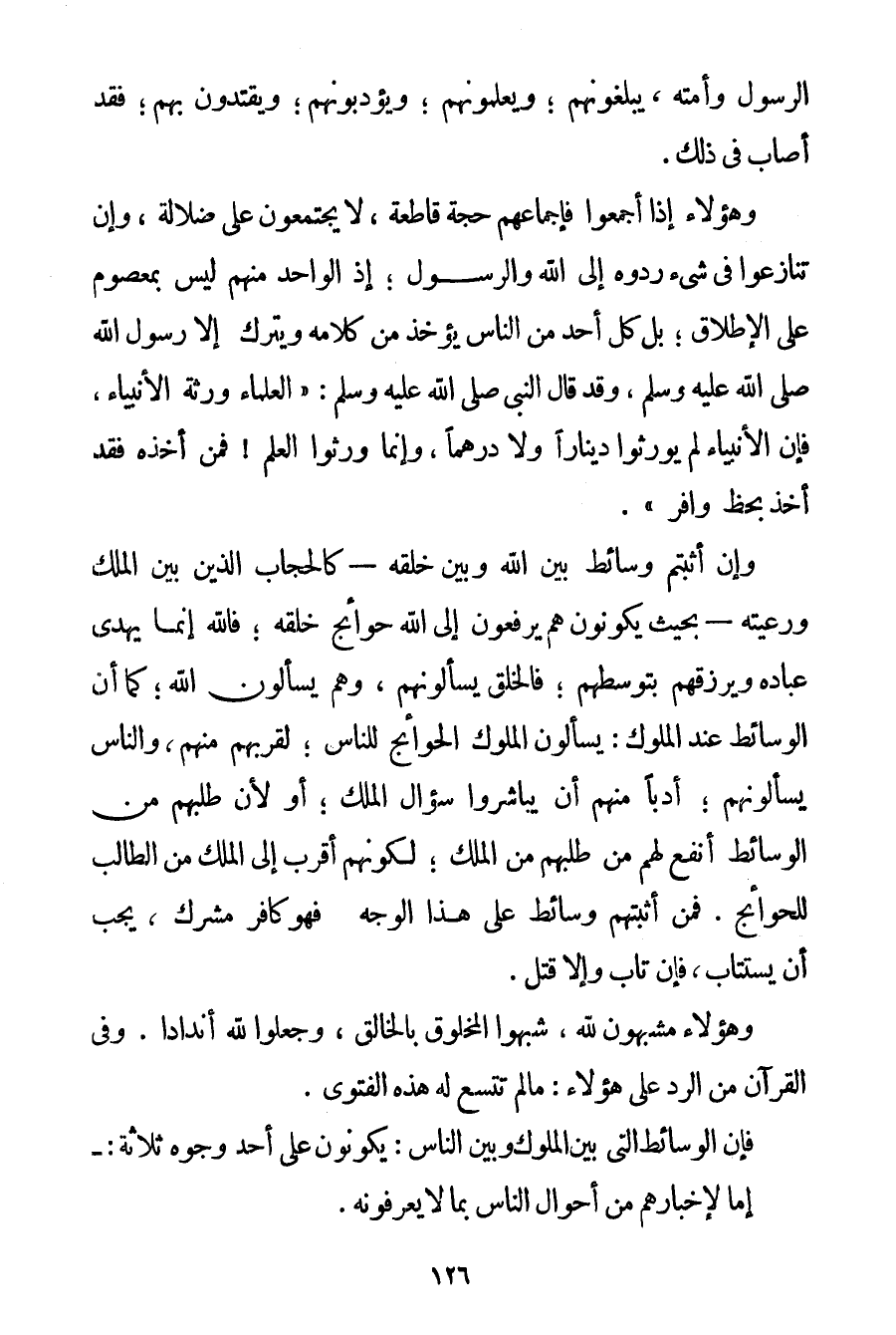 الرَّسُولِ وَأُمَّتِهِ يُبَلِّغُونَهُمْ؛ وَيُعَلِّمُونَهُمْ؛ وَيُؤَدِّبُونَهُمْ؛ وَيَقْتَدُونَ بِهِمْ؛ فَقَدْ أَصَابَ فِي ذَلِكَ. وَهَؤُلَاءِ إذَا أَجْمَعُوا فَإِجْمَاعُهُمْ حُجَّةٌ قَاطِعَةٌ لَا يَجْتَمِعُونَ عَلَى ضَلَالَةٍ وَإِنْ تَنَازَعُوا فِي شَيْءٍ رَدُّوهُ إلَى اللَّهِ وَالرَّسُولِ؛ إذْ الْوَاحِدُ مِنْهُمْ لَيْسَ بِمَعْصُومِ عَلَى الْإِطْلَاقِ؛ بَلْ كُلُّ أَحَدٍ مِنْ النَّاسِ يُؤْخَذُ مِنْ كَلَامِهِ وَيُتْرَكُ: إلَّا رَسُولُ اللَّهِ صَلَّى اللَّهُ عَلَيْهِ وَسَلَّمَ وَقَدْ قَالَ النَّبِيُّ صَلَّى اللَّهُ عَلَيْهِ وَسَلَّمَ {الْعُلَمَاءُ وَرَثَةُ الْأَنْبِيَاءِ فَإِنَّ الْأَنْبِيَاءَ لَمْ يُوَرِّثُوا دِينَارًا وَلَا دِرْهَمًا وَإِنَّمَا وَرَّثُوا الْعِلْمَ فَمَنْ أَخَذَهُ فَقَدْ أَخَذَ بِحَظِّ وَافِرٍ} . وَإِنْ أَثْبَتَهُمْ وَسَائِطَ بَيْنَ اللَّهِ وَبَيْنَ خَلْقِهِ - كَالْحُجَّابِ الَّذِينَ بَيْنَ الْمَلِكِ وَرَعِيَّتِهِ - بِحَيْثُ يَكُونُونَ هُمْ يَرْفَعُونَ إلَى اللَّهِ حَوَائِجَ خَلْقِهِ؛ فَاَللَّهُ إنَّمَا يَهْدِي عِبَادَهُ وَيَرْزُقُهُمْ بِتَوَسُّطِهِمْ؛ فَالْخَلْقُ يَسْأَلُونَهُمْ وَهُمْ يَسْأَلُونَ اللَّهَ؛ كَمَا أَنَّ الْوَسَائِطَ عِنْدَ الْمُلُوكِ: يَسْأَلُونَ الْمُلُوكَ الْحَوَائِجَ لِلنَّاسِ؛ لِقُرْبِهِمْ مِنْهُمْ وَالنَّاسُ يَسْأَلُونَهُمْ؛ أَدَبًا مِنْهُمْ أَنْ يُبَاشِرُوا سُؤَالَ الْمَلِكِ؛ أَوْ لِأَنَّ طَلَبَهُمْ مِنْ الْوَسَائِطِ أَنْفَعُ لَهُمْ مِنْ طَلَبِهِمْ مِنْ الْمَلِكِ؛ لِكَوْنِهِمْ أَقْرَبَ إلَى الْمَلِكِ مِنْ الطَّالِبِ لِلْحَوَائِجِ. فَمَنْ أَثْبَتَهُمْ وَسَائِطَ عَلَى هَذَا الْوَجْهِ: فَهُوَ كَافِرٌ مُشْرِكٌ يَجِبُ أَنْ يُسْتَتَابَ فَإِنْ تَابَ وَإِلَّا قُتِلَ. وَهَؤُلَاءِ مُشَبِّهُونَ لِلَّهِ شَبَّهُوا الْمَخْلُوقَ بِالْخَالِقِ وَجَعَلُوا لِلَّهِ أَنْدَادًا. وَفِي الْقُرْآنِ مِنْ الرَّدِّ عَلَى هَؤُلَاءِ: مَا لَمْ تَتَّسِعْ لَهُ هَذِهِ الْفَتْوَى. فَإِنَّ الْوَسَائِطَ الَّتِي بَيْنَ الْمُلُوكِ وَبَيْنَ النَّاسِ: يَكُونُونَ عَلَى أَحَدِ وُجُوهٍ ثَلَاثَةٍ: - إمَّا لِإِخْبَارِهِمْ مِنْ أَحْوَالِ النَّاسِ بِمَا لَا يَعْرِفُونَهُ.