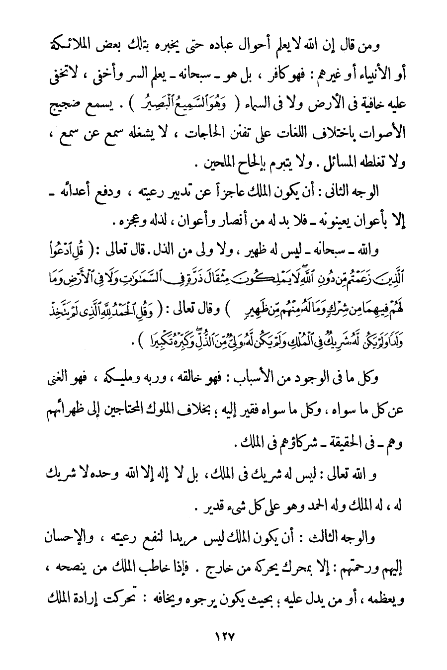 وَمَنْ قَالَ إنَّ اللَّهَ لَا يَعْلَمُ أَحْوَالَ عِبَادِهِ حَتَّى يُخْبِرَهُ بِتِلْكَ بَعْضُ الْمَلَائِكَةِ أَوْ الْأَنْبِيَاءُ أَوْ غَيْرُهُمْ: فَهُوَ كَافِرٌ بَلْ هُوَ - سُبْحَانَهُ - يَعْلَمُ السِّرَّ وَأَخْفَى لَا تَخْفَى عَلَيْهِ خَافِيَةٌ فِي الْأَرْضِ وَلَا فِي السَّمَاءِ {وَهُوَ السَّمِيعُ الْبَصِيرُ} . يَسْمَعُ ضَجِيجَ الْأَصْوَاتِ بِاخْتِلَافِ اللُّغَاتِ عَلَى تَفَنُّنِ الْحَاجَاتِ لَا يَشْغَلُهُ سَمْعٌ عَنْ سَمْعٍ وَلَا تُغَلِّطُهُ الْمَسَائِلُ. وَلَا يَتَبَرَّمُ بِإِلْحَاحِ الْمُلِحِّينَ. الْوَجْهُ الثَّانِي: أَنْ يَكُونَ الْمَلِكُ عَاجِزًا عَنْ تَدْبِيرِ رَعِيَّتِهِ وَدَفْعِ أَعْدَائِهِ - إلَّا بِأَعْوَانِ يُعِينُونَهُ - فَلَا بُدَّ لَهُ مِنْ أَنْصَارٍ وَأَعْوَانٍ لِذُلِّهِ وَعَجْزِهِ. وَاَللَّهُ - سُبْحَانَهُ - لَيْسَ لَهُ ظَهِيرٌ وَلَا وَلِيٌّ مِنْ الذُّلِّ. قَالَ تَعَالَى: {قُلِ ادْعُوا الَّذِينَ زَعَمْتُمْ مِنْ دُونِ اللَّهِ لَا يَمْلِكُونَ مِثْقَالَ ذَرَّةٍ فِي السَّمَاوَاتِ وَلَا فِي الْأَرْضِ وَمَا لَهُمْ فِيهِمَا مِنْ شِرْكٍ وَمَا لَهُ مِنْهُمْ مِنْ ظَهِيرٍ} وَقَالَ تَعَالَى: {وَقُلِ الْحَمْدُ لِلَّهِ الَّذِي لَمْ يَتَّخِذْ وَلَدًا وَلَمْ يَكُنْ لَهُ شَرِيكٌ فِي الْمُلْكِ وَلَمْ يَكُنْ لَهُ وَلِيٌّ مِنَ الذُّلِّ وَكَبِّرْهُ تَكْبِيرًا} . وَكُلُّ مَا فِي الْوُجُودِ مِنْ الْأَسْبَابِ: فَهُوَ خَالِقُهُ وَرَبُّهُ وَمَلِيكُهُ فَهُوَ الْغَنِيُّ عَنْ كُلِّ مَا سِوَاهُ وَكُلُّ مَا سِوَاهُ فَقِيرٌ إلَيْهِ؛ بِخِلَافِ الْمُلُوكِ الْمُحْتَاجِينَ إلَى ظهرائهم وَهُمْ - فِي الْحَقِيقَةِ - شُرَكَاؤُهُمْ فِي الْمُلْكِ. وَاَللَّهُ تَعَالَى: لَيْسَ لَهُ شَرِيكٌ فِي الْمُلْكِ بَلْ لَا إلَهَ إلَّا اللَّهُ وَحْدَهُ لَا شَرِيكَ لَهُ لَهُ الْمُلْكُ وَلَهُ الْحَمْدُ وَهُوَ عَلَى كُلِّ شَيْءٍ قَدِيرٌ. وَالْوَجْهُ الثَّالِثُ: أَنْ يَكُونَ الْمَلِكُ لَيْسَ مُرِيدًا لِنَفْعِ رَعِيَّتِهِ وَالْإِحْسَانِ إلَيْهِمْ وَرَحْمَتِهِمْ: إلَّا بِمُحَرِّكِ يُحَرِّكُهُ مِنْ خَارِجٍ. فَإِذَا خَاطَبَ الْمَلِكُ مَنْ يَنْصَحُهُ وَيُعَظِّمُهُ أَوْ مَنْ يَدُلُّ عَلَيْهِ؛ بِحَيْثُ يَكُونُ يَرْجُوهُ وَيَخَافُهُ: تَحَرَّكَتْ إرَادَةُ الْمَلِكِ