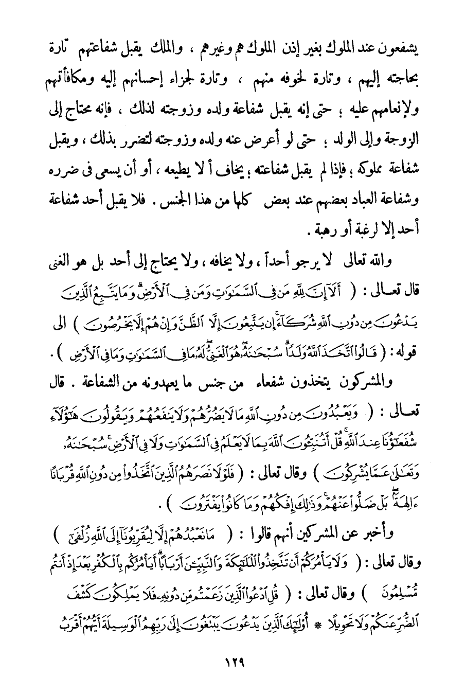 يُشَفَّعُونَ عِنْدَ الْمُلُوكِ بِغَيْرِ إذْنِ الْمُلُوكِ هُمْ وَغَيْرُهُمْ وَالْمَلِكُ يَقْبَلُ شَفَاعَتَهُمْ: تَارَةً بِحَاجَتِهِ إلَيْهِمْ وَتَارَةً لِخَوْفِهِ مِنْهُمْ وَتَارَةً لِجَزَاءِ إحْسَانِهِمْ إلَيْهِ وَمُكَافَأَتِهِمْ وَلِإِنْعَامِهِمْ عَلَيْهِ؛ حَتَّى إنَّهُ يَقْبَلُ شَفَاعَةَ وَلَدِهِ وَزَوْجَتِهِ لِذَلِكَ فَإِنَّهُ مُحْتَاجٌ إلَى الزَّوْجَةِ وَإِلَى الْوَلَدِ؛ حَتَّى لَوْ أَعْرَضَ عَنْهُ وَلَدُهُ وَزَوْجَتُهُ لَتَضَرَّرَ بِذَلِكَ وَيَقْبَلُ شَفَاعَةَ مَمْلُوكِهِ؛ فَإِذَا لَمْ يَقْبَلْ شَفَاعَتَهُ؛ يَخَافُ أَنْ لَا يُطِيعُهُ أَوْ أَنْ يَسْعَى فِي ضَرَرِهِ. وَشَفَاعَةُ الْعِبَادِ بَعْضِهِمْ عِنْدَ بَعْضٍ: كُلُّهَا مِنْ هَذَا الْجِنْسِ. فَلَا يَقْبَلُ أَحَدٌ شَفَاعَةَ أَحَدٍ إلَّا لِرَغْبَةِ أَوْ رَهْبَةٍ. وَاَللَّهُ تَعَالَى: لَا يَرْجُو أَحَدًا وَلَا يَخَافُهُ وَلَا يَحْتَاجُ إلَى أَحَدٍ بَلْ هُوَ الْغَنِيُّ قَالَ تَعَالَى: {أَلَا إنَّ لِلَّهِ مَنْ فِي السَّمَاوَاتِ وَمَنْ فِي الْأَرْضِ وَمَا يَتَّبِعُ الَّذِينَ يَدْعُونَ مِنْ دُونِ اللَّهِ شُرَكَاءَ إنْ يَتَّبِعُونَ إلَّا الظَّنَّ وَإِنْ هُمْ إلَّا يَخْرُصُونَ} إلَى قَوْلِهِ: {قَالُوا اتَّخَذَ اللَّهُ وَلَدًا سُبْحَانَهُ هُوَ الْغَنِيُّ لَهُ مَا فِي السَّمَاوَاتِ وَمَا فِي الْأَرْضِ} . وَالْمُشْرِكُونَ: يَتَّخِذُونَ شُفَعَاءَ مِنْ جِنْسِ مَا يَعْهَدُونَهُ مِنْ الشَّفَاعَةِ. قَالَ تَعَالَى: {وَيَعْبُدُونَ مِنْ دُونِ اللَّهِ مَا لَا يَضُرُّهُمْ وَلَا يَنْفَعُهُمْ وَيَقُولُونَ هَؤُلَاءِ شُفَعَاؤُنَا عِنْدَ اللَّهِ قُلْ أَتُنَبِّئُونَ اللَّهَ بِمَا لَا يَعْلَمُ فِي السَّمَاوَاتِ وَلَا فِي الْأَرْضِ سُبْحَانَهُ وَتَعَالَى عَمَّا يُشْرِكُونَ} وَقَالَ تَعَالَى: {فَلَوْلَا نَصَرَهُمُ الَّذِينَ اتَّخَذُوا مِنْ دُونِ اللَّهِ قُرْبَانًا آلِهَةً بَلْ ضَلُّوا عَنْهُمْ وَذَلِكَ إفْكُهُمْ وَمَا كَانُوا يَفْتَرُونَ} . وَأَخْبَرَ عَنْ الْمُشْرِكِينَ أَنَّهُمْ قَالُوا ": {مَا نَعْبُدُهُمْ إلَّا لِيُقَرِّبُونَا إلَى اللَّهِ زُلْفَى} وَقَالَ تَعَالَى: {وَلَا يَأْمُرَكُمْ أَنْ تَتَّخِذُوا الْمَلَائِكَةَ وَالنَّبِيِّينَ أَرْبَابًا أَيَأْمُرُكُمْ بِالْكُفْرِ بَعْدَ إذْ أَنْتُمْ مُسْلِمُونَ} وَقَالَ تَعَالَى: {قُلِ ادْعُوا الَّذِينَ زَعَمْتُمْ مِنْ دُونِهِ فَلَا يَمْلِكُونَ كَشْفَ الضُّرِّ عَنْكُمْ وَلَا تَحْوِيلًا} {أُولَئِكَ الَّذِينَ يَدْعُونَ يَبْتَغُونَ إلَى رَبِّهِمُ الْوَسِيلَةَ