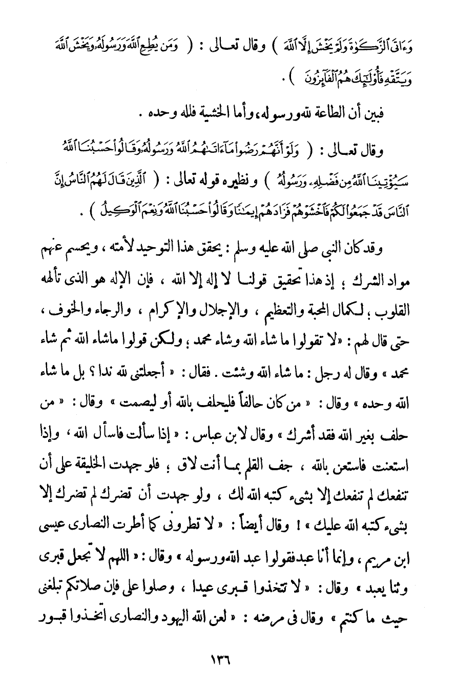 وَآتَى الزَّكَاةَ وَلَمْ يَخْشَ إلَّا اللَّهَ} وَقَالَ تَعَالَى: {وَمَنْ يُطِعِ اللَّهَ وَرَسُولَهُ وَيَخْشَ اللَّهَ وَيَتَّقْهِ فَأُولَئِكَ هُمُ الْفَائِزُونَ} . فَبَيَّنَ أَنَّ الطَّاعَةَ لِلَّهِ وَرَسُولِهِ وَأَمَّا الْخَشْيَةُ فَلِلَّهِ وَحْدَهُ. وَقَالَ تَعَالَى: {وَلَوْ أَنَّهُمْ رَضُوا مَا آتَاهُمُ اللَّهُ وَرَسُولُهُ وَقَالُوا حَسْبُنَا اللَّهُ سَيُؤْتِينَا اللَّهُ مِنْ فَضْلِهِ وَرَسُولُهُ} وَنَظِيرُهُ قَوْله تَعَالَى {الَّذِينَ قَالَ لَهُمُ النَّاسُ إنَّ النَّاسَ قَدْ جَمَعُوا لَكُمْ فَاخْشَوْهُمْ فَزَادَهُمْ إيمَانًا وَقَالُوا حَسْبُنَا اللَّهُ وَنِعْمَ الْوَكِيلُ} . وَقَدْ كَانَ النَّبِيُّ صَلَّى اللَّهُ عَلَيْهِ وَسَلَّمَ يُحَقِّقُ هَذَا التَّوْحِيدَ لِأُمَّتِهِ وَيَحْسِمُ عَنْهُمْ مَوَادَّ الشِّرْكِ؛ إذْ هَذَا تَحْقِيقُ قَوْلِنَا لَا إلَهَ إلَّا اللَّهُ فَإِنَّ الْإِلَهَ هُوَ الَّذِي تَأْلَهُهُ الْقُلُوبُ؛ لِكَمَالِ الْمَحَبَّةِ وَالتَّعْظِيمِ وَالْإِجْلَالِ وَالْإِكْرَامِ وَالرَّجَاءِ وَالْخَوْفِ حَتَّى قَالَ لَهُمْ: {لَا تَقُولُوا مَا شَاءَ اللَّهُ وَشَاءَ مُحَمَّدٌ؛ وَلَكِنْ قُولُوا مَا شَاءَ اللَّهُ ثُمَّ شَاءَ مُحَمَّدٌ} {وَقَالَ لَهُ رَجُلٌ: مَا شَاءَ اللَّهُ وَشِئْت. فَقَالَ: أَجَعَلْتَنِي لِلَّهِ نِدًّا؟ بَلْ مَا شَاءَ اللَّهُ وَحْدَهُ} وَقَالَ: {مَنْ كَانَ حَالِفًا فَلْيَحْلِفْ بِاَللَّهِ أَوْ لِيَصْمُتْ} وَقَالَ: {مَنْ حَلَفَ بِغَيْرِ اللَّهِ فَقَدْ أَشْرَكَ} وَقَالَ لِابْنِ عَبَّاسٍ: {إذَا سَأَلْت فَاسْأَلْ اللَّهَ وَإِذَا اسْتَعَنْت فَاسْتَعِنْ بِاَللَّهِ جَفَّ الْقَلَمُ بِمَا أَنْتَ لَاقٍ؛ فَلَوْ جَهَدَتْ الْخَلِيقَةُ عَلَى أَنْ تَنْفَعَك لَمْ تَنْفَعْك إلَّا بِشَيْءِ كَتَبَهُ اللَّهُ لَك وَلَوْ جَهَدَتْ أَنْ تَضُرَّك لَمْ تَضُرَّك إلَّا بِشَيْءِ كَتَبَهُ اللَّهُ عَلَيْك} وَقَالَ أَيْضًا: {لَا تُطْرُونِي كَمَا أَطْرَتْ النَّصَارَى عِيسَى ابْنَ مَرْيَمَ وَإِنَّمَا أَنَا عَبْدٌ فَقُولُوا عَبْدُ اللَّهِ وَرَسُولُهُ} وَقَالَ: {اللَّهُمَّ لَا تَجْعَلْ قَبْرِي وَثَنًا يُعْبَدُ} وَقَالَ: {لَا تَتَّخِذُوا قَبْرِي عِيدًا وَصَلُّوا عَلَيَّ فَإِنَّ صَلَاتَكُمْ تَبْلُغُنِي حَيْثُ مَا كُنْتُمْ} وَقَالَ فِي مَرَضِهِ: {لَعَنَ اللَّهُ الْيَهُودَ وَالنَّصَارَى اتَّخَذُوا قُبُورَ