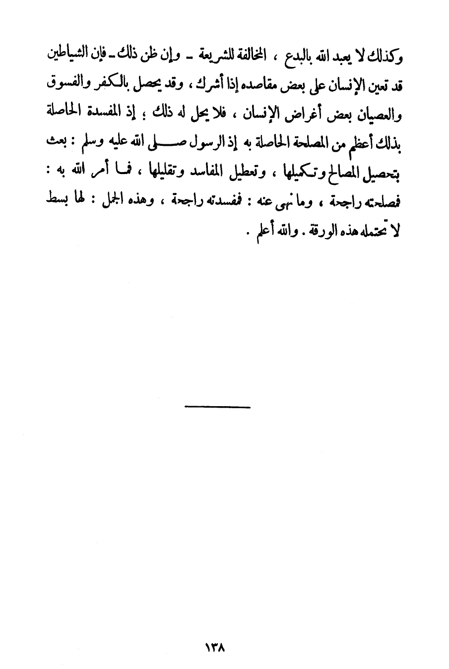 وَكَذَلِكَ لَا يَعْبُدُ اللَّهَ بِالْبِدَعِ الْمُخَالَفَةِ لِلشَّرِيعَةِ - وَإِنْ ظَنَّ ذَلِكَ - فَإِنَّ الشَّيَاطِينَ قَدْ تُعِينُ الْإِنْسَانَ عَلَى بَعْضِ مَقَاصِدِهِ إذَا أَشْرَكَ وَقَدْ يَحْصُلُ بِالْكُفْرِ وَالْفُسُوقِ وَالْعِصْيَانِ بَعْضُ أَغْرَاضِ الْإِنْسَانِ فَلَا يَحِلُّ لَهُ ذَلِكَ إذْ الْمَفْسَدَةُ الْحَاصِلَةُ بِذَلِكَ أَعْظَمُ مِنْ الْمَصْلَحَةِ الْحَاصِلَةِ بِهِ إذْ الرَّسُولُ صَلَّى اللَّهُ عَلَيْهِ وَسَلَّمَ بُعِثَ بِتَحْصِيلِ الْمَصَالِحِ وَتَكْمِيلِهَا وَتَعْطِيلِ الْمَفَاسِدِ وَتَقْلِيلِهَا فَمَا أَمَرَ اللَّهُ بِهِ: فَمَصْلَحَتُهُ رَاجِحَةٌ وَمَا نَهَى عَنْهُ: فَمَفْسَدَتُهُ رَاجِحَةٌ وَهَذِهِ الْجُمَلُ: لَهَا بَسْطٌ لَا تَحْتَمِلُهُ هَذِهِ الْوَرَقَةُ. وَاَللَّهُ أَعْلَمُ.