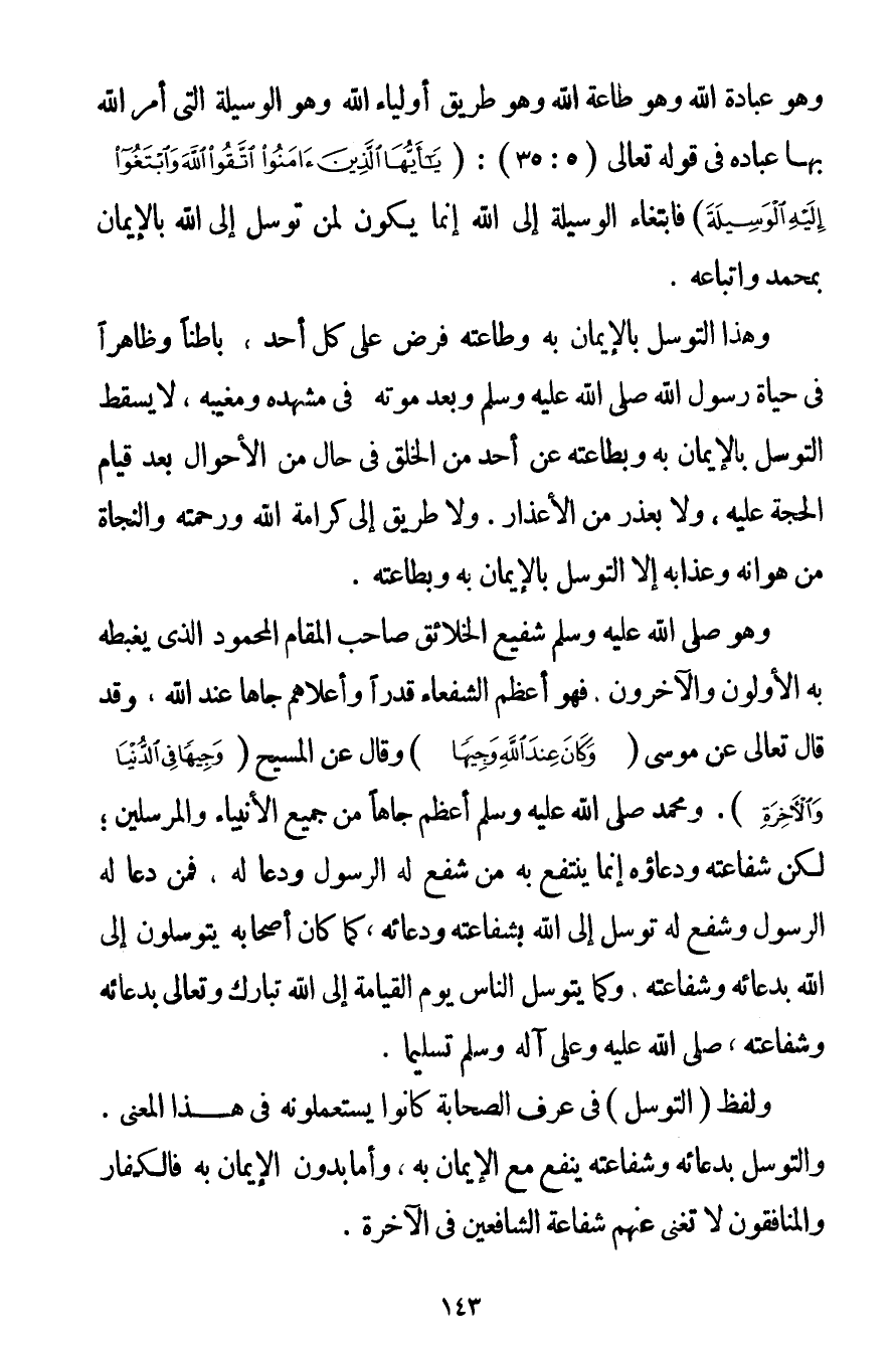 وَهُوَ عِبَادَةُ اللَّهِ وَهُوَ طَاعَةُ اللَّهِ وَهُوَ طَرِيقُ أَوْلِيَاءِ اللَّهِ وَهُوَ الْوَسِيلَةُ الَّتِي أَمَرَ اللَّهُ بِهَا عِبَادَهُ فِي قَوْله تَعَالَى {يَا أَيُّهَا الَّذِينَ آمَنُوا اتَّقُوا اللَّهَ وَابْتَغُوا إلَيْهِ الْوَسِيلَةَ} فَابْتِغَاءُ الْوَسِيلَةِ إلَى اللَّهِ إنَّمَا يَكُونُ لِمَنْ تَوَسَّلَ إلَى اللَّهِ بِالْإِيمَانِ بِمُحَمَّدِ وَاتِّبَاعِهِ. وَهَذَا التَّوَسُّلُ بِالْإِيمَانِ بِهِ وَطَاعَتِهِ فَرْضٌ عَلَى كُلِّ أَحَدٍ بَاطِنًا وَظَاهِرًا فِي حَيَاةِ رَسُولِ اللَّهِ صَلَّى اللَّهُ عَلَيْهِ وَسَلَّمَ وَبَعْدَ مَوْتِهِ فِي مَشْهَدِهِ وَمَغِيبِهِ لَا يُسْقِطُ التَّوَسُّلَ بِالْإِيمَانِ بِهِ وَبِطَاعَتِهِ عَنْ أَحَدٍ مِنْ الْخَلْقِ فِي حَالٍ مِنْ الْأَحْوَالِ بَعْدَ قِيَامِ الْحُجَّةِ عَلَيْهِ وَلَا بِعُذْرِ مِنْ الْأَعْذَارِ. وَلَا طَرِيقَ إلَى كَرَامَةِ اللَّهِ وَرَحْمَتِهِ وَالنَّجَاةِ مِنْ هَوَانِهِ وَعَذَابِهِ إلَّا التَّوَسُّلُ بِالْإِيمَانِ بِهِ وَبِطَاعَتِهِ. وَهُوَ صَلَّى اللَّهُ عَلَيْهِ وَسَلَّمَ شَفِيعُ الْخَلَائِقِ صَاحِبُ الْمَقَامِ الْمَحْمُودِ الَّذِي يَغْبِطُهُ بِهِ الْأَوَّلُونَ والآخرون فَهُوَ أَعْظَمُ الشُّفَعَاءِ قَدْرًا وَأَعْلَاهُمْ جَاهًا عِنْدَ اللَّهِ وَقَدْ قَالَ تَعَالَى عَنْ مُوسَى {وَكَانَ عِنْدَ اللَّهِ وَجِيهًا} وَقَالَ عَنْ الْمَسِيحِ {وَجِيهًا فِي الدُّنْيَا وَالْآخِرَةِ} . وَمُحَمَّدٌ صَلَّى اللَّهُ عَلَيْهِ وَسَلَّمَ أَعْظَمُ جَاهًا مِنْ جَمِيعِ الْأَنْبِيَاءِ وَالْمُرْسَلِينَ؛ لَكِنْ شَفَاعَتُهُ وَدُعَاؤُهُ إنَّمَا يَنْتَفِعُ بِهِ مَنْ شَفَعَ لَهُ الرَّسُولُ وَدَعَا لَهُ فَمَنْ دَعَا لَهُ الرَّسُولُ وَشَفَعَ لَهُ تَوَسَّلَ إلَى اللَّهِ بِشَفَاعَتِهِ وَدُعَائِهِ كَمَا كَانَ أَصْحَابُهُ يَتَوَسَّلُونَ إلَى اللَّهِ بِدُعَائِهِ وَشَفَاعَتِهِ وَكَمَا يَتَوَسَّلُ النَّاسُ يَوْمَ الْقِيَامَةِ إلَى اللَّهِ تَبَارَكَ وَتَعَالَى بِدُعَائِهِ وَشَفَاعَتِهِ صَلَّى اللَّهُ عَلَيْهِ وَعَلَى آلِهِ وَسَلَّمَ تَسْلِيمًا.
