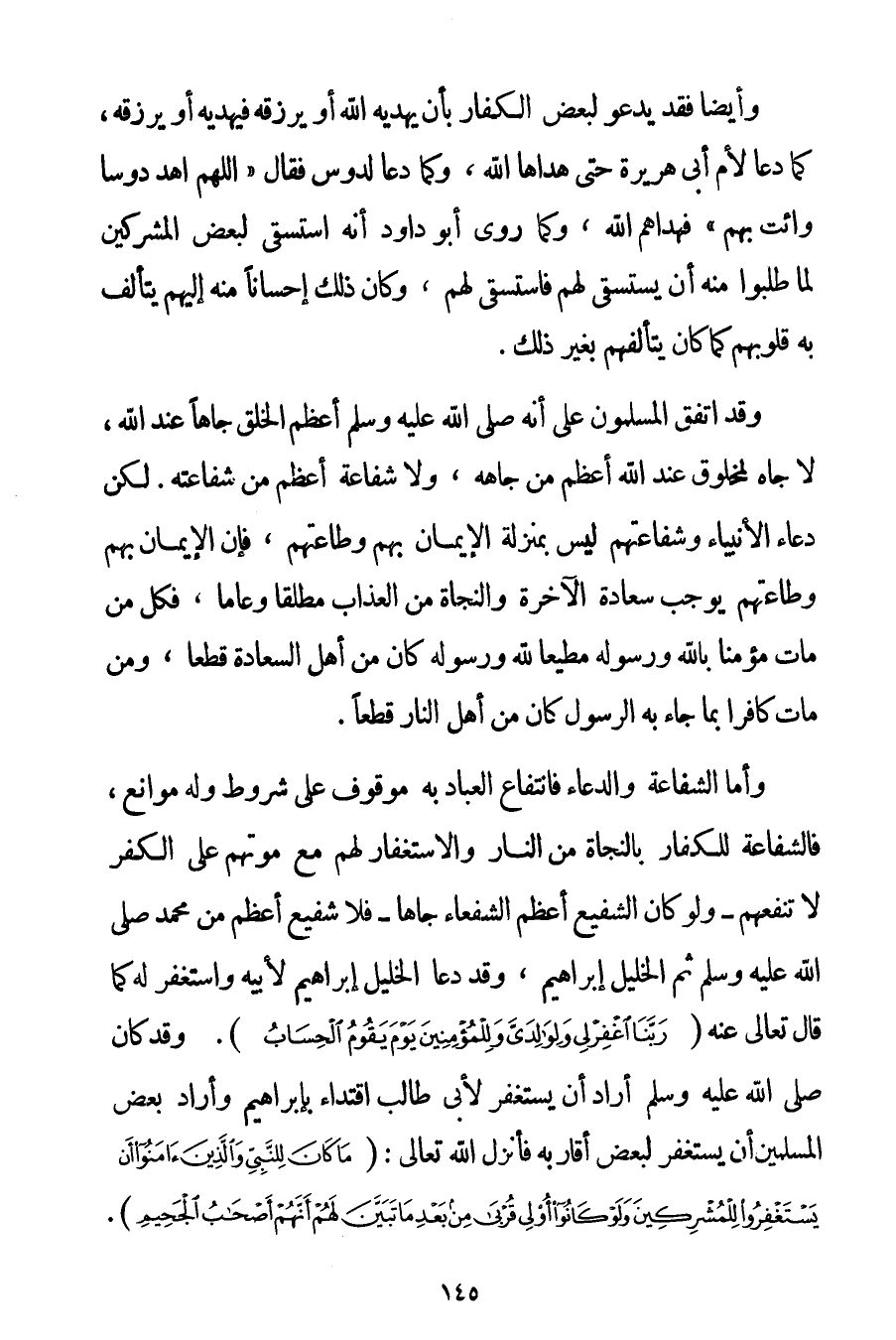 وَأَمَّا الشَّفَاعَةُ وَالدُّعَاءُ فَانْتِفَاعُ الْعِبَادِ بِهِ مَوْقُوفٌ عَلَى شُرُوطٍ وَلَهُ مَوَانِعُ فَالشَّفَاعَةُ لِلْكُفَّارِ بِالنَّجَاةِ مِنْ النَّارِ وَالِاسْتِغْفَارِ لَهُمْ مَعَ مَوْتِهِمْ عَلَى الْكُفْرِ لَا تَنْفَعُهُمْ - وَلَوْ كَانَ الشَّفِيعُ أَعْظَمَ الشُّفَعَاءِ جَاهًا - فَلَا شَفِيعَ أَعْظَمُ مِنْ مُحَمَّدٍ صَلَّى اللَّهُ عَلَيْهِ وَسَلَّمَ ثُمَّ الْخَلِيلُ إبْرَاهِيمُ وَقَدْ دَعَا الْخَلِيلُ إبْرَاهِيمُ لِأَبِيهِ وَاسْتَغْفَرَ لَهُ كَمَا قَالَ تَعَالَى عَنْهُ {رَبَّنَا اغْفِرْ لِي وَلِوَالِدَيَّ وَلِلْمُؤْمِنِينَ يَوْمَ يَقُومُ الْحِسَابُ} . وَقَدْ كَانَ صَلَّى اللَّهُ عَلَيْهِ وَسَلَّمَ أَرَادَ أَنْ يَسْتَغْفِرَ لِأَبِي طَالِبٍ اقْتِدَاءً بِإِبْرَاهِيمَ وَأَرَادَ بَعْضُ الْمُسْلِمِينَ أَنْ يَسْتَغْفِرَ لِبَعْضِ أَقَارِبِهِ فَأَنْزَلَ اللَّهُ تَعَالَى: {مَا كَانَ لِلنَّبِيِّ وَالَّذِينَ آمَنُوا أَنْ يَسْتَغْفِرُوا لِلْمُشْرِكِينَ وَلَوْ كَانُوا أُولِي قُرْبَى مِنْ بَعْدِ مَا تَبَيَّنَ لَهُمْ أَنَّهُمْ أَصْحَابُ الْجَحِيمِ} .