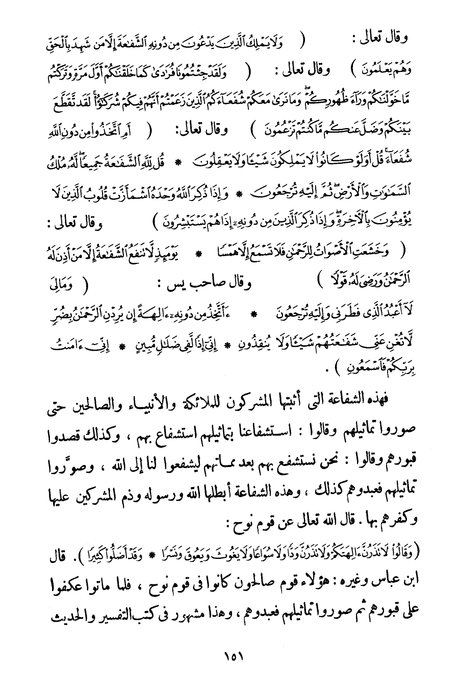وَقَالَ تَعَالَى: {وَلَا يَمْلِكُ الَّذِينَ يَدْعُونَ مِنْ دُونِهِ الشَّفَاعَةَ إلَّا مَنْ شَهِدَ بِالْحَقِّ وَهُمْ يَعْلَمُونَ} وَقَالَ تَعَالَى: {وَلَقَدْ جِئْتُمُونَا فُرَادَى كَمَا خَلَقْنَاكُمْ أَوَّلَ مَرَّةٍ وَتَرَكْتُمْ مَا خَوَّلْنَاكُمْ وَرَاءَ ظُهُورِكُمْ وَمَا نَرَى مَعَكُمْ شُفَعَاءَكُمُ الَّذِينَ زَعَمْتُمْ أَنَّهُمْ فِيكُمْ شُرَكَاءُ لَقَدْ تَقَطَّعَ بَيْنَكُمْ وَضَلَّ عَنْكُمْ مَا كُنْتُمْ تَزْعُمُونَ} وَقَالَ تَعَالَى: {أَمِ اتَّخَذُوا مِنْ دُونِ اللَّهِ شُفَعَاءَ قُلْ أَوَلَوْ كَانُوا لَا يَمْلِكُونَ شَيْئًا وَلَا يَعْقِلُونَ} {قُلْ لِلَّهِ الشَّفَاعَةُ جَمِيعًا لَهُ مُلْكُ السَّمَاوَاتِ وَالْأَرْضِ ثُمَّ إلَيْهِ تُرْجَعُونَ} {وَإِذَا ذُكِرَ اللَّهُ وَحْدَهُ اشْمَأَزَّتْ قُلُوبُ الَّذِينَ لَا يُؤْمِنُونَ بِالْآخِرَةِ وَإِذَا ذُكِرَ الَّذِينَ مِنْ دُونِهِ إذَا هُمْ يَسْتَبْشِرُونَ} وَقَالَ تَعَالَى: {وَخَشَعَتِ الْأَصْوَاتُ لِلرَّحْمَنِ فَلَا تَسْمَعُ إلَّا هَمْسًا} {يَوْمَئِذٍ لَا تَنْفَعُ الشَّفَاعَةُ إلَّا مَنْ أَذِنَ لَهُ الرَّحْمَنُ وَرَضِيَ لَهُ قَوْلًا} وَقَالَ صَاحِبُ يس: {وَمَا لِيَ لَا أَعْبُدُ الَّذِي فَطَرَنِي وَإِلَيْهِ تُرْجَعُونَ} {أَأَتَّخِذُ مِنْ دُونِهِ آلِهَةً إنْ يُرِدْنِ الرَّحْمَنُ بِضُرٍّ لَا تُغْنِ عَنِّي شَفَاعَتُهُمْ شَيْئًا وَلَا يُنْقِذُونِ} {إنِّي إذًا لَفِي ضَلَالٍ مُبِينٍ} {إنِّي آمَنْتُ بِرَبِّكُمْ فَاسْمَعُونِ} . فَهَذِهِ الشَّفَاعَةُ الَّتِي أَثْبَتَهَا الْمُشْرِكُونَ لِلْمَلَائِكَةِ وَالْأَنْبِيَاءِ وَالصَّالِحِينَ حَتَّى صَوَّرُوا تَمَاثِيلَهُمْ وَقَالُوا: اسْتِشْفَاعُنَا بِتَمَاثِيلِهِمْ اسْتِشْفَاعٌ بِهِمْ وَكَذَلِكَ قَصَدُوا قُبُورَهُمْ وَقَالُوا: نَحْنُ نَسْتَشْفِعُ بِهِمْ بَعْدَ مَمَاتِهِمْ لِيَشْفَعُوا لَنَا إلَى اللَّهِ وَصَوَّرُوا تَمَاثِيلَهُمْ فَعَبَدُوهُمْ كَذَلِكَ وَهَذِهِ الشَّفَاعَةُ أَبْطَلَهَا اللَّهُ وَرَسُولُهُ وَذَمَّ الْمُشْرِكِينَ عَلَيْهَا وَكَفَّرَهُمْ بِهَا. قَالَ اللَّهُ تَعَالَى عَنْ قَوْمِ نُوحٍ: {وَقَالُوا لَا تَذَرُنَّ آلِهَتَكُمْ وَلَا تَذَرُنَّ وَدًّا وَلَا سُوَاعًا وَلَا يَغُوثَ وَيَعُوقَ وَنَسْرًا} {وَقَدْ أَضَلُّوا كَثِيرًا} . قَالَ ابْنُ عَبَّاسٍ وَغَيْرُهُ: هَؤُلَاءِ قَوْمٌ صَالِحُونَ كَانُوا فِي قَوْمِ نُوحٍ فَلَمَّا مَاتُوا عَكَفُوا عَلَى قُبُورِهِمْ ثُمَّ صَوَّرُوا تَمَاثِيلَهُمْ فَعَبَدُوهُمْ وَهَذَا مَشْهُورٌ فِي كُتُبِ التَّفْسِيرِ وَالْحَدِيثِ