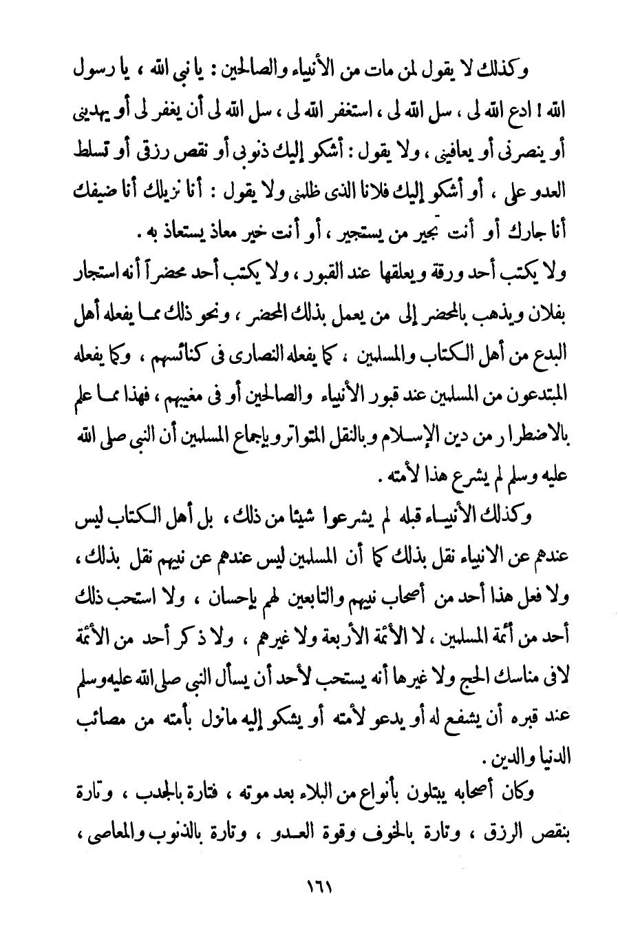 وَكَذَلِكَ لَا يَقُولُ لِمَنْ مَاتَ مِنْ الْأَنْبِيَاءِ وَالصَّالِحِينَ: يَا نَبِيَّ اللَّهِ يَا رَسُولَ اللَّهِ اُدْعُ اللَّهَ لِي سَلْ اللَّهَ لِي اسْتَغْفِرْ اللَّهَ لِي سَلْ اللَّهَ لِي أَنْ يَغْفِرَ لِي أَوْ يَهْدِيَنِي أَوْ يَنْصُرَنِي أَوْ يُعَافِيَنِي وَلَا يَقُولُ: أَشْكُو إلَيْك ذُنُوبِي أَوْ نَقْصَ رِزْقِي أَوْ تَسَلُّطَ الْعَدُوِّ عَلَيَّ أَوْ أَشْكُو إلَيْك فُلَانًا الَّذِي ظَلَمَنِي وَلَا يَقُولُ: أَنَا نَزِيلُك أَنَا ضَيْفُك أَنَا جَارُك أَوْ أَنْتَ تُجِيرُ مَنْ يَسْتَجِيرُ أَوْ أَنْتَ خَيْرُ مُعَاذٍ يُسْتَعَاذُ بِهِ. وَلَا يَكْتُبُ أَحَدٌ وَرَقَةً وَيُعَلِّقُهَا عِنْدَ الْقُبُورِ وَلَا يَكْتُبُ أَحَدٌ مَحْضَرًا أَنَّهُ اسْتَجَارَ بِفُلَانِ وَيَذْهَبُ بِالْمَحْضَرِ إلَى مَنْ يَعْمَلُ بِذَلِكَ الْمَحْضَرِ وَنَحْوِ ذَلِكَ مِمَّا يَفْعَلُهُ أَهْلُ الْبِدَعِ مِنْ أَهْلِ الْكِتَابِ وَالْمُسْلِمِينَ كَمَا يَفْعَلُهُ النَّصَارَى فِي كَنَائِسِهِمْ وَكَمَا يَفْعَلُهُ الْمُبْتَدِعُونَ مِنْ الْمُسْلِمِينَ عِنْدَ قُبُورِ الْأَنْبِيَاءِ وَالصَّالِحِينَ أَوْ فِي مَغِيبِهِمْ فَهَذَا مِمَّا عُلِمَ بِالِاضْطِرَارِ مِنْ دِينِ الْإِسْلَامِ وَبِالنَّقْلِ الْمُتَوَاتِرِ وَبِإِجْمَاعِ الْمُسْلِمِينَ أَنَّ النَّبِيَّ صَلَّى اللَّهُ عَلَيْهِ وَسَلَّمَ لَمْ يَشْرَعْ هَذَا لِأُمَّتِهِ. وَكَذَلِكَ الْأَنْبِيَاءُ قَبْلَهُ لَمْ يَشْرَعُوا شَيْئًا مِنْ ذَلِكَ بَلْ أَهْلُ الْكِتَابِ لَيْسَ عِنْدَهُمْ عَنْ الْأَنْبِيَاءِ نَقْلٌ بِذَلِكَ كَمَا أَنَّ الْمُسْلِمِينَ لَيْسَ عِنْدَهُمْ عَنْ نَبِيِّهِمْ نَقْلٌ بِذَلِكَ وَلَا فَعَلَ هَذَا أَحَدٌ مِنْ أَصْحَابِ نَبِيِّهِمْ وَالتَّابِعِينَ لَهُمْ بِإِحْسَانِ وَلَا اسْتَحَبَّ ذَلِكَ أَحَدٌ مِنْ أَئِمَّةِ الْمُسْلِمِينَ لَا الْأَئِمَّةُ الْأَرْبَعَةُ وَلَا غَيْرُهُمْ وَلَا ذَكَرَ أَحَدٌ مِنْ الْأَئِمَّةِ لَا فِي مَنَاسِكِ الْحَجِّ وَلَا غَيْرِهَا أَنَّهُ يُسْتَحَبُّ لِأَحَدِ أَنْ يَسْأَلَ النَّبِيَّ صَلَّى اللَّهُ عَلَيْهِ وَسَلَّمَ عِنْدَ قَبْرِهِ أَنْ يَشْفَعَ لَهُ أَوْ يَدْعُوَ لِأُمَّتِهِ أَوْ يَشْكُوَ إلَيْهِ مَا نَزَلَ بِأُمَّتِهِ مِنْ مَصَائِبِ الدُّنْيَا وَالدِّينِ. وَكَانَ أَصْحَابُهُ يُبْتَلَوْنَ بِأَنْوَاعِ مِنْ الْبَلَاءِ بَعْدَ مَوْتِهِ فَتَارَةً بِالْجَدْبِ وَتَارَةً بِنَقْصِ الرِّزْقِ وَتَارَةً بِالْخَوْفِ وَقُوَّةِ الْعَدُوِّ وَتَارَةً بِالذُّنُوبِ وَالْمَعَاصِي