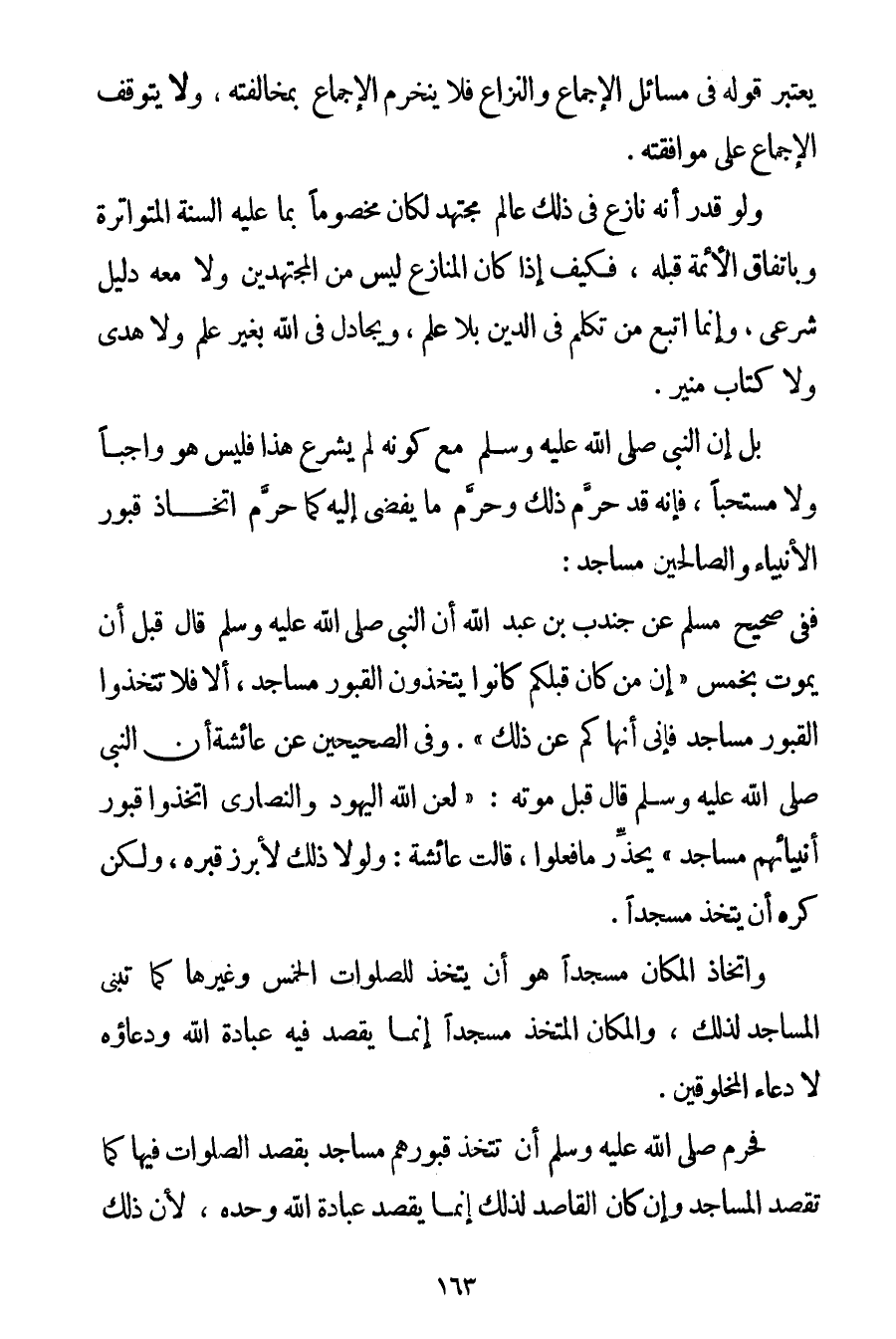 يُعْتَبَرُ قَوْلُهُ فِي مَسَائِلِ الْإِجْمَاعِ وَالنِّزَاعِ فَلَا يَنْخَرِمُ الْإِجْمَاعُ بِمُخَالَفَتِهِ وَلَا يَتَوَقَّفُ الْإِجْمَاعُ عَلَى مُوَافَقَتِهِ. وَلَوْ قُدِّرَ أَنَّهُ نَازَعَ فِي ذَلِكَ عَالِمٌ مُجْتَهِدٌ لَكَانَ مَخْصُومًا بِمَا عَلَيْهِ السُّنَّةُ الْمُتَوَاتِرَةُ وَبِاتِّفَاقِ الْأَئِمَّةِ قَبْلَهُ فَكَيْفَ إذَا كَانَ الْمُنَازِعُ لَيْسَ مِنْ الْمُجْتَهِدِينَ وَلَا مَعَهُ دَلِيلٌ شَرْعِيٌّ وَإِنَّمَا اتَّبَعَ مَنْ تَكَلَّمَ فِي الدِّينِ بِلَا عِلْمٍ وَيُجَادِلُ فِي اللَّهِ بِغَيْرِ عِلْمٍ وَلَا هُدًى وَلَا كِتَابٍ مُنِيرٍ. بَلْ إنَّ النَّبِيَّ صَلَّى اللَّهُ عَلَيْهِ وَسَلَّمَ مَعَ كَوْنِهِ لَمْ يَشْرَعْ هَذَا فَلَيْسَ هُوَ وَاجِبًا وَلَا مُسْتَحَبًّا فَإِنَّهُ قَدْ حَرَّمَ ذَلِكَ وَحَرَّمَ مَا يُفْضِي إلَيْهِ كَمَا حَرَّمَ اتِّخَاذَ قُبُورِ الْأَنْبِيَاءِ وَالصَّالِحِينَ مَسَاجِدَ: فَفِي صَحِيحِ مُسْلِمٍ عَنْ جُنْدُبِ بْنِ عَبْدِ اللَّهِ أَنَّ النَّبِيَّ صَلَّى اللَّهُ عَلَيْهِ وَسَلَّمَ قَالَ قَبْلَ أَنْ يَمُوتَ بِخَمْسِ {إنَّ مَنْ كَانَ قَبْلَكُمْ كَانُوا يَتَّخِذُونَ الْقُبُورَ مَسَاجِدَ أَلَا فَلَا تَتَّخِذُوا الْقُبُورَ مَسَاجِدَ فَإِنِّي أَنْهَاكُمْ عَنْ ذَلِكَ} . وَفِي الصَّحِيحَيْنِ عَنْ عَائِشَةَ أَنَّ النَّبِيَّ صَلَّى اللَّهُ عَلَيْهِ وَسَلَّمَ قَالَ قَبْلَ مَوْتِهِ: {لَعَنَ اللَّهُ الْيَهُودَ وَالنَّصَارَى اتَّخَذُوا قُبُورَ أَنْبِيَائِهِمْ مَسَاجِدَ} يُحَذِّرُ مَا فَعَلُوا قَالَتْ عَائِشَةُ: وَلَوْلَا ذَلِكَ لَأُبْرِزَ قَبْرُهُ وَلَكِنْ كَرِهَ أَنْ يُتَّخَذَ مَسْجِدًا. وَاِتِّخَاذُ الْمَكَانِ مَسْجِدًا هُوَ أَنْ يُتَّخَذَ لِلصَّلَوَاتِ الْخَمْسِ وَغَيْرِهَا كَمَا تُبْنَى الْمَسَاجِدُ لِذَلِكَ وَالْمَكَانُ الْمُتَّخَذُ مَسْجِدًا إنَّمَا يُقْصَدُ فِيهِ عِبَادَةُ اللَّهِ وَدُعَاؤُهُ لَا دُعَاءُ الْمَخْلُوقِينَ. فَحَرَّمَ صَلَّى اللَّهُ عَلَيْهِ وَسَلَّمَ أَنْ تُتَّخَذَ قُبُورُهُمْ مَسَاجِدَ بِقَصْدِ الصَّلَوَاتِ فِيهَا كَمَا تُقْصَدُ الْمَسَاجِدُ وَإِنْ كَانَ الْقَاصِدُ لِذَلِكَ إنَّمَا يَقْصِدُ عِبَادَةَ اللَّهِ وَحْدَهُ لِأَنَّ ذَلِكَ