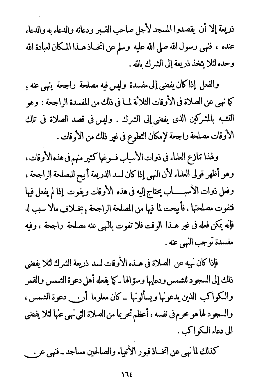 ذَرِيعَةٌ إلَّا أَنْ يَقْصِدُوا الْمَسْجِدَ لِأَجْلِ صَاحِبِ الْقَبْرِ وَدُعَائِهِ وَالدُّعَاءِ بِهِ وَالدُّعَاءِ عِنْدَهُ فَنَهَى رَسُولُ اللَّهِ صَلَّى اللَّهُ عَلَيْهِ وَسَلَّمَ عَنْ اتِّخَاذِ هَذَا الْمَكَانِ لِعِبَادَةِ اللَّهِ وَحْدَهُ لِئَلَّا يُتَّخَذَ ذَرِيعَةً إلَى الشِّرْكِ بِاَللَّهِ. وَالْفِعْلُ إذَا كَانَ يُفْضِي إلَى مَفْسَدَةٍ وَلَيْسَ فِيهِ مَصْلَحَةٌ رَاجِحَةٌ يُنْهَى عَنْهُ؛ كَمَا نَهَى عَنْ الصَّلَاةِ فِي الْأَوْقَاتِ الثَّلَاثَةِ لِمَا فِي ذَلِكَ مِنْ الْمَفْسَدَةِ الرَّاجِحَةِ: وَهُوَ التَّشَبُّهُ بِالْمُشْرِكِينَ الَّذِي يُفْضِي إلَى الشِّرْكِ. وَلَيْسَ فِي قَصْدِ الصَّلَاةِ فِي تِلْكَ الْأَوْقَاتِ مَصْلَحَةٌ رَاجِحَةٌ لِإِمْكَانِ التَّطَوُّعِ فِي غَيْرِ ذَلِكَ مِنْ الْأَوْقَاتِ. وَلِهَذَا تَنَازَعَ الْعُلَمَاءُ فِي ذَوَاتِ الْأَسْبَابِ فَسَوَّغَهَا كَثِيرٌ مِنْهُمْ فِي هَذِهِ الْأَوْقَاتِ وَهُوَ أَظْهَرُ قَوْلَيْ الْعُلَمَاءِ لِأَنَّ النَّهْيَ إذَا كَانَ لِسَدِّ الذَّرِيعَةِ أُبِيحَ لِلْمَصْلَحَةِ الرَّاجِحَةِ وَفِعْلُ ذَوَاتِ الْأَسْبَابِ يُحْتَاجُ إلَيْهِ فِي هَذِهِ الْأَوْقَاتِ وَيَفُوتُ إذَا لَمْ يُفْعَلْ فِيهَا فَتَفُوتُ مَصْلَحَتُهَا فَأُبِيحَتْ لِمَا فِيهَا مِنْ الْمَصْلَحَةِ الرَّاجِحَةِ؛ بِخِلَافِ مَا لَا سَبَبَ لَهُ فَإِنَّهُ يُمْكِنُ فِعْلُهُ فِي غَيْرِ هَذَا الْوَقْتِ فَلَا تَفُوتُ بِالنَّهْيِ عَنْهُ مَصْلَحَةٌ رَاجِحَةٌ وَفِيهِ مَفْسَدَةٌ تُوجِبُ النَّهْيَ عَنْهُ. فَإِذَا كَانَ نَهْيُهُ عَنْ الصَّلَاةِ فِي هَذِهِ الْأَوْقَاتِ لِسَدِّ ذَرِيعَةِ الشِّرْكِ لِئَلَّا يُفْضِيَ ذَلِكَ إلَى السُّجُودِ لِلشَّمْسِ وَدُعَائِهَا وَسُؤَالِهَا - كَمَا يَفْعَلُهُ أَهْلُ دَعْوَةِ الشَّمْسِ وَالْقَمَرِ وَالْكَوَاكِبِ الَّذِينَ يَدْعُونَهَا وَيَسْأَلُونَهَا - كَانَ مَعْلُومًا أَنَّ دَعْوَةَ الشَّمْسِ وَالسُّجُودَ لَهَا هُوَ مُحَرَّمٌ فِي نَفْسِهِ أَعْظَمُ تَحْرِيمًا مِنْ الصَّلَاةِ الَّتِي نَهَى عَنْهَا لِئَلَّا يُفْضِيَ إلَى دُعَاءِ الْكَوَاكِبِ. كَذَلِكَ لِمَا نَهَى عَنْ اتِّخَاذِ قُبُورِ الْأَنْبِيَاءِ وَالصَّالِحِينَ مَسَاجِدَ - فَنَهَى عَنْ