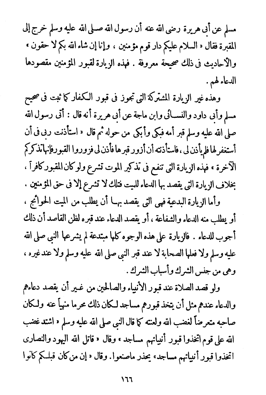 مُسْلِمٍ عَنْ أَبِي هُرَيْرَةَ رَضِيَ اللَّهُ عَنْهُ {أَنَّ رَسُولَ اللَّهِ صَلَّى اللَّهُ عَلَيْهِ وَسَلَّمَ خَرَجَ إلَى الْمَقْبَرَةِ فَقَالَ السَّلَامُ عَلَيْكُمْ دَارَ قَوْمٍ مُؤْمِنِينَ وَإِنَّا إنْ شَاءَ اللَّهُ بِكُمْ لَاحِقُونَ} وَالْأَحَادِيثُ فِي ذَلِكَ صَحِيحَةٌ مَعْرُوفَةٌ. فَهَذِهِ الزِّيَارَةُ لِقُبُورِ الْمُؤْمِنِينَ مَقْصُودُهَا الدُّعَاءُ لَهُمْ. وَهَذِهِ غَيْرُ الزِّيَارَةِ الْمُشْتَرَكَةِ الَّتِي تَجُوزُ فِي قُبُورِ الْكُفَّارِ كَمَا ثَبَتَ فِي صَحِيحِ مُسْلِمٍ وَأَبِي دَاوُد وَالنَّسَائِي وَابْنِ مَاجَه {عَنْ أَبِي هُرَيْرَةَ أَنَّهُ قَالَ: أَتَى رَسُولُ اللَّهِ صَلَّى اللَّهُ عَلَيْهِ وَسَلَّمَ قَبْرَ أُمِّهِ فَبَكَى وَأَبْكَى مَنْ حَوْلَهُ ثُمَّ قَالَ اسْتَأْذَنْت رَبِّي فِي أَنْ أَسْتَغْفِرَ لَهَا فَلَمْ يَأْذَنْ لِي فَاسْتَأْذَنْته أَنْ أَزُورَ قَبْرَهَا فَأَذِنَ لِي فَزُورُوا الْقُبُورَ فَإِنَّهَا تُذَكِّرُكُمْ الْآخِرَةَ} فَهَذِهِ الزِّيَارَةُ الَّتِي تَنْفَعُ فِي تَذْكِيرِ الْمَوْتِ تُشْرَعُ وَلَوْ كَانَ الْمَقْبُورُ كَافِرًا بِخِلَافِ الزِّيَارَةِ الَّتِي يُقْصَدُ بِهَا الدُّعَاءُ لِلْمَيِّتِ فَتِلْكَ لَا تُشْرَعُ إلَّا فِي حَقِّ الْمُؤْمِنِينَ وَأَمَّا الزِّيَارَةُ الْبِدْعِيَّةُ فَهِيَ الَّتِي يُقْصَدُ بِهَا أَنْ يُطْلَبَ مِنْ الْمَيِّتِ الْحَوَائِجُ أَوْ يُطْلَبَ مِنْهُ الدُّعَاءُ وَالشَّفَاعَةُ أَوْ يُقْصَدُ الدُّعَاءُ عِنْدَ قَبْرِهِ لِظَنِّ الْقَاصِدِ أَنَّ ذَلِكَ أجوب لِلدُّعَاءِ. فَالزِّيَارَةُ عَلَى هَذِهِ الْوُجُوهِ كُلِّهَا مُبْتَدَعَةٌ لَمْ يَشْرَعْهَا النَّبِيُّ صَلَّى اللَّهُ عَلَيْهِ وَسَلَّمَ وَلَا فَعَلَهَا الصَّحَابَةُ لَا عِنْدَ قَبْرِ النَّبِيِّ صَلَّى اللَّهُ عَلَيْهِ وَسَلَّمَ وَلَا عِنْدَ غَيْرِهِ وَهِيَ مِنْ جِنْسِ الشِّرْكِ وَأَسْبَابِ الشِّرْكِ.