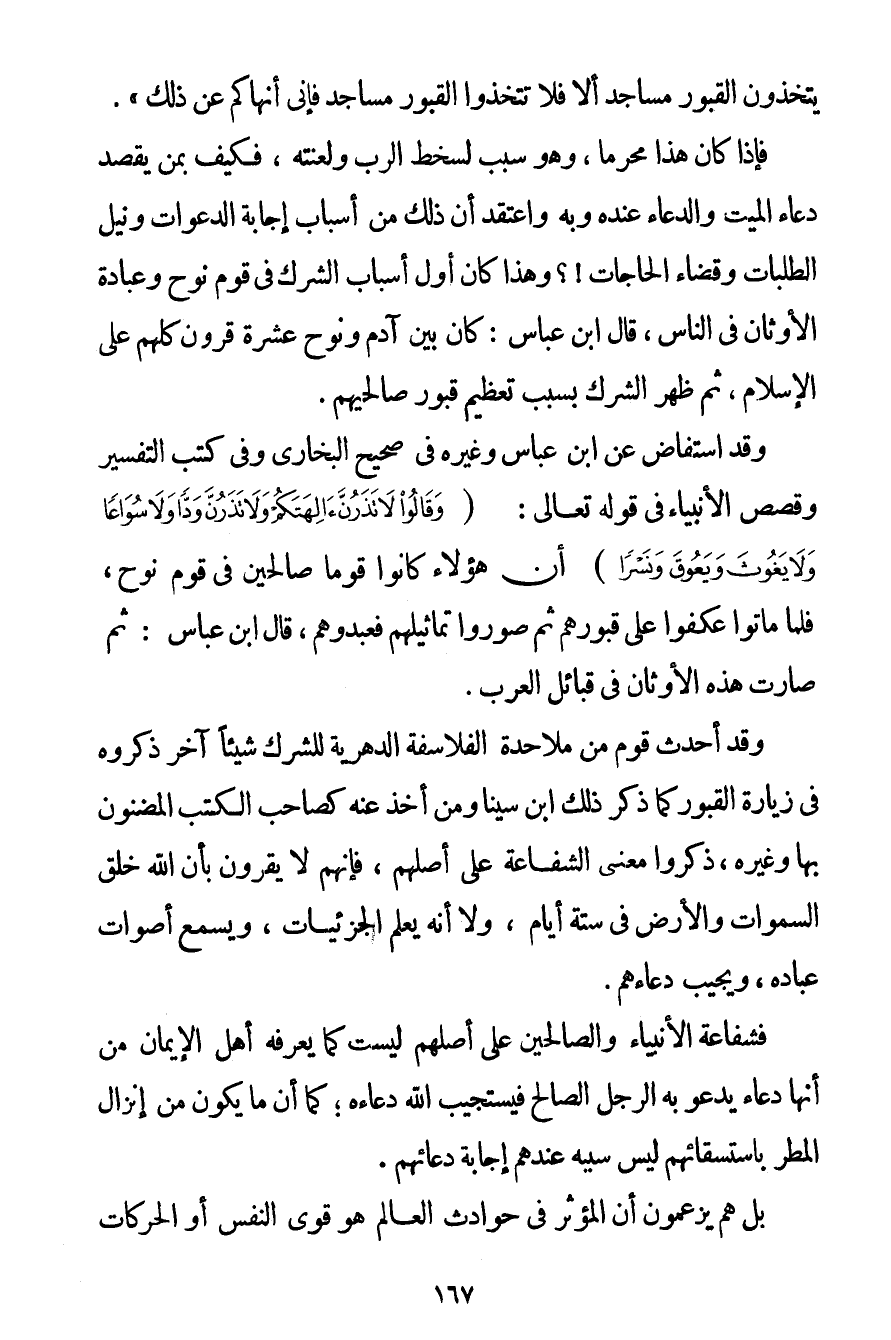 يَتَّخِذُونَ الْقُبُورَ مَسَاجِدَ أَلَا فَلَا تَتَّخِذُوا الْقُبُورَ مَسَاجِدَ فَإِنِّي أَنْهَاكُمْ عَنْ ذَلِكَ} . فَإِذَا كَانَ هَذَا مُحَرَّمًا وَهُوَ سَبَبٌ لِسَخَطِ الرَّبِّ وَلَعْنَتِهِ فَكَيْفَ بِمَنْ يَقْصِدُ دُعَاءَ الْمَيِّتِ وَالدُّعَاءَ عِنْدَهُ وَبِهِ وَاعْتَقَدَ أَنَّ ذَلِكَ مِنْ أَسْبَابِ إجَابَةِ الدَّعَوَاتِ وَنَيْلِ الطَّلَبَاتِ وَقَضَاءِ الْحَاجَاتِ؟ وَهَذَا كَانَ أَوَّلَ أَسْبَابِ الشِّرْكِ فِي قَوْمِ نُوحٍ وَعِبَادَةِ الْأَوْثَانِ فِي النَّاسِ قَالَ ابْنُ عَبَّاسٍ: كَانَ بَيْنَ آدَمَ وَنُوحٍ عَشَرَةُ قُرُونٍ كُلُّهُمْ عَلَى الْإِسْلَامِ ثُمَّ ظَهَرَ الشِّرْكُ بِسَبَبِ تَعْظِيمِ قُبُورِ صَالِحِيهِمْ. وَقَدْ اسْتَفَاضَ عَنْ ابْنِ عَبَّاسٍ وَغَيْرِهِ فِي صَحِيحِ الْبُخَارِيِّ وَفِي كُتُبِ التَّفْسِيرِ وَقِصَصِ الْأَنْبِيَاءِ فِي قَوْله تَعَالَى {وَقَالُوا لَا تَذَرُنَّ آلِهَتَكُمْ وَلَا تَذَرُنَّ وَدًّا وَلَا سُوَاعًا وَلَا يَغُوثَ وَيَعُوقَ وَنَسْرًا} أَنَّ هَؤُلَاءِ كَانُوا قَوْمًا صَالِحِينَ فِي قَوْمِ نُوحٍ فَلَمَّا مَاتُوا عَكَفُوا عَلَى قُبُورِهِمْ ثُمَّ صَوَّرُوا تَمَاثِيلَهُمْ فَعَبَدُوهُمْ قَالَ ابْنُ عَبَّاسٍ: ثُمَّ صَارَتْ هَذِهِ الْأَوْثَانُ فِي قَبَائِلِ الْعَرَبِ. وَقَدْ أَحْدَثَ قَوْمٌ مِنْ مَلَاحِدَةِ الْفَلَاسِفَةِ الدَّهْرِيَّةِ لِلشِّرْكِ شَيْئًا آخَرَ ذَكَرُوهُ فِي زِيَارَةِ الْقُبُورِ كَمَا ذَكَرَ ذَلِكَ ابْنُ سِينَا وَمَنْ أَخَذَ عَنْهُ كَصَاحِبِ الْكُتُبِ الْمَضْنُونِ بِهَا وَغَيْرِهِ ذَكَرُوا مَعْنَى الشَّفَاعَةِ عَلَى أَصْلِهِمْ فَإِنَّهُمْ لَا يُقِرُّونَ بِأَنَّ اللَّهَ خَلَقَ السَّمَوَاتِ وَالْأَرْضَ فِي سِتَّةِ أَيَّامٍ وَلَا أَنَّهُ يَعْلَمُ الْجُزْئِيَّاتِ وَيَسْمَعُ أَصْوَاتَ عِبَادِهِ وَيُجِيبُ دُعَاءَهُمْ. فَشَفَاعَةُ الْأَنْبِيَاءِ وَالصَّالِحِينَ عَلَى أَصْلِهِمْ لَيْسَتْ كَمَا يَعْرِفُهُ أَهْلُ الْإِيمَانِ مِنْ أَنَّهَا دُعَاءٌ يَدْعُو بِهِ الرَّجُلُ الصَّالِحُ فَيَسْتَجِيبُ اللَّهُ دُعَاءَهُ؛ كَمَا أَنَّ مَا يَكُونُ مِنْ إنْزَالِ الْمَطَرِ بِاسْتِسْقَائِهِمْ لَيْسَ سَبَبُهُ عِنْدَهُمْ إجَابَةَ دُعَائِهِمْ. بَلْ هُمْ يَزْعُمُونَ أَنَّ الْمُؤَثِّرَ فِي حَوَادِثِ الْعَالَمِ هُوَ قُوَى النَّفْسِ أَوْ الْحَرَكَاتُ