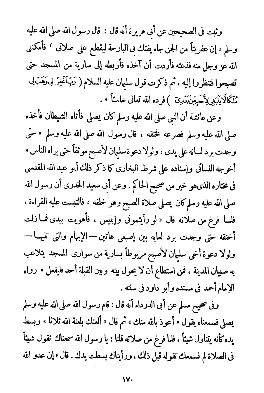 وَثَبَتَ فِي الصَّحِيحَيْنِ عَنْ أَبِي هُرَيْرَةَ أَنَّهُ قَالَ: {قَالَ رَسُولُ اللَّهِ صَلَّى اللَّهُ عَلَيْهِ وَسَلَّمَ إنَّ عِفْرِيتًا مِنْ الْجِنِّ جَاءَ يَفْتِكُ بِي الْبَارِحَةَ لِيَقْطَعَ عَلَيَّ صَلَاتِي فَأَمْكَنَنِي اللَّهُ عَزَّ وَجَلَّ مِنْهُ فذعته فَأَرَدْت أَنْ آخُذَهُ فَأَرْبِطَهُ إلَى سَارِيَةٍ مِنْ الْمَسْجِدِ حَتَّى تُصْبِحُوا فَتَنْظُرُوا إلَيْهِ ثُمَّ ذَكَرْت قَوْلَ سُلَيْمَانَ عَلَيْهِ السَّلَامُ {رَبِّ اغْفِرْ لِي وَهَبْ لِي مُلْكًا لَا يَنْبَغِي لِأَحَدٍ مِنْ بَعْدِي} فَرَدَّهُ اللَّهُ تَعَالَى خَاسِئًا} . وَعَنْ عَائِشَةَ {أَنَّ النَّبِيَّ صَلَّى اللَّهُ عَلَيْهِ وَسَلَّمَ كَانَ يُصَلِّي فَأَتَاهُ الشَّيْطَانُ فَأَخَذَهُ صَلَّى اللَّهُ عَلَيْهِ وَسَلَّمَ فَصَرَعَهُ فَخَنَقَهُ قَالَ رَسُولُ اللَّهِ صَلَّى اللَّهُ عَلَيْهِ وَسَلَّمَ حَتَّى وَجَدْت بَرْدَ لِسَانِهِ عَلَى يَدِي وَلَوْلَا دَعْوَةُ سُلَيْمَانَ لَأَصْبَحَ مُوَثَّقًا حَتَّى يَرَاهُ النَّاسُ} أَخْرَجَهُ النَّسَائِي وَإِسْنَادُهُ عَلَى شَرْطِ الْبُخَارِيِّ كَمَا ذَكَرَ ذَلِكَ أَبُو عَبْدِ اللَّهِ المقدسي فِي مُخْتَارِهِ الَّذِي هُوَ خَيْرٌ مِنْ صَحِيحِ الْحَاكِمِ. وَعَنْ أَبِي سَعِيدٍ الخدري {أَنَّ رَسُولَ اللَّهِ صَلَّى اللَّهُ عَلَيْهِ وَسَلَّمَ كَانَ يُصَلِّي صَلَاةَ الصُّبْحِ وَهُوَ خَلْفَهُ فَالْتَبَسَتْ عَلَيْهِ الْقِرَاءَةُ فَلَمَّا فَرَغَ مِنْ صِلَاتِهِ قَالَ لَوْ رَأَيْتُمُونِي وَإِبْلِيسَ فَأَهْوَيْت بِيَدِي فَمَا زِلْت أَخْنُقُهُ حَتَّى وَجَدْت بَرْدَ لُعَابِهِ بَيْنَ أُصْبُعَيَّ هَاتَيْنِ - الْإِبْهَامِ وَاَلَّتِي تَلِيهَا - وَلَوْلَا دَعْوَةُ أَخِي سُلَيْمَانَ لَأَصْبَحَ مَرْبُوطًا بِسَارِيَةِ مِنْ سَوَارِي الْمَسْجِدِ يَتَلَاعَبُ بِهِ صِبْيَانُ الْمَدِينَةِ فَمَنْ اسْتَطَاعَ أَنْ لَا يَحُولَ بَيْنَهُ وَبَيْنَ الْقِبْلَةِ أَحَدٌ فَلْيَفْعَلْ} رَوَاهُ الْإِمَامُ أَحْمَدُ فِي مُسْنَدِهِ وَأَبُو دَاوُد فِي سُنَنِهِ. وَفِي صَحِيحِ مُسْلِمٍ عَنْ أَبِي الدَّرْدَاءِ أَنَّهُ قَالَ: {قَامَ رَسُولُ اللَّهِ صَلَّى اللَّهُ عَلَيْهِ وَسَلَّمَ يُصَلِّي فَسَمِعْنَاهُ يَقُولُ أَعُوذُ بِاَللَّهِ مِنْك ثُمَّ قَالَ أَلْعَنُك بِلَعْنَةِ اللَّهِ ثَلَاثًا وَبَسَطَ يَدَهُ كَأَنَّهُ يَتَنَاوَلُ شَيْئًا فَلَمَّا فَرَغَ مِنْ صَلَاتِهِ قُلْنَا: يَا رَسُولَ اللَّهِ سَمِعْنَاك تَقُولُ شَيْئًا فِي الصَّلَاةِ لَمْ نَسْمَعْك تَقُولُهُ قَبْلَ ذَلِكَ وَرَأَيْنَاك بَسَطْت يَدَك. قَالَ إنَّ عَدُوَّ اللَّهِ
