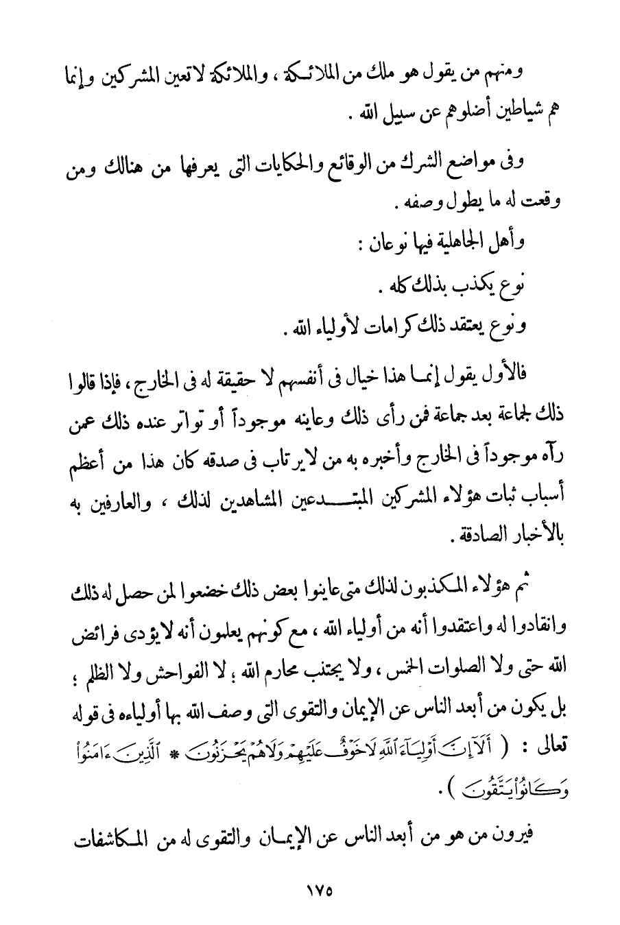 وَمِنْهُمْ مَنْ يَقُولُ هُوَ مَلَكٌ مِنْ الْمَلَائِكَةِ وَالْمَلَائِكَةُ لَا تُعِينُ الْمُشْرِكِينَ وَإِنَّمَا هُمْ شَيَاطِينُ أَضَلُّوهُمْ عَنْ سَبِيلِ اللَّهِ. وَفِي مَوَاضِعِ الشِّرْكِ مِنْ الْوَقَائِعِ وَالْحِكَايَاتِ الَّتِي يَعْرِفُهَا مَنْ هُنَالِكَ وَمَنْ وَقَعَتْ لَهُ مَا يَطُولُ وَصْفُهُ. وَأَهْلُ الْجَاهِلِيَّةِ فِيهَا نَوْعَانِ: نَوْعٌ يُكَذِّبُ بِذَلِكَ كُلِّهِ. وَنَوْعٌ يَعْتَقِدُ ذَلِكَ كَرَامَاتٍ لِأَوْلِيَاءِ اللَّهِ. فَالْأَوَّلُ يَقُولُ إنَّمَا هَذَا خَيَالٌ فِي أَنْفُسِهِمْ لَا حَقِيقَةَ لَهُ فِي الْخَارِجِ فَإِذَا قَالُوا ذَلِكَ لِجَمَاعَةِ بَعْدَ جَمَاعَةٍ فَمَنْ رَأَى ذَلِكَ وَعَايَنَهُ مَوْجُودًا أَوْ تَوَاتَرَ عِنْدَهُ ذَلِكَ عَمَّنْ رَآهُ مَوْجُودًا فِي الْخَارِجِ وَأَخْبَرَهُ بِهِ مَنْ لَا يُرْتَابُ فِي صِدْقِهِ كَانَ هَذَا مِنْ أَعْظَمِ أَسْبَابِ ثَبَاتِ هَؤُلَاءِ الْمُشْرِكِينَ الْمُبْتَدِعِينَ الْمُشَاهِدِينَ لِذَلِكَ وَالْعَارِفِينَ بِهِ بِالْأَخْبَارِ الصَّادِقَةِ. ثُمَّ هَؤُلَاءِ الْمُكَذِّبُونَ لِذَلِكَ مَتَى عَايَنُوا بَعْضَ ذَلِكَ خَضَعُوا لِمَنْ حَصَلَ لَهُ ذَلِكَ وَانْقَادُوا لَهُ وَاعْتَقَدُوا أَنَّهُ مِنْ أَوْلِيَاءِ اللَّهِ مَعَ كَوْنِهِمْ يَعْلَمُونَ أَنَّهُ لَا يُؤَدِّي فَرَائِضَ اللَّهِ حَتَّى وَلَا الصَّلَوَاتِ الْخَمْسَ وَلَا يَجْتَنِبُ مَحَارِمَ اللَّهِ؛ لَا الْفَوَاحِشَ وَلَا الظُّلْمَ؛ بَلْ يَكُونُ مِنْ أَبْعَدِ النَّاسِ عَنْ الْإِيمَانِ وَالتَّقْوَى الَّتِي وَصَفَ اللَّهُ بِهَا أَوْلِيَاءَهُ فِي قَوْله تَعَالَى {أَلَا إنَّ أَوْلِيَاءَ اللَّهِ لَا خَوْفٌ عَلَيْهِمْ وَلَا هُمْ يَحْزَنُونَ} {الَّذِينَ آمَنُوا وَكَانُوا يَتَّقُونَ} . فَيَرَوْنَ مَنْ هُوَ مِنْ أَبْعَدِ النَّاسِ عَنْ الْإِيمَانِ وَالتَّقْوَى لَهُ مِنْ الْمُكَاشَفَاتِ