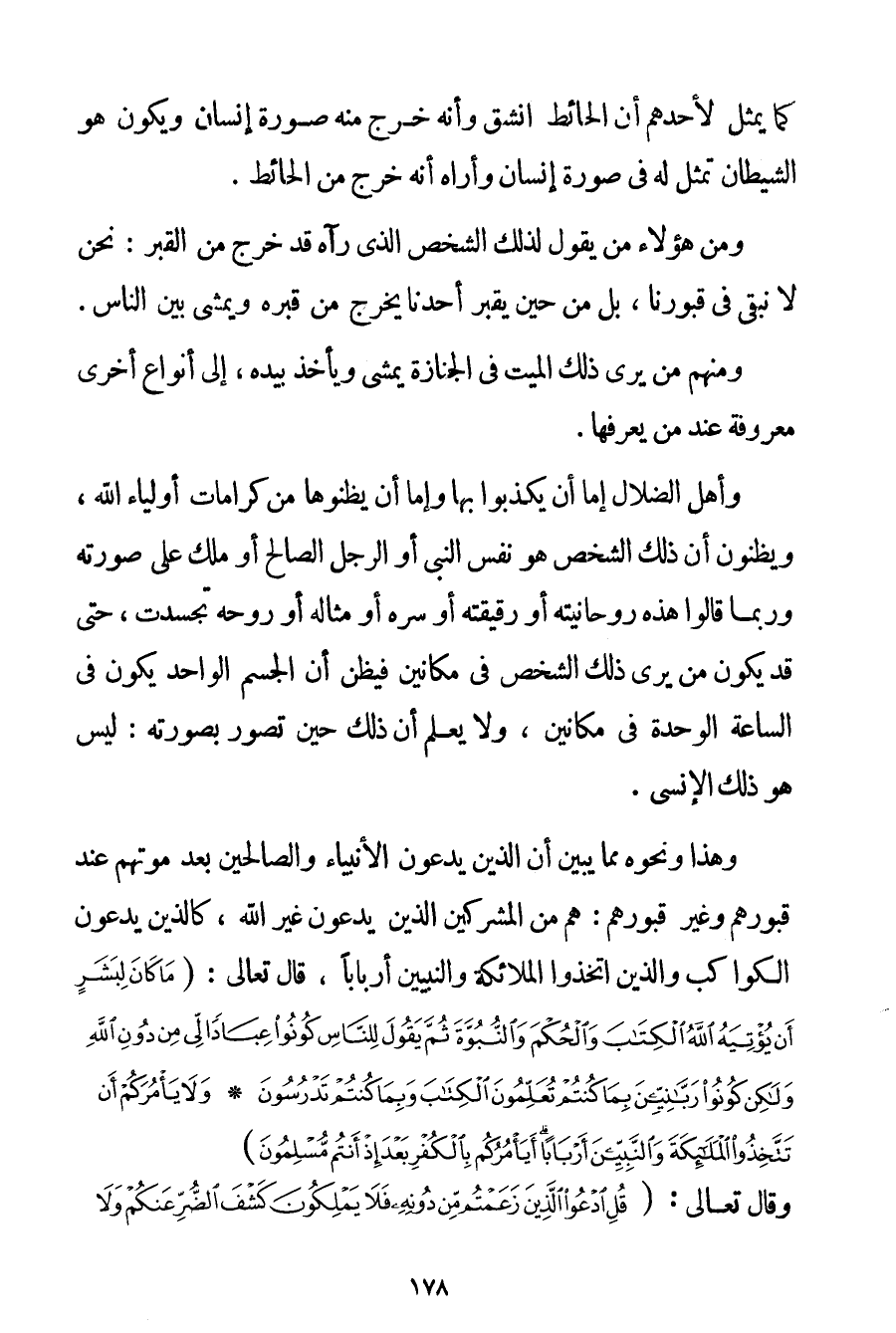 كَمَا يُمَثِّلُ لِأَحَدِهِمْ أَنَّ الْحَائِطَ انْشَقَّ وَأَنَّهُ خَرَجَ مِنْهُ صُورَةُ إنْسَانٍ وَيَكُونُ هُوَ الشَّيْطَانُ تَمَثَّلَ لَهُ فِي صُورَةِ إنْسَانٍ وَأَرَاهُ أَنَّهُ خَرَجَ مِنْ الْحَائِطِ. وَمِنْ هَؤُلَاءِ مَنْ يَقُولُ لِذَلِكَ الشَّخْصِ الَّذِي رَآهُ قَدْ خَرَجَ مِنْ الْقَبْرِ: نَحْنُ لَا نَبْقَى فِي قُبُورِنَا بَلْ مِنْ حِينِ يُقْبَرُ أَحَدُنَا يَخْرُجُ مِنْ قَبْرِهِ وَيَمْشِي بَيْنَ النَّاسِ. وَمِنْهُمْ مَنْ يَرَى ذَلِكَ الْمَيِّتَ فِي الْجِنَازَةِ يَمْشِي وَيَأْخُذُ بِيَدِهِ إلَى أَنْوَاعٍ أُخْرَى مَعْرُوفَةٍ عِنْدَ مَنْ يَعْرِفُهَا. وَأَهْلُ الضَّلَالِ إمَّا أَنْ يُكَذِّبُوا بِهَا وَإِمَّا أَنْ يَظُنُّوهَا مِنْ كَرَامَاتِ أَوْلِيَاءِ اللَّهِ وَيَظُنُّونَ أَنَّ ذَلِكَ الشَّخْصَ هُوَ نَفْسُ النَّبِيِّ أَوْ الرَّجُلِ الصَّالِحِ أَوْ مَلَكٌ عَلَى صُورَتِهِ وَرُبَّمَا قَالُوا هَذِهِ رُوحَانِيَّتُهُ أَوْ رَقِيقَتُهُ أَوْ سِرُّهُ أَوْ مِثَالُهُ أَوْ رُوحُهُ تَجَسَّدَتْ حَتَّى قَدْ يَكُونُ مَنْ يَرَى ذَلِكَ الشَّخْصَ فِي مَكَانَيْنِ فَيَظُنُّ أَنَّ الْجِسْمَ الْوَاحِدَ يَكُونُ فِي السَّاعَةِ الْوَاحِدَةِ فِي مَكَانَيْنِ وَلَا يُعْلَمُ أَنَّ ذَلِكَ حِينَ تَصَوَّرَ بِصُورَتِهِ: لَيْسَ هُوَ ذَلِكَ الْإِنْسِيَّ. وَهَذَا وَنَحْوُهُ مِمَّا يُبَيِّنُ أَنَّ الَّذِينَ يَدْعُونَ الْأَنْبِيَاءَ وَالصَّالِحِينَ بَعْدَ مَوْتِهِمْ عِنْدَ قُبُورِهِمْ وَغَيْرِ قُبُورِهِمْ: هُمْ مِنْ الْمُشْرِكِينَ الَّذِينَ يَدْعُونَ غَيْرَ اللَّهِ كَاَلَّذِينَ يَدْعُونَ الْكَوَاكِبَ وَاَلَّذِينَ اتَّخَذُوا الْمَلَائِكَةَ وَالنَّبِيِّينَ أَرْبَابًا قَالَ تَعَالَى: {مَا كَانَ لِبَشَرٍ أَنْ يُؤْتِيَهُ اللَّهُ الْكِتَابَ وَالْحُكْمَ وَالنُّبُوَّةَ ثُمَّ يَقُولَ لِلنَّاسِ كُونُوا عِبَادًا لِي مِنْ دُونِ اللَّهِ وَلَكِنْ كُونُوا رَبَّانِيِّينَ بِمَا كُنْتُمْ تُعَلِّمُونَ الْكِتَابَ وَبِمَا كُنْتُمْ تَدْرُسُونَ} {وَلَا يَأْمُرَكُمْ أَنْ تَتَّخِذُوا الْمَلَائِكَةَ وَالنَّبِيِّينَ أَرْبَابًا أَيَأْمُرُكُمْ بِالْكُفْرِ بَعْدَ إذْ أَنْتُمْ مُسْلِمُونَ} وَقَالَ تَعَالَى: {قُلِ ادْعُوا الَّذِينَ زَعَمْتُمْ مِنْ دُونِهِ فَلَا يَمْلِكُونَ
