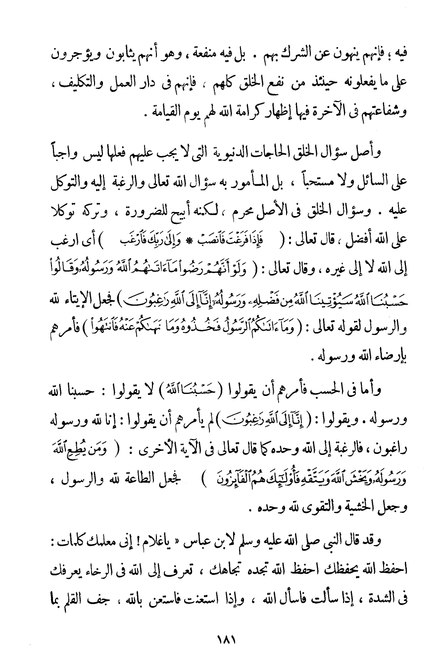 وَأَصْلُ سُؤَالِ الْخَلْقِ الْحَاجَاتِ الدُّنْيَوِيَّةَ الَّتِي لَا يَجِبُ عَلَيْهِمْ فِعْلُهَا لَيْسَ وَاجِبًا عَلَى السَّائِلِ وَلَا مُسْتَحَبًّا بَلْ الْمَأْمُورُ بِهِ سُؤَالُ اللَّهِ تَعَالَى وَالرَّغْبَةُ إلَيْهِ وَالتَّوَكُّلُ عَلَيْهِ. وَسُؤَالُ الْخَلْقِ فِي الْأَصْلِ مُحَرَّمٌ لَكِنَّهُ أُبِيحَ لِلضَّرُورَةِ وَتَرْكُهُ تَوَكُّلًا عَلَى اللَّهِ أَفْضَلُ قَالَ تَعَالَى: {فَإِذَا فَرَغْتَ فَانْصَبْ} {وَإِلَى رَبِّكَ فَارْغَبْ} أَيْ ارْغَبْ إلَى اللَّهِ لَا إلَى غَيْرِهِ وَقَالَ تَعَالَى: {وَلَوْ أَنَّهُمْ رَضُوا مَا آتَاهُمُ اللَّهُ وَرَسُولُهُ وَقَالُوا حَسْبُنَا اللَّهُ سَيُؤْتِينَا اللَّهُ مِنْ فَضْلِهِ وَرَسُولُهُ إنَّا إلَى اللَّهِ رَاغِبُونَ} فَجَعَلَ الْإِيتَاءَ لِلَّهِ وَالرَّسُولِ لِقَوْلِهِ تَعَالَى {وَمَا آتَاكُمُ الرَّسُولُ فَخُذُوهُ وَمَا نَهَاكُمْ عَنْهُ فَانْتَهُوا} فَأَمَرَهُمْ بِإِرْضَاءِ اللَّهِ وَرَسُولِهِ. وَأَمَّا فِي الحسب فَأَمَرَهُمْ أَنْ يَقُولُوا (حَسْبُنَا اللَّهُ لَا يَقُولُوا: حَسْبُنَا اللَّهُ وَرَسُولُهُ. وَيَقُولُوا: {إنَّا إلَى اللَّهِ رَاغِبُونَ} لَمْ يَأْمُرْهُمْ أَنْ يَقُولُوا: إنَّا لِلَّهِ وَرَسُولِهِ رَاغِبُونَ فَالرَّغْبَةُ إلَى اللَّهِ وَحْدَهُ كَمَا قَالَ تَعَالَى فِي الْآيَةِ الْأُخْرَى: {وَمَنْ يُطِعِ اللَّهَ وَرَسُولَهُ وَيَخْشَ اللَّهَ وَيَتَّقْهِ فَأُولَئِكَ هُمُ الْفَائِزُونَ} فَجَعَلَ الطَّاعَةَ لِلَّهِ وَالرَّسُولِ وَجَعَلَ الْخَشْيَةَ وَالتَّقْوَى لِلَّهِ وَحْدَهُ. وَقَدْ قَالَ النَّبِيُّ صَلَّى اللَّهُ عَلَيْهِ وَسَلَّمَ لِابْنِ عَبَّاسٍ {يَا غُلَامُ إنِّي مُعَلِّمُك كَلِمَاتٍ: احْفَظْ اللَّهَ يَحْفَظْك احْفَظْ اللَّهَ تَجِدْهُ تُجَاهَك تَعَرَّفْ إلَى اللَّهِ فِي الرَّخَاءِ يَعْرِفْك فِي الشِّدَّةِ إذَا سَأَلْت فَاسْأَلْ اللَّهَ وَإِذَا اسْتَعَنْت فَاسْتَعِنْ بِاَللَّهِ جَفَّ الْقَلَمُ بِمَا