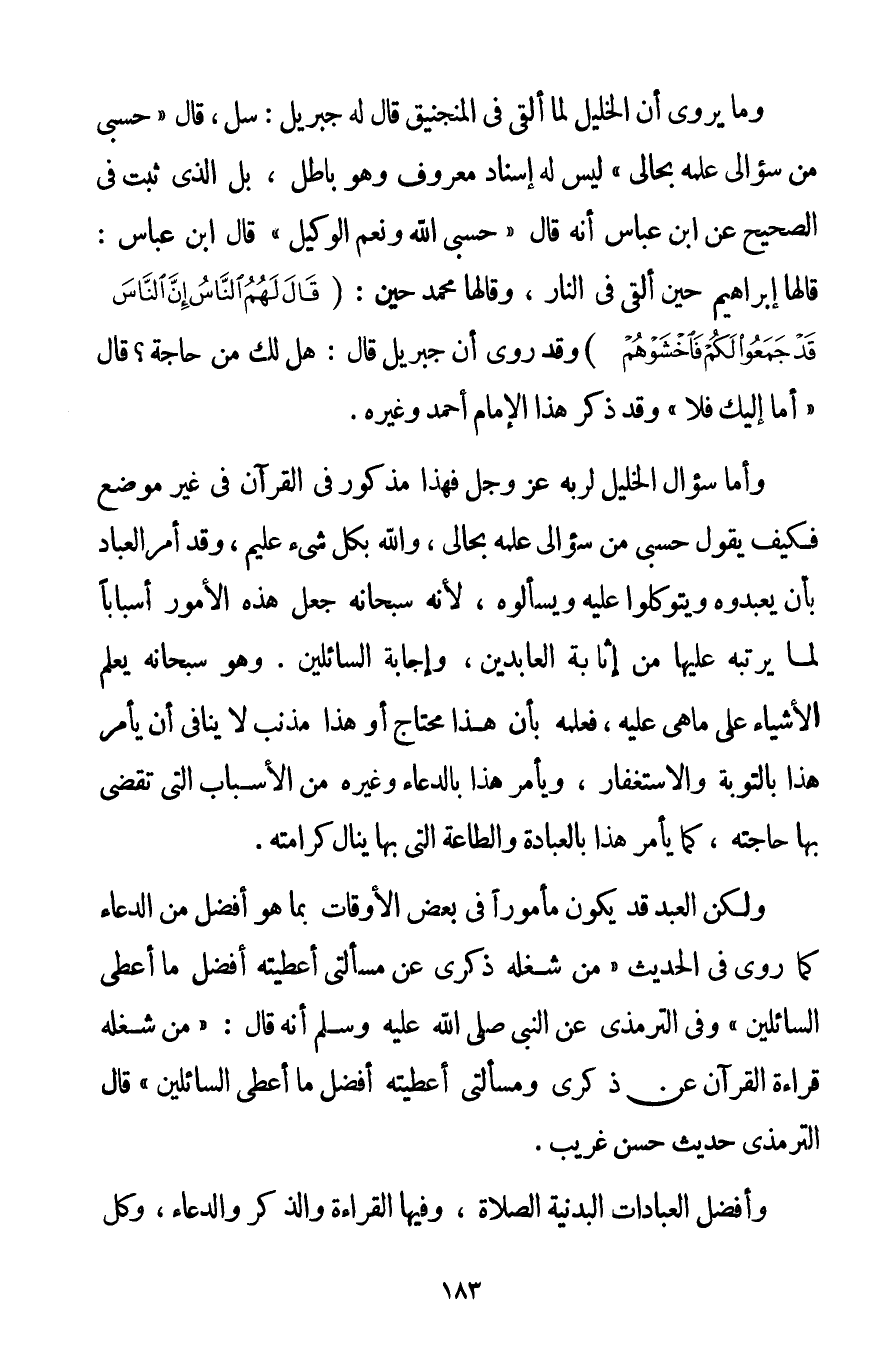 وَمَا يُرْوَى أَنَّ الْخَلِيلَ لَمَّا أُلْقِيَ فِي الْمَنْجَنِيقِ قَالَ لَهُ جِبْرِيلُ: سَلْ قَالَ " حَسْبِي مِنْ سُؤَالِي عِلْمُهُ بِحَالِي " لَيْسَ لَهُ إسْنَادٌ مَعْرُوفٌ وَهُوَ بَاطِلٌ بَلْ الَّذِي ثَبَتَ فِي الصَّحِيحِ عَنْ ابْنِ عَبَّاسٍ أَنَّهُ قَالَ: " حَسْبِي اللَّهُ وَنِعْمَ الْوَكِيلُ " قَالَ ابْنُ عَبَّاسٍ: قَالَهَا إبْرَاهِيمُ حِينَ أُلْقِيَ فِي النَّارِ وَقَالَهَا مُحَمَّدٌ حِينَ: {قَالَ لَهُمُ النَّاسُ إنَّ النَّاسَ قَدْ جَمَعُوا لَكُمْ فَاخْشَوْهُمْ} وَقَدْ رُوِيَ أَنَّ جِبْرِيلَ قَالَ: هَلْ لَك مِنْ حَاجَةٍ؟ قَالَ " أَمَّا إلَيْك فَلَا " وَقَدْ ذَكَرَ هَذَا الْإِمَامُ أَحْمَدُ وَغَيْرُهُ. وَأَمَّا سُؤَالُ الْخَلِيلِ لِرَبِّهِ عَزَّ وَجَلَّ فَهَذَا مَذْكُورٌ فِي الْقُرْآنِ فِي غَيْرِ مَوْضِعٍ فَكَيْفَ يَقُولُ حَسْبِي مِنْ سُؤَالِي عِلْمُهُ بِحَالِي وَاَللَّهُ بِكُلِّ شَيْءٍ عَلِيمٌ وَقَدْ أَمَرَ الْعِبَادَ بِأَنْ يَعْبُدُوهُ وَيَتَوَكَّلُوا عَلَيْهِ وَيَسْأَلُوهُ لِأَنَّهُ سُبْحَانَهُ جَعَلَ هَذِهِ الْأُمُورَ أَسْبَابًا لِمَا يُرَتِّبُهُ عَلَيْهَا مِنْ إثَابَةِ الْعَابِدِينَ وَإِجَابَةِ السَّائِلِينَ. وَهُوَ سُبْحَانَهُ يَعْلَمُ الْأَشْيَاءَ عَلَى مَا هِيَ عَلَيْهِ فَعِلْمُهُ بِأَنَّ هَذَا مُحْتَاجٌ أَوْ هَذَا مُذْنِبٌ لَا يُنَافِي أَنْ يَأْمُرَ هَذَا بِالتَّوْبَةِ وَالِاسْتِغْفَارِ وَيَأْمُرَ هَذَا بِالدُّعَاءِ وَغَيْرِهِ مِنْ الْأَسْبَابِ الَّتِي تُقْضَى بِهَا حَاجَتُهُ كَمَا يَأْمُرُ هَذَا بِالْعِبَادَةِ وَالطَّاعَةِ الَّتِي بِهَا يَنَالُ كَرَامَتَهُ. وَلَكِنَّ الْعَبْدَ قَدْ يَكُونُ مَأْمُورًا فِي بَعْضِ الْأَوْقَاتِ بِمَا هُوَ أَفْضَلُ مِنْ الدُّعَاءِ كَمَا رُوِيَ فِي الْحَدِيثِ {مَنْ شَغَلَهُ ذِكْرِي عَنْ مَسْأَلَتِي أَعْطَيْته أَفْضَلَ مَا أُعْطِي السَّائِلِينَ} وَفِي التِّرْمِذِيِّ عَنْ النَّبِيِّ صَلَّى اللَّهُ عَلَيْهِ وَسَلَّمَ أَنَّهُ قَالَ: {مَنْ شَغَلَهُ قِرَاءَةُ الْقُرْآنِ عَنْ ذِكْرِي وَمَسْأَلَتِي أَعْطَيْته أَفْضَلَ مَا أُعْطِي السَّائِلِينَ} قَالَ التِّرْمِذِيُّ حَدِيثٌ حَسَنٌ غَرِيبٌ.