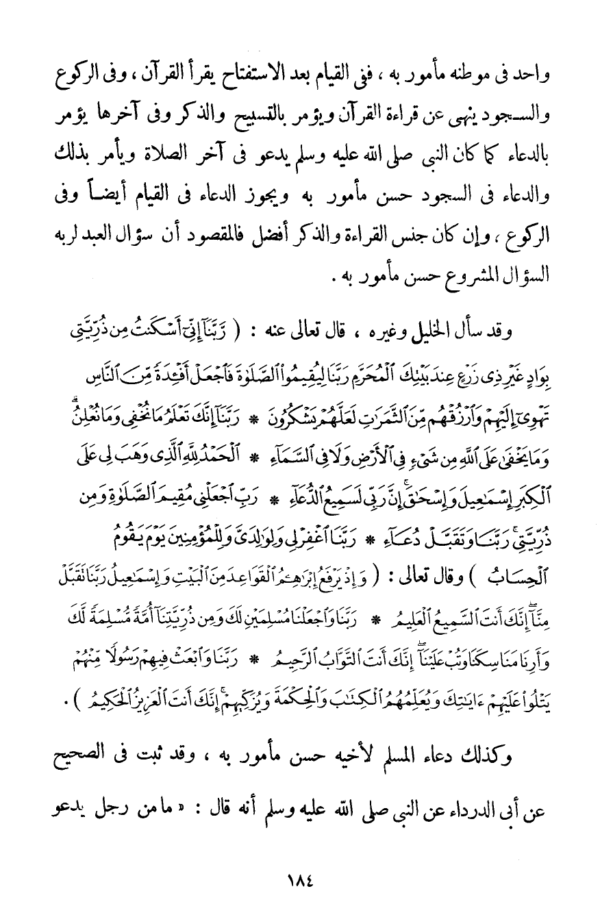 وَاحِدٍ فِي مَوْطِنِهِ مَأْمُورٌ بِهِ فَفِي الْقِيَامِ بَعْدَ الِاسْتِفْتَاحِ يَقْرَأُ الْقُرْآنَ وَفِي الرُّكُوعِ وَالسُّجُودِ يُنْهَى عَنْ قِرَاءَةِ الْقُرْآنِ وَيُؤْمَرُ بِالتَّسْبِيحِ وَالذِّكْرِ وَفِي آخِرِهَا يُؤْمَرُ بِالدُّعَاءِ كَمَا كَانَ النَّبِيُّ صَلَّى اللَّهُ عَلَيْهِ وَسَلَّمَ يَدْعُو فِي آخِرِ الصَّلَاةِ وَيَأْمُرُ بِذَلِكَ وَالدُّعَاءُ فِي السُّجُودِ حَسَنٌ مَأْمُورٌ بِهِ وَيَجُوزُ الدُّعَاءُ فِي الْقِيَامِ أَيْضًا وَفِي الرُّكُوعِ وَإِنْ كَانَ جِنْسُ الْقِرَاءَةِ وَالذِّكْرِ أَفْضَلَ فَالْمَقْصُودُ أَنَّ سُؤَالَ الْعَبْدِ لِرَبِّهِ السُّؤَالَ الْمَشْرُوعَ حَسَنٌ مَأْمُورٌ بِهِ. وَقَدْ سَأَلَ الْخَلِيلُ وَغَيْرُهُ قَالَ تَعَالَى عَنْهُ: {رَبَّنَا إنِّي أَسْكَنْتُ مِنْ ذُرِّيَّتِي بِوَادٍ غَيْرِ ذِي زَرْعٍ عِنْدَ بَيْتِكَ الْمُحَرَّمِ رَبَّنَا لِيُقِيمُوا الصَّلَاةَ فَاجْعَلْ أَفْئِدَةً مِنَ النَّاسِ تَهْوِي إلَيْهِمْ وَارْزُقْهُمْ مِنَ الثَّمَرَاتِ لَعَلَّهُمْ يَشْكُرُونَ} {رَبَّنَا إنَّكَ تَعْلَمُ مَا نُخْفِي وَمَا نُعْلِنُ وَمَا يَخْفَى عَلَى اللَّهِ مِنْ شَيْءٍ فِي الْأَرْضِ وَلَا فِي السَّمَاءِ} {الْحَمْدُ لِلَّهِ الَّذِي وَهَبَ لِي عَلَى الْكِبَرِ إسْمَاعِيلَ وَإِسْحَاقَ إنَّ رَبِّي لَسَمِيعُ الدُّعَاءِ} {رَبِّ اجْعَلْنِي مُقِيمَ الصَّلَاةِ وَمِنْ ذُرِّيَّتِي رَبَّنَا وَتَقَبَّلْ دُعَاءِ} {رَبَّنَا اغْفِرْ لِي وَلِوَالِدَيَّ وَلِلْمُؤْمِنِينَ يَوْمَ يَقُومُ الْحِسَابُ} وَقَالَ تَعَالَى: {وَإِذْ يَرْفَعُ إبْرَاهِيمُ الْقَوَاعِدَ مِنَ الْبَيْتِ وَإِسْمَاعِيلُ رَبَّنَا تَقَبَّلْ مِنَّا إنَّكَ أَنْتَ السَّمِيعُ الْعَلِيمُ} {رَبَّنَا وَاجْعَلْنَا مُسْلِمَيْنِ لَكَ وَمِنْ ذُرِّيَّتِنَا أُمَّةً مُسْلِمَةً لَكَ وَأَرِنَا مَنَاسِكَنَا وَتُبْ عَلَيْنَا إنَّكَ أَنْتَ التَّوَّابُ الرَّحِيمُ} {رَبَّنَا وَابْعَثْ فِيهِمْ رَسُولًا مِنْهُمْ يَتْلُو عَلَيْهِمْ آيَاتِكَ وَيُعَلِّمُهُمُ الْكِتَابَ وَالْحِكْمَةَ وَيُزَكِّيهِمْ إنَّكَ أَنْتَ الْعَزِيزُ الْحَكِيمُ} . وَكَذَلِكَ دُعَاءُ الْمُسْلِمِ لِأَخِيهِ حَسَنٌ مَأْمُورٌ بِهِ وَقَدْ ثَبَتَ فِي الصَّحِيحِ عَنْ أَبِي الدَّرْدَاءِ عَنْ النَّبِيِّ صَلَّى اللَّهُ عَلَيْهِ وَسَلَّمَ أَنَّهُ قَالَ: {مَا مِنْ رَجُلٍ يَدْعُو