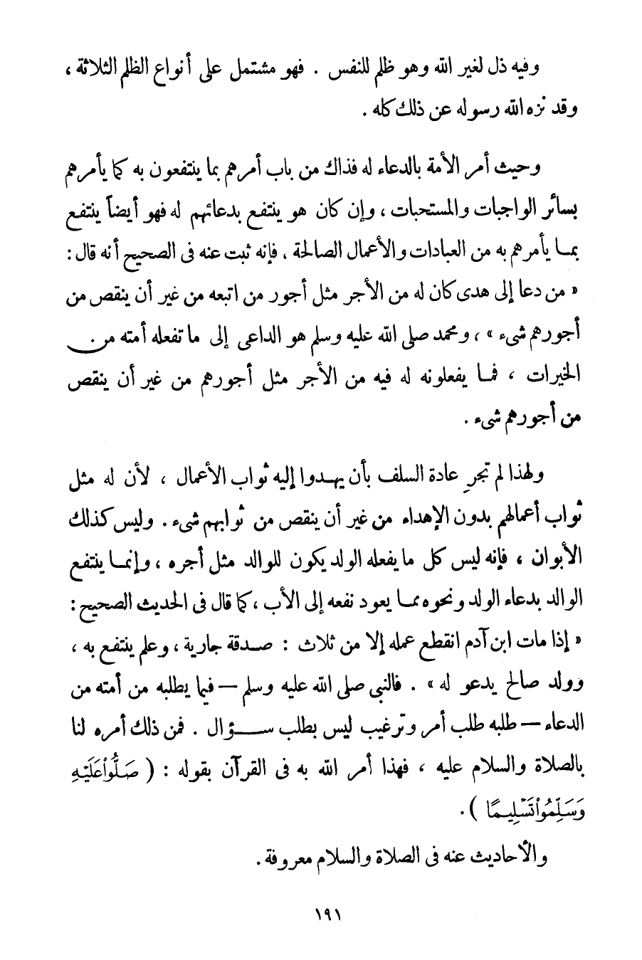 وَفِيهِ ذُلٌّ لِغَيْرِ اللَّهِ وَهُوَ ظُلْمٌ لِلنَّفْسِ. فَهُوَ مُشْتَمِلٌ عَلَى أَنْوَاعِ الظُّلْمِ الثَّلَاثَةِ وَقَدْ نَزَّهَ اللَّهُ رَسُولَهُ عَنْ ذَلِكَ كُلِّهِ. وَحَيْثُ أَمَرَ الْأُمَّةَ بِالدُّعَاءِ لَهُ فَذَاكَ مِنْ بَابِ أَمْرِهِمْ بِهَا يَنْتَفِعُونَ بِهِ كَمَا يَأْمُرُهُمْ بِسَائِرِ الْوَاجِبَاتِ والمستحبات وَإِنْ كَانَ هُوَ يَنْتَفِعُ بِدُعَائِهِمْ لَهُ فَهُوَ أَيْضًا يَنْتَفِعُ بِمَا يَأْمُرُهُمْ بِهِ مِنْ الْعِبَادَاتِ وَالْأَعْمَالِ الصَّالِحَةِ فَإِنَّهُ ثَبَتَ عَنْهُ فِي الصَّحِيحِ أَنَّهُ قَالَ: {مَنْ دَعَا إلَى هُدًى كَانَ لَهُ مِنْ الْأَجْرِ مِثْلُ أُجُورِ مَنْ اتَّبَعَهُ مِنْ غَيْرِ أَنْ يَنْقُصَ مِنْ أُجُورِهِمْ شَيْءٌ} وَمُحَمَّدٌ صَلَّى اللَّهُ عَلَيْهِ وَسَلَّمَ هُوَ الدَّاعِي إلَى مَا تَفْعَلُهُ أُمَّتُهُ مِنْ الْخَيْرَاتِ فَمَا يَفْعَلُونَهُ لَهُ فِيهِ مِنْ الْأَجْرِ مِثْلُ أُجُورِهِمْ مِنْ غَيْرِ أَنْ يَنْقُصَ مِنْ أُجُورِهِمْ شَيْءٌ. وَلِهَذَا لَمْ تَجْرِ عِبَادَةُ السَّلَفِ بِأَنْ يُهْدُوا إلَيْهِ ثَوَابَ الْأَعْمَالِ لِأَنَّ لَهُ مِثْلَ ثَوَابِ أَعْمَالِهِمْ بِدُونِ الْإِهْدَاءِ مِنْ غَيْرِ أَنْ يَنْقُصَ مِنْ ثَوَابِهِمْ شَيْءٌ. وَلَيْسَ كَذَلِكَ الْأَبَوَانِ فَإِنَّهُ لَيْسَ كُلُّ مَا يَفْعَلُهُ الْوَلَدُ يَكُونُ لِلْوَالِدِ مِثْلُ أَجْرِهِ وَإِنَّمَا يَنْتَفِعُ الْوَالِدُ بِدُعَاءِ الْوَلَدِ وَنَحْوِهِ مِمَّا يَعُودُ نَفْعُهُ إلَى الْأَبِ كَمَا قَالَ فِي الْحَدِيثِ الصَّحِيحِ: {إذَا مَاتَ ابْنُ آدَمَ انْقَطَعَ عَمَلُهُ إلَّا مِنْ ثَلَاثٍ: صَدَقَةٌ جَارِيَةٌ وَعِلْمٌ يُنْتَفَعُ بِهِ وَوَلَدٌ صَالِحٌ يَدْعُو لَهُ} . فَالنَّبِيُّ صَلَّى اللَّهُ عَلَيْهِ وَسَلَّمَ - فِيمَا يَطْلُبُهُ مِنْ أُمَّتِهِ مِنْ الدُّعَاءِ - طَلَبُهُ طَلَبُ أَمْرٍ وَتَرْغِيبٍ لَيْسَ بِطَلَبِ سُؤَالٍ. فَمِنْ ذَلِكَ أَمْرُهُ لَنَا بِالصَّلَاةِ وَالسَّلَامِ عَلَيْهِ فَهَذَا أَمَرَ اللَّهُ بِهِ فِي الْقُرْآنِ بِقَوْلِهِ: {صَلُّوا عَلَيْهِ وَسَلِّمُوا تَسْلِيمًا} . وَالْأَحَادِيثُ عَنْهُ فِي الصَّلَاةِ وَالسَّلَامِ مَعْرُوفَةٌ.