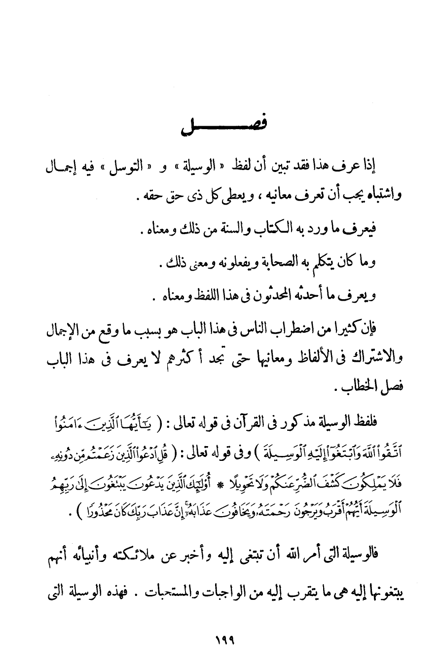إذَا عُرِفَ هَذَا فَقَدَ تَبَيَّنَ أَنَّ لَفْظَ " الْوَسِيلَةِ " وَ " التَّوَسُّلِ فِيهِ إجْمَالٌ وَاشْتِبَاهٌ يَجِبُ أَنْ تُعْرَفَ مَعَانِيهِ وَيُعْطَى كُلُّ ذِي حَقٍّ حَقَّهُ. فَيُعْرَفُ مَا وَرَدَ بِهِ الْكِتَابُ وَالسُّنَّةُ مِنْ ذَلِكَ وَمَعْنَاهُ. وَمَا كَانَ يَتَكَلَّمُ بِهِ الصَّحَابَةُ وَيَفْعَلُونَهُ وَمَعْنَى ذَلِكَ. وَيُعْرَفُ مَا أَحْدَثَهُ الْمُحْدِثُونَ فِي هَذَا اللَّفْظِ وَمَعْنَاهُ. فَإِنَّ كَثِيرًا مِنْ اضْطِرَابِ النَّاسِ فِي هَذَا الْبَابِ هُوَ بِسَبَبِ مَا وَقَعَ مِنْ الْإِجْمَالِ وَالِاشْتِرَاكِ فِي الْأَلْفَاظِ وَمَعَانِيهَا حَتَّى تَجِدَ أَكْثَرَهُمْ لَا يَعْرِفُ فِي هَذَا الْبَابِ فَصْلَ الْخِطَابِ. فَلَفْظُ الْوَسِيلَةِ مَذْكُورٌ فِي الْقُرْآنِ فِي قَوْله تَعَالَى {يَا أَيُّهَا الَّذِينَ آمَنُوا اتَّقُوا اللَّهَ وَابْتَغُوا إلَيْهِ الْوَسِيلَةَ} وَفِي قَوْله تَعَالَى {قُلِ ادْعُوا الَّذِينَ زَعَمْتُمْ مِنْ دُونِهِ فَلَا يَمْلِكُونَ كَشْفَ الضُّرِّ عَنْكُمْ وَلَا تَحْوِيلًا} {أُولَئِكَ الَّذِينَ يَدْعُونَ يَبْتَغُونَ إلَى رَبِّهِمُ الْوَسِيلَةَ أَيُّهُمْ أَقْرَبُ وَيَرْجُونَ رَحْمَتَهُ وَيَخَافُونَ عَذَابَهُ إنَّ عَذَابَ رَبِّكَ كَانَ مَحْذُورًا} . فَالْوَسِيلَةُ الَّتِي أَمَرَ اللَّهُ أَنْ تُبْتَغَى إلَيْهِ وَأَخْبَرَ عَنْ مَلَائِكَتِهِ وَأَنْبِيَائِهِ أَنَّهُمْ يَبْتَغُونَهَا إلَيْهِ هِيَ مَا يُتَقَرَّبُ إلَيْهِ مِنْ الْوَاجِبَاتِ والمستحبات فَهَذِهِ الْوَسِيلَةُ الَّتِي