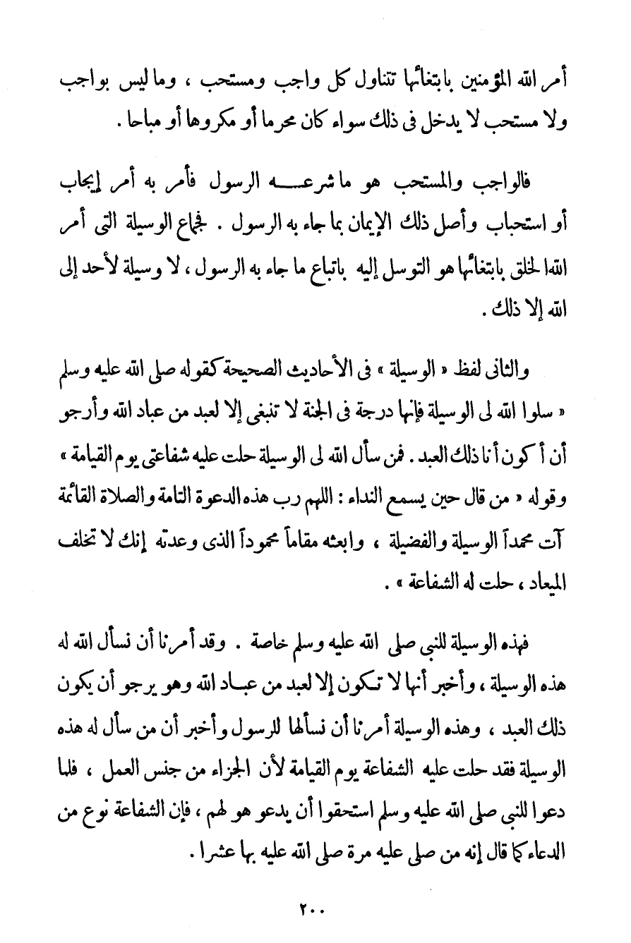 أَمَرَ اللَّهُ الْمُؤْمِنِينَ بِابْتِغَائِهَا تَتَنَاوَلُ كُلَّ وَاجِبٍ وَمُسْتَحَبٍّ وَمَا لَيْسَ بِوَاجِبِ وَلَا مُسْتَحَبٍّ لَا يَدْخُلُ فِي ذَلِكَ سَوَاءٌ كَانَ مُحَرَّمًا أَوْ مَكْرُوهًا أَوْ مُبَاحًا. فَالْوَاجِبُ وَالْمُسْتَحَبُّ هُوَ مَا شَرَعَهُ الرَّسُولُ فَأَمَرَ بِهِ أَمْرَ إيجَابٍ أَوْ اسْتِحْبَابٍ وَأَصْلُ ذَلِكَ الْإِيمَانُ بِمَا جَاءَ بِهِ الرَّسُولُ. فَجِمَاعُ الْوَسِيلَةِ الَّتِي أَمَرَ اللَّهُ الْخَلْقَ بِابْتِغَائِهَا هُوَ التَّوَسُّلُ إلَيْهِ بِاتِّبَاعِ مَا جَاءَ بِهِ الرَّسُولُ لَا وَسِيلَةَ لِأَحَدِ إلَى اللَّهِ إلَّا ذَلِكَ. وَالثَّانِي لَفْظُ " الْوَسِيلَةِ " فِي الْأَحَادِيثِ الصَّحِيحَةِ كَقَوْلِهِ صَلَّى اللَّهُ عَلَيْهِ وَسَلَّمَ {سَلُوا اللَّهَ لِي الْوَسِيلَةَ فَإِنَّهَا دَرَجَةٌ فِي الْجَنَّةِ لَا تَنْبَغِي إلَّا لِعَبْدِ مِنْ عِبَادِ اللَّهِ وَأَرْجُو أَنْ أَكُونَ أَنَا ذَلِكَ الْعَبْدَ. فَمَنْ سَأَلَ اللَّهَ لِي الْوَسِيلَةَ حَلَّتْ عَلَيْهِ شَفَاعَتِي يَوْمَ الْقِيَامَةِ} وَقَوْلُهُ {مَنْ قَالَ حِينَ يَسْمَعُ النِّدَاءَ: اللَّهُمَّ رَبَّ هَذِهِ الدَّعْوَةِ التَّامَّةِ وَالصَّلَاةِ الْقَائِمَةِ آتِ مُحَمَّدًا الْوَسِيلَةَ وَالْفَضِيلَةَ وَابْعَثْهُ مَقَامًا مَحْمُودًا الَّذِي وَعَدْته إنَّك لَا تُخْلِفُ الْمِيعَادَ حَلَّتْ لَهُ الشَّفَاعَةُ} . فَهَذِهِ الْوَسِيلَةُ لِلنَّبِيِّ صَلَّى اللَّهُ عَلَيْهِ وَسَلَّمَ خَاصَّةً. وَقَدْ أُمِرْنَا أَنْ نَسْأَلَ اللَّهَ لَهُ هَذِهِ الْوَسِيلَةَ وَأَخْبَرَ أَنَّهَا لَا تَكُونُ إلَّا لِعَبْدِ مِنْ عِبَادِ اللَّهِ وَهُوَ يَرْجُو أَنْ يَكُونَ ذَلِكَ الْعَبْدَ وَهَذِهِ الْوَسِيلَةُ أُمِرْنَا أَنْ نَسْأَلَهَا لِلرَّسُولِ وَأَخْبَرَ أَنَّ مَنْ سَأَلَ لَهُ هَذِهِ الْوَسِيلَةَ فَقَدْ حَلَّتْ عَلَيْهِ الشَّفَاعَةُ يَوْمَ الْقِيَامَةِ لِأَنَّ الْجَزَاءَ مِنْ جِنْسِ الْعَمَلِ فَلَمَّا دَعَوْا لِلنَّبِيِّ صَلَّى اللَّهُ عَلَيْهِ وَسَلَّمَ اسْتَحَقُّوا أَنْ يَدْعُوَ هُوَ لَهُمْ فَإِنَّ الشَّفَاعَةَ نَوْعٌ مِنْ الدُّعَاءِ كَمَا قَالَ إنَّهُ مَنْ صَلَّى عَلَيْهِ مَرَّةً صَلَّى اللَّهُ عَلَيْهِ بِهَا عَشْرًا.