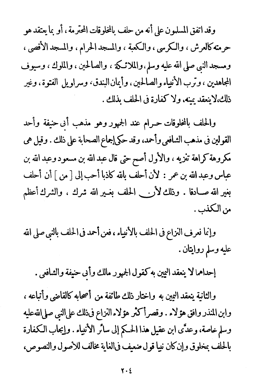 وَقَدْ اتَّفَقَ الْمُسْلِمُونَ عَلَى أَنَّهُ مَنْ حَلَفَ بِالْمَخْلُوقَاتِ الْمُحْتَرَمَةِ أَوْ بِمَا يَعْتَقِدُ هُوَ حُرْمَتَهُ كَالْعَرْشِ وَالْكُرْسِيِّ وَالْكَعْبَةِ وَالْمَسْجِدِ الْحَرَامِ وَالْمَسْجِدِ الْأَقْصَى وَمَسْجِدِ النَّبِيِّ صَلَّى اللَّهُ عَلَيْهِ وَسَلَّمَ وَالْمَلَائِكَةِ وَالصَّالِحِينَ وَالْمُلُوكِ وَسُيُوفِ الْمُجَاهِدِينَ وَتُرَبِ الْأَنْبِيَاءِ وَالصَّالِحِينَ وَأَيْمَانِ الْبُنْدُقِ وَسَرَاوِيلِ الْفُتُوَّةِ وَغَيْرِ ذَلِكَ لَا يَنْعَقِدُ يَمِينُهُ وَلَا كَفَّارَةَ فِي الْحَلِفِ بِذَلِكَ. وَالْحَلِفُ بِالْمَخْلُوقَاتِ حَرَامٌ عِنْدَ الْجُمْهُورِ وَهُوَ مَذْهَبُ أَبِي حَنِيفَةَ وَأَحَدُ الْقَوْلَيْنِ فِي مَذْهَبِ الشَّافِعِيِّ وَأَحْمَدَ وَقَدْ حُكِيَ إجْمَاعُ الصَّحَابَةِ عَلَى ذَلِكَ. وَقِيلَ هِيَ مَكْرُوهَةٌ كَرَاهَةَ تَنْزِيهٍ وَالْأَوَّلُ أَصَحُّ حَتَّى قَالَ عَبْدُ اللَّهِ بْنُ مَسْعُودٍ وَعَبْدُ اللَّهِ بْنُ عَبَّاسٍ وَعَبْدُ اللَّهِ بْنُ عُمَرَ: لَأَنْ أَحْلِفَ بِاَللَّهِ كَاذِبًا أَحَبُّ إلَيَّ مِنْ أَنْ أَحْلِفَ بِغَيْرِ اللَّهِ صَادِقًا. وَذَلِكَ لِأَنَّ الْحَلِفَ بِغَيْرِ اللَّهِ شِرْكٌ وَالشِّرْكُ أَعْظَمُ مِنْ الْكَذِبِ.