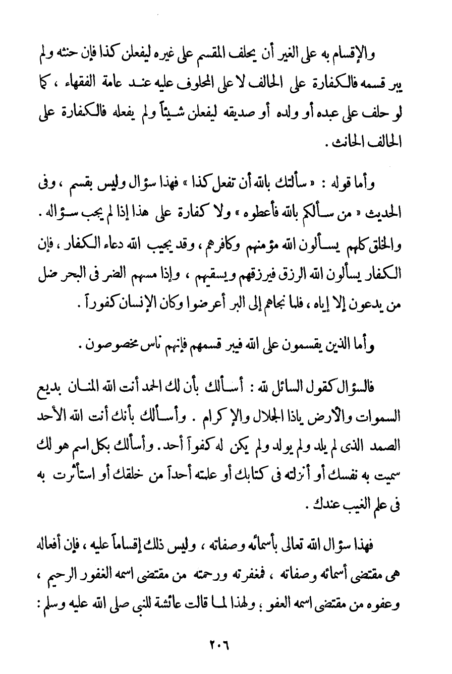 وَأَمَّا قَوْلُهُ: " سَأَلْتُك بِاَللَّهِ أَنْ تَفْعَلَ كَذَا " فَهَذَا سُؤَالٌ وَلَيْسَ بِقَسَمِ وَفِي الْحَدِيثِ {مَنْ سَأَلَكُمْ بِاَللَّهِ فَأَعْطُوهُ} وَلَا كَفَّارَةَ عَلَى هَذَا إذَا لَمْ يُجَبْ سُؤَالُهُ. وَالْخَلْقُ كُلُّهُمْ يَسْأَلُونَ اللَّهَ مُؤْمِنُهُمْ وَكَافِرُهُمْ وَقَدْ يُجِيبُ اللَّهُ دُعَاءَ الْكُفَّارِ فَإِنَّ الْكُفَّارَ يَسْأَلُونَ اللَّهَ الرِّزْقَ فَيَرْزُقُهُمْ وَيَسْقِيهِمْ وَإِذَا مَسَّهُمْ الضُّرُّ فِي الْبَحْرِ ضَلَّ مَنْ يَدْعُونَ إلَّا إيَّاهُ فَلَمَّا نَجَّاهُمْ إلَى الْبَرِّ أَعْرَضُوا وَكَانَ الْإِنْسَانُ كَفُورًا. وَأَمَّا الَّذِينَ يُقْسِمُونَ عَلَى اللَّهِ فَيُبِرُّ قَسَمَهُمْ فَإِنَّهُمْ نَاسٌ مَخْصُوصُونَ. فَالسُّؤَالُ كَقَوْلِ السَّائِلِ لِلَّهِ: أَسْأَلُك بِأَنَّ لَك الْحَمْدَ أَنْتَ اللَّهُ الْمَنَّانُ بَدِيعُ السَّمَوَاتِ وَالْأَرْضِ يَا ذَا الْجَلَالِ وَالْإِكْرَامِ. وَأَسْأَلُك بِأَنَّك أَنْتَ اللَّهُ الْأَحَدُ الصَّمَدُ الَّذِي لَمْ يَلِدْ وَلَمْ يُولَدْ وَلَمْ يَكُنْ لَهُ كُفُوًا أَحَدٌ. وَأَسْأَلُك بِكُلِّ اسْمٍ هُوَ لَك سَمَّيْت بِهِ نَفْسَك أَوْ أَنْزَلْته فِي كِتَابِك أَوْ عَلَّمْته أَحَدًا مِنْ خَلْقِك أَوْ اسْتَأْثَرْت بِهِ فِي عِلْمِ الْغَيْبِ عِنْدَك. فَهَذَا سُؤَالُ اللَّهِ تَعَالَى بِأَسْمَائِهِ وَصِفَاتِهِ وَلَيْسَ ذَلِكَ إقْسَامًا عَلَيْهِ فَإِنَّ أَفْعَالَهُ هِيَ مُقْتَضَى أَسْمَائِهِ وَصِفَاتِهِ فَمَغْفِرَتُهُ وَرَحْمَتُهُ مِنْ مُقْتَضَى اسْمِهِ الْغَفُورِ الرَّحِيمِ وَعَفْوُهُ مِنْ مُقْتَضَى اسْمِهِ الْعَفُوِّ؛ وَلِهَذَا لَمَّا {قَالَتْ عَائِشَةُ لِلنَّبِيِّ