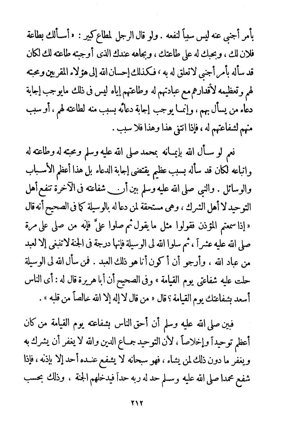 نَعَمْ لَوْ سَأَلَ اللَّهَ بِإِيمَانِهِ بِمُحَمَّدِ صَلَّى اللَّهُ عَلَيْهِ وَسَلَّمَ وَمَحَبَّتِهِ لَهُ وَطَاعَتِهِ لَهُ وَاتِّبَاعِهِ لَكَانَ قَدْ سَأَلَهُ بِسَبَبِ عَظِيمٍ يَقْتَضِي إجَابَةَ الدُّعَاءِ بَلْ هَذَا أَعْظَمُ الْأَسْبَابِ وَالْوَسَائِلِ. وَالنَّبِيُّ صَلَّى اللَّهُ عَلَيْهِ وَسَلَّمَ بَيَّنَ أَنَّ شَفَاعَتَهُ فِي الْآخِرَةِ تَنْفَعُ أَهْلَ التَّوْحِيدِ لَا أَهْلَ الشِّرْكِ وَهِيَ مُسْتَحَقَّةٌ لِمَنْ دَعَا لَهُ بِالْوَسِيلَةِ كَمَا فِي الصَّحِيحِ أَنَّهُ قَالَ {إذَا سَمِعْتُمْ الْمُؤَذِّنَ فَقُولُوا مِثْلَ مَا يَقُولُ ثُمَّ صَلُّوا عَلَيَّ فَإِنَّهُ مَنْ صَلَّى عَلَيَّ مَرَّةً صَلَّى اللَّهُ عَلَيْهِ عَشْرًا ثُمَّ سَلُوا اللَّهَ لِي الْوَسِيلَةَ فَإِنَّهَا دَرَجَةٌ فِي الْجَنَّةِ لَا تَنْبَغِي إلَّا لِعَبْدِ مِنْ عِبَادِ اللَّهِ وَأَرْجُو أَنْ أَكُونَ أَنَا هُوَ ذَلِكَ الْعَبْدَ. فَمَنْ سَأَلَ اللَّهَ لِي الْوَسِيلَةَ حَلَّتْ عَلَيْهِ شَفَاعَتِي يَوْمَ الْقِيَامَةِ} وَفِي الصَّحِيحِ {أَنَّ أَبَا هُرَيْرَةَ قَالَ لَهُ: أَيُّ النَّاسِ أَسْعَدُ بِشَفَاعَتِك يَوْمَ الْقِيَامَةِ؟ قَالَ مَنْ قَالَ لَا إلَهَ إلَّا اللَّهُ خَالِصًا مِنْ قَلْبِهِ} . فَبَيَّنَ صَلَّى اللَّهُ عَلَيْهِ وَسَلَّمَ أَنَّ أَحَقَّ النَّاسِ بِشَفَاعَتِهِ يَوْمَ الْقِيَامَةِ مَنْ كَانَ أَعْظَمَ تَوْحِيدًا وَإِخْلَاصًا لِأَنَّ التَّوْحِيدَ جِمَاعُ الدِّينِ وَاَللَّهُ لَا يَغْفِرُ أَنْ يُشْرَكَ بِهِ وَيَغْفِرُ مَا دُونَ ذَلِكَ لِمَنْ يَشَاءُ فَهُوَ سُبْحَانَهُ لَا يَشْفَعُ عِنْدَهُ أَحَدٌ إلَّا بِإِذْنِهِ فَإِذَا شُفِّعَ مُحَمَّدٌ صَلَّى اللَّهُ عَلَيْهِ وَسَلَّمَ حَدَّ لَهُ رَبُّهُ حَدًّا فَيُدْخِلُهُمْ الْجَنَّةَ وَذَلِكَ بِحَسَبِ