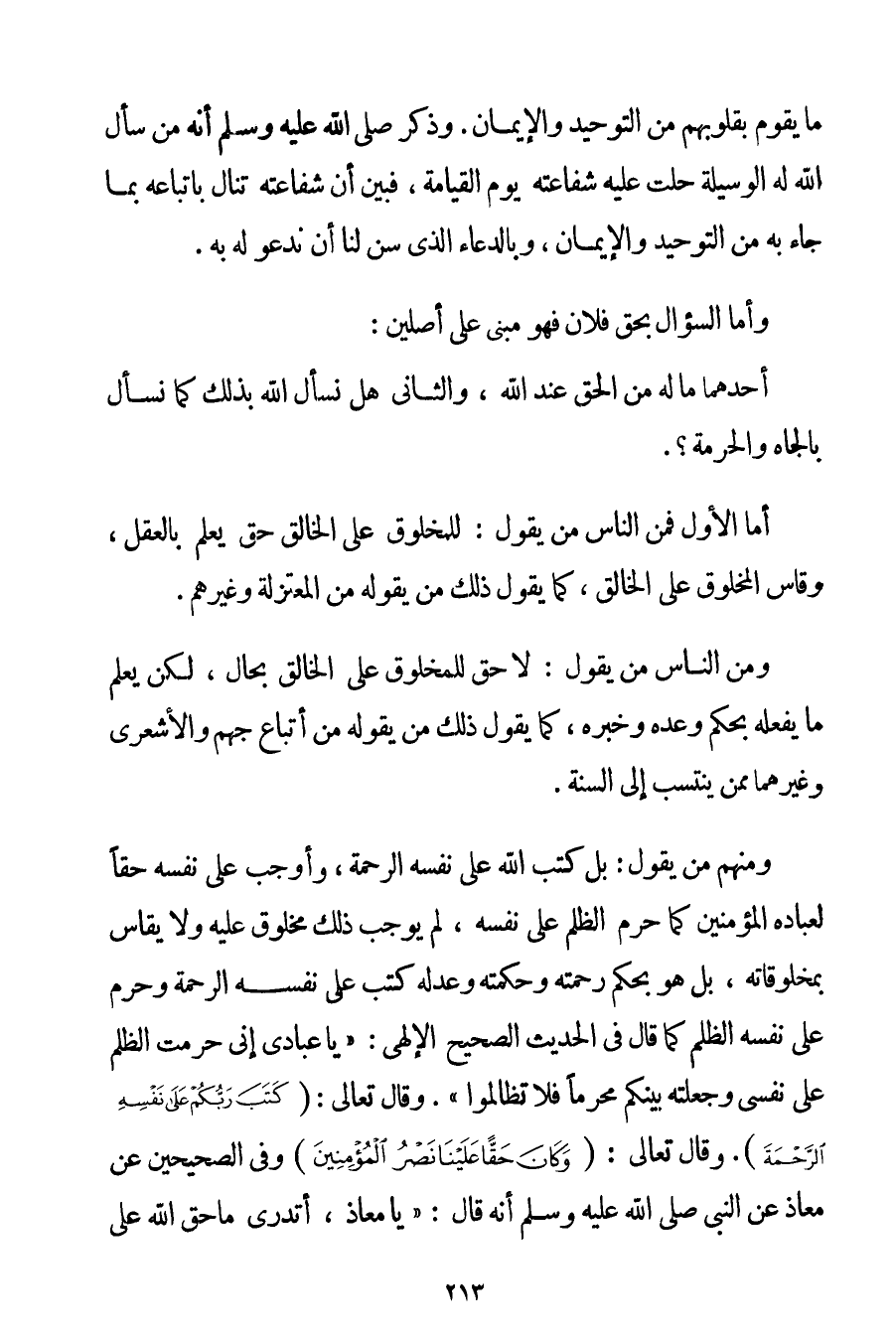 وَأَمَّا السُّؤَالُ بِحَقِّ فُلَانٍ فَهُوَ مَبْنِيٌّ عَلَى أَصْلَيْنِ: أَحَدُهُمَا مَا لَهُ مِنْ الْحَقِّ عِنْدَ اللَّهِ وَالثَّانِي هَلْ نَسْأَلُ اللَّهَ بِذَلِكَ كَمَا نَسْأَلُ بِالْجَاهِ وَالْحُرْمَةِ؟ أَمَّا الْأَوَّلُ فَمِنْ النَّاسِ مَنْ يَقُولُ: لِلْمَخْلُوقِ عَلَى الْخَالِقِ حَقٌّ يُعْلَمُ بِالْعَقْلِ وَقَاسَ الْمَخْلُوقَ عَلَى الْخَالِقِ كَمَا يَقُولُ ذَلِكَ مَنْ يَقُولُهُ مِنْ الْمُعْتَزِلَةِ وَغَيْرِهِمْ. وَمِنْ النَّاسِ مَنْ يَقُولُ: لَا حَقَّ لِلْمَخْلُوقِ عَلَى الْخَالِقِ بِحَالِ لَكِنْ يَعْلَمُ مَا يَفْعَلُهُ بِحُكْمِ وَعْدِهِ وَخَبَرِهِ كَمَا يَقُولُ ذَلِكَ مَنْ يَقُولُهُ مِنْ أَتْبَاعِ جَهْمٍ وَالْأَشْعَرِيِّ وَغَيْرِهِمَا مِمَّنْ يَنْتَسِبُ إلَى السُّنَّةِ. وَمِنْهُمْ مَنْ يَقُولُ: بَلْ كَتَبَ اللَّهُ عَلَى نَفْسِهِ الرَّحْمَةَ وَأَوْجَبَ عَلَى نَفْسِهِ حَقًّا لِعِبَادِهِ الْمُؤْمِنِينَ كَمَا حَرَّمَ الظُّلْمَ عَلَى نَفْسِهِ لَمْ يُوجِبْ ذَلِكَ مَخْلُوقٌ عَلَيْهِ وَلَا يُقَاسُ بِمَخْلُوقَاتِهِ بَلْ هُوَ بِحُكْمِ رَحْمَتِهِ وَحِكْمَتِهِ وَعَدْلِهِ كَتَبَ عَلَى نَفْسِهِ الرَّحْمَةَ وَحَرَّمَ عَلَى نَفْسِهِ الظُّلْمَ كَمَا قَالَ فِي الْحَدِيثِ الصَّحِيحِ الْإِلَهِيِّ: {يَا عِبَادِي إنِّي حَرَّمْت الظُّلْمَ عَلَى نَفْسِي وَجَعَلْته بَيْنَكُمْ مُحَرَّمًا فَلَا تظالموا} . وَقَالَ تَعَالَى: {كَتَبَ رَبُّكُمْ عَلَى نَفْسِهِ الرَّحْمَةَ} . وَقَالَ تَعَالَى: {وَكَانَ حَقًّا عَلَيْنَا نَصْرُ الْمُؤْمِنِينَ} وَفِي الصَّحِيحَيْنِ {عَنْ مُعَاذٍ عَنْ النَّبِيِّ صَلَّى اللَّهُ عَلَيْهِ وَسَلَّمَ أَنَّهُ قَالَ: يَا مُعَاذُ أَتَدْرِي مَا حَقُّ اللَّهِ عَلَى