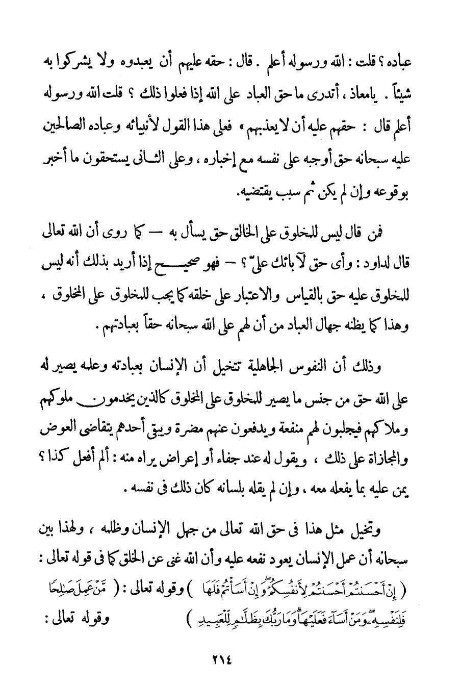عِبَادِهِ؟ قُلْت: اللَّهُ وَرَسُولُهُ أَعْلَمُ قَالَ: حَقُّهُ عَلَيْهِمْ أَنْ يَعْبُدُوهُ وَلَا يُشْرِكُوا بِهِ شَيْئًا. يَا مُعَاذُ أَتَدْرِي مَا حَقُّ الْعِبَادِ عَلَى اللَّهِ إذَا فَعَلُوا ذَلِكَ؟ قُلْت اللَّهُ وَرَسُولُهُ أَعْلَمُ قَالَ: حَقُّهُمْ عَلَيْهِ أَنْ لَا يُعَذِّبَهُمْ} فَعَلَى هَذَا الْقَوْلِ لِأَنْبِيَائِهِ وَعِبَادِهِ الصَّالِحِينَ عَلَيْهِ سُبْحَانَهُ حَقٌّ أَوْجَبَهُ عَلَى نَفْسِهِ مَعَ إخْبَارِهِ وَعَلَى الثَّانِي يَسْتَحِقُّونَ مَا أَخْبَرَ بِوُقُوعِهِ وَإِنْ لَمْ يَكُنْ ثَمَّ سَبَبٌ يَقْتَضِيهِ. فَمَنْ قَالَ لَيْسَ لِلْمَخْلُوقِ عَلَى الْخَالِقِ حَقٌّ يُسْأَلُ بِهِ - كَمَا رُوِيَ أَنَّ اللَّهَ تَعَالَى قَالَ لدَاوُد: وَأَيُّ حَقٍّ لِآبَائِك عَلَيَّ؟ - فَهُوَ صَحِيحٌ إذَا أُرِيدَ بِذَلِكَ أَنَّهُ لَيْسَ لِلْمَخْلُوقِ عَلَيْهِ حَقٌّ بِالْقِيَاسِ وَالِاعْتِبَارِ عَلَى خَلْقِهِ كَمَا يَجِبُ لِلْمَخْلُوقِ عَلَى الْمَخْلُوقِ وَهَذَا كَمَا يَظُنُّهُ جُهَّالُ الْعُبَّادِ مِنْ أَنَّ لَهُمْ عَلَى اللَّهِ سُبْحَانَهُ حَقًّا بِعِبَادَتِهِمْ. وَذَلِكَ أَنَّ النُّفُوسَ الْجَاهِلِيَّةَ تَتَخَيَّلُ أَنَّ الْإِنْسَانَ بِعِبَادَتِهِ وَعِلْمِهِ يَصِيرُ لَهُ عَلَى اللَّهِ حَقٌّ مِنْ جِنْسِ مَا يَصِيرُ لِلْمَخْلُوقِ عَلَى الْمَخْلُوقِ كَاَلَّذِينَ يَخْدِمُونَ مُلُوكَهُمْ وَمُلَّاكَهُمْ فَيَجْلِبُونَ لَهُمْ مَنْفَعَةً وَيَدْفَعُونَ عَنْهُمْ مَضَرَّةً وَيَبْقَى أَحَدُهُمْ يَتَقَاضَى الْعِوَضَ وَالْمُجَازَاةَ عَلَى ذَلِكَ وَيَقُولُ لَهُ عِنْدَ جَفَاءٍ أَوْ إعْرَاضٍ يَرَاهُ مِنْهُ: أَلَمْ أَفْعَلْ كَذَا؟ يَمُنُّ عَلَيْهِ بِمَا يَفْعَلُهُ مَعَهُ وَإِنْ لَمْ يَقُلْهُ بِلِسَانِهِ كَانَ ذَلِكَ فِي نَفْسِهِ. وَتَخَيُّلُ مِثْلِ هَذَا فِي حَقِّ اللَّهِ تَعَالَى مِنْ جَهْلِ الْإِنْسَانِ وَظُلْمِهِ وَلِهَذَا بَيَّنَ سُبْحَانَهُ أَنَّ عَمَلَ الْإِنْسَانِ يَعُودُ نَفْعُهُ عَلَيْهِ وَأَنَّ اللَّهَ غَنِيٌّ عَنْ الْخَلْقِ كَمَا فِي قَوْله تَعَالَى {إنْ أَحْسَنْتُمْ أَحْسَنْتُمْ لِأَنْفُسِكُمْ وَإِنْ أَسَأْتُمْ فَلَهَا} وقَوْله تَعَالَى {مَنْ عَمِلَ صَالِحًا فَلِنَفْسِهِ وَمَنْ أَسَاءَ فَعَلَيْهَا وَمَا رَبُّكَ بِظَلَّامٍ لِلْعَبِيدِ} وقَوْله تَعَالَى {إنْ تَكْفُرُوا