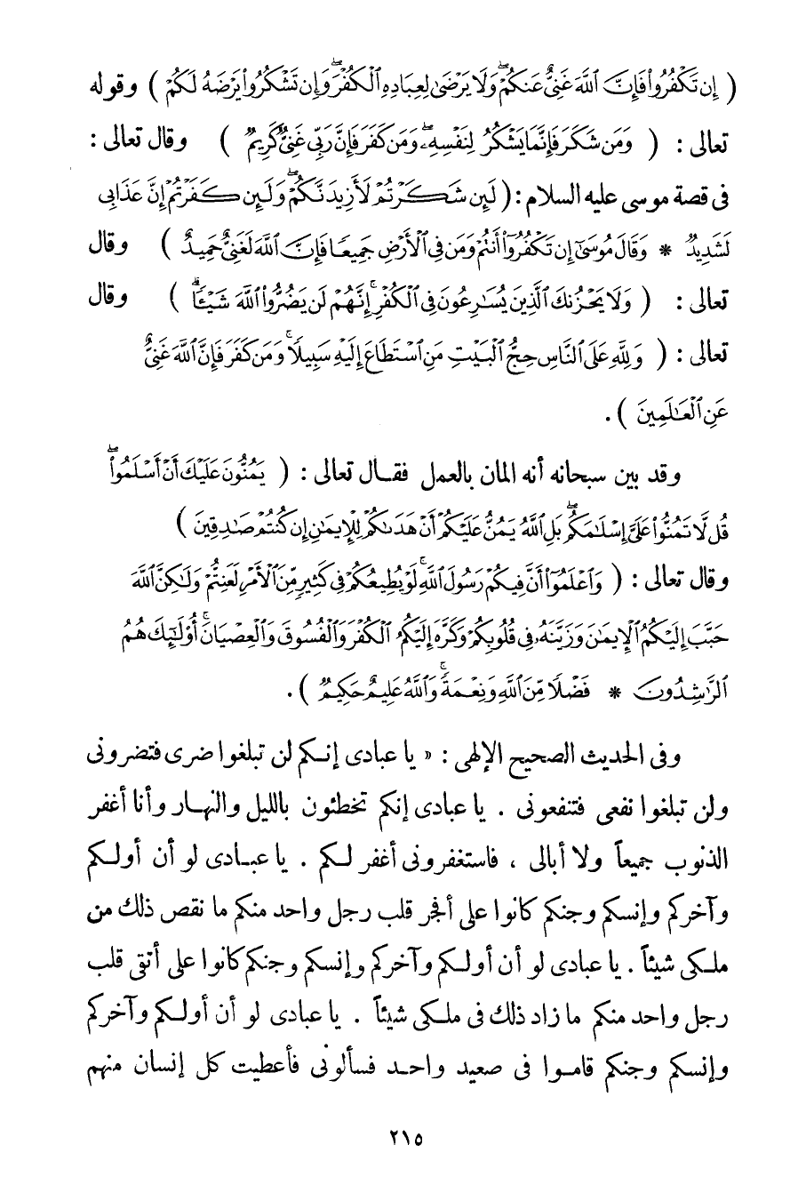 فَإِنَّ اللَّهَ غَنِيٌّ عَنْكُمْ وَلَا يَرْضَى لِعِبَادِهِ الْكُفْرَ وَإِنْ تَشْكُرُوا يَرْضَهُ لَكُمْ} وقَوْله تَعَالَى {وَمَنْ شَكَرَ فَإِنَّمَا يَشْكُرُ لِنَفْسِهِ وَمَنْ كَفَرَ فَإِنَّ رَبِّي غَنِيٌّ كَرِيمٌ} وَقَالَ تَعَالَى: فِي قِصَّةِ مُوسَى عَلَيْهِ السَّلَامُ {لَئِنْ شَكَرْتُمْ لَأَزِيدَنَّكُمْ وَلَئِنْ كَفَرْتُمْ إنَّ عَذَابِي لَشَدِيدٌ} {وَقَالَ مُوسَى إنْ تَكْفُرُوا أَنْتُمْ وَمَنْ فِي الْأَرْضِ جَمِيعًا فَإِنَّ اللَّهَ لَغَنِيٌّ حَمِيدٌ} وَقَالَ تَعَالَى: {وَلَا يَحْزُنْكَ الَّذِينَ يُسَارِعُونَ فِي الْكُفْرِ إنَّهُمْ لَنْ يَضُرُّوا اللَّهَ شَيْئًا} وَقَالَ تَعَالَى: {وَلِلَّهِ عَلَى النَّاسِ حِجُّ الْبَيْتِ مَنِ اسْتَطَاعَ إلَيْهِ سَبِيلًا وَمَنْ كَفَرَ فَإِنَّ اللَّهَ غَنِيٌّ عَنِ الْعَالَمِينَ} . وَقَدْ بَيَّنَ سُبْحَانَهُ أَنَّهُ الْمَانُّ بِالْعَمَلِ فَقَالَ تَعَالَى: {يَمُنُّونَ عَلَيْكَ أَنْ أَسْلَمُوا قُلْ لَا تَمُنُّوا عَلَيَّ إسْلَامَكُمْ بَلِ اللَّهُ يَمُنُّ عَلَيْكُمْ أَنْ هَدَاكُمْ لِلْإِيمَانِ إنْ كُنْتُمْ صَادِقِينَ} وَقَالَ تَعَالَى: {وَاعْلَمُوا أَنَّ فِيكُمْ رَسُولَ اللَّهِ لَوْ يُطِيعُكُمْ فِي كَثِيرٍ مِنَ الْأَمْرِ لَعَنِتُّمْ وَلَكِنَّ اللَّهَ حَبَّبَ إلَيْكُمُ الْإِيمَانَ وَزَيَّنَهُ فِي قُلُوبِكُمْ وَكَرَّهَ إلَيْكُمُ الْكُفْرَ وَالْفُسُوقَ وَالْعِصْيَانَ أُولَئِكَ هُمُ الرَّاشِدُونَ} {فَضْلًا مِنَ اللَّهِ وَنِعْمَةً وَاللَّهُ عَلِيمٌ حَكِيمٌ} . وَفِي الْحَدِيثِ الصَّحِيحِ الْإِلَهِيِّ: {يَا عِبَادِي إنَّكُمْ لَنْ تَبْلُغُوا ضَرِّي فَتَضُرُّونِي وَلَنْ تَبْلُغُوا نَفْعِي فَتَنْفَعُونِي. يَا عِبَادِي إنَّكُمْ تُخْطِئُونَ بِاللَّيْلِ وَالنَّهَارِ وَأَنَا أَغْفِرُ الذُّنُوبَ جَمِيعًا وَلَا أُبَالِي فَاسْتَغْفِرُونِي أَغْفِرْ لَكُمْ. يَا عِبَادِي لَوْ أَنَّ أَوَّلَكُمْ وَآخِرَكُمْ وَإِنْسَكُمْ وَجِنَّكُمْ كَانُوا عَلَى أَفْجَرِ قَلْبِ رَجُلٍ وَاحِدٍ مِنْكُمْ مَا نَقَصَ ذَلِكَ مِنْ مُلْكِي شَيْئًا. يَا عِبَادِي لَوْ أَنَّ أَوَّلَكُمْ وَآخِرَكُمْ وَإِنْسَكُمْ وَجِنَّكُمْ كَانُوا عَلَى أَتْقَى قَلْبِ رَجُلٍ وَاحِدٍ مِنْكُمْ مَا زَادَ ذَلِكَ فِي مُلْكِي شَيْئًا. يَا عِبَادِي لَوْ أَنَّ أَوَّلَكُمْ وَآخِرَكُمْ وَإِنْسَكُمْ وَجِنَّكُمْ قَامُوا فِي صَعِيدٍ وَاحِدٍ فَسَأَلُونِي فَأَعْطَيْت كُلَّ إنْسَانٍ مِنْهُمْ