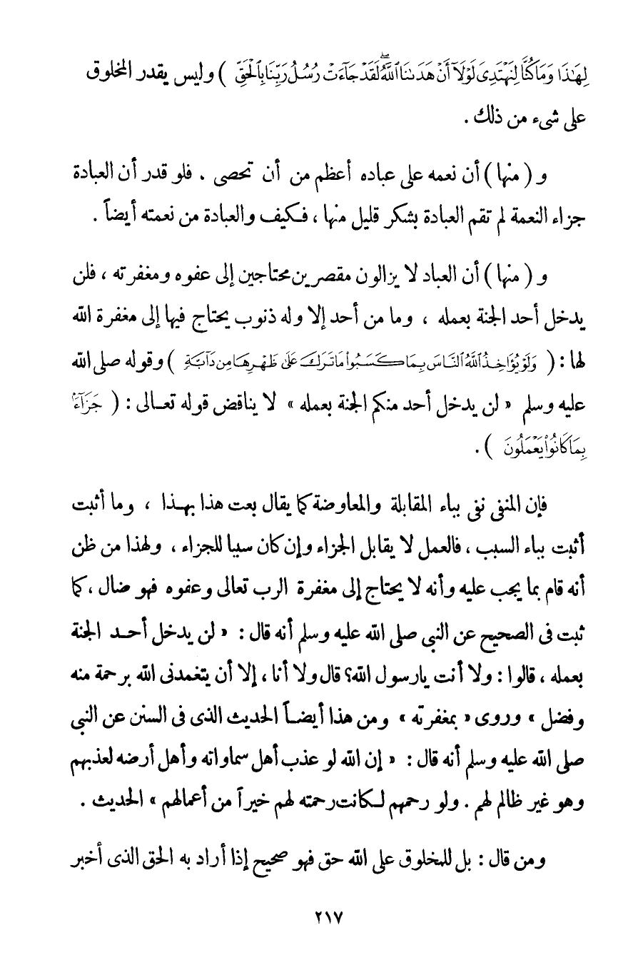وَ (مِنْهَا أَنَّ نِعَمَهُ عَلَى عِبَادِهِ أَعْظَمُ مِنْ أَنْ تُحْصَى فَلَوْ قُدِّرَ أَنَّ الْعِبَادَةَ جَزَاءُ النِّعْمَةِ لَمْ تَقُمْ الْعِبَادَةُ بِشُكْرِ قَلِيلٍ مِنْهَا فَكَيْفَ وَالْعِبَادَةُ مِنْ نِعْمَتِهِ أَيْضًا. وَ (مِنْهَا أَنَّ الْعِبَادَ لَا يَزَالُونَ مُقَصِّرِينَ مُحْتَاجِينَ إلَى عَفْوِهِ وَمَغْفِرَتِهِ فَلَنْ يَدْخُلَ أَحَدٌ الْجَنَّةَ بِعَمَلِهِ وَمَا مِنْ أَحَدٍ إلَّا وَلَهُ ذُنُوبٌ يَحْتَاجُ فِيهَا إلَى مَغْفِرَةِ اللَّهِ لَهَا: {وَلَوْ يُؤَاخِذُ اللَّهُ النَّاسَ بِمَا كَسَبُوا مَا تَرَكَ عَلَى ظَهْرِهَا مِنْ دَابَّةٍ} وَقَوْلُهُ صَلَّى اللَّهُ عَلَيْهِ وَسَلَّمَ {لَنْ يَدْخُلَ أَحَدٌ مِنْكُمْ الْجَنَّةَ بِعَمَلِهِ} لَا يُنَاقِضُ قَوْله تَعَالَى {جَزَاءً بِمَا كَانُوا يَعْمَلُونَ} . فَإِنَّ الْمَنْفِيَّ نُفِيَ بِبَاءِ الْمُقَابَلَةِ وَالْمُعَاوَضَةِ كَمَا يُقَالُ بِعْت هَذَا بِهَذَا وَمَا أُثْبِتَ أُثْبِتَ بِبَاءِ السَّبَبِ فَالْعَمَلُ لَا يُقَابِلُ الْجَزَاءَ وَإِنْ كَانَ سَبَبًا لِلْجَزَاءِ وَلِهَذَا مَنْ ظَنَّ أَنَّهُ قَامَ بِمَا يَجِبُ عَلَيْهِ وَأَنَّهُ لَا يَحْتَاجُ إلَى مَغْفِرَةِ الرَّبِّ تَعَالَى وَعَفْوِهِ فَهُوَ ضَالٌّ كَمَا ثَبَتَ فِي الصَّحِيحِ عَنْ النَّبِيِّ صَلَّى اللَّهُ عَلَيْهِ وَسَلَّمَ أَنَّهُ قَالَ: {لَنْ يَدْخُلَ أَحَدٌ الْجَنَّةَ بِعَمَلِهِ قَالُوا: وَلَا أَنْتَ يَا رَسُولَ اللَّهِ؟ قَالَ وَلَا أَنَا إلَّا أَنْ يَتَغَمَّدَنِي اللَّهُ بِرَحْمَةِ مِنْهُ وَفَضْلٍ وَرُوِيَ بِمَغْفِرَتِهِ} وَمِنْ هَذَا أَيْضًا الْحَدِيثُ الَّذِي فِي السُّنَنِ عَنْ النَّبِيِّ صَلَّى اللَّهُ عَلَيْهِ وَسَلَّمَ أَنَّهُ قَالَ: {إنَّ اللَّهَ لَوْ عَذَّبَ أَهْلَ سَمَوَاتِهِ وَأَهْلَ أَرْضِهِ لَعَذَّبَهُمْ وَهُوَ غَيْرُ ظَالِمٍ لَهُمْ. وَلَوْ رَحِمَهُمْ لَكَانَتْ رَحْمَتُهُ لَهُمْ خَيْرًا مِنْ أَعْمَالِهِمْ} الْحَدِيثَ.
