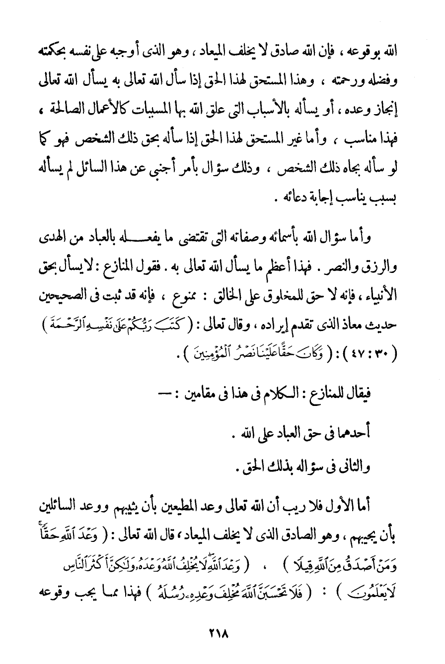 وَأَمَّا سُؤَالُ اللَّهِ بِأَسْمَائِهِ وَصِفَاتِهِ الَّتِي تَقْتَضِي مَا يَفْعَلُهُ بِالْعِبَادِ مِنْ الْهُدَى وَالرِّزْقِ وَالنَّصْرِ. فَهَذَا أَعْظَمُ مَا يُسْأَلُ اللَّهُ تَعَالَى بِهِ. فَقَوْلُ الْمُنَازِعِ: لَا يُسْأَلُ بِحَقِّ الْأَنْبِيَاءِ فَإِنَّهُ لَا حَقَّ لِلْمَخْلُوقِ عَلَى الْخَالِقِ: مَمْنُوعٌ فَإِنَّهُ قَدْ ثَبَتَ فِي الصَّحِيحَيْنِ حَدِيثُ مُعَاذٍ الَّذِي تَقَدَّمَ إيرَادُهُ وَقَالَ تَعَالَى: {كَتَبَ رَبُّكُمْ عَلَى نَفْسِهِ الرَّحْمَةَ} {وَكَانَ حَقًّا عَلَيْنَا نَصْرُ الْمُؤْمِنِينَ} . فَيُقَالُ لِلْمُنَازِعِ: الْكَلَامُ فِي هَذَا فِي مَقَامَيْنِ: - أَحَدُهُمَا فِي حَقِّ الْعِبَادِ عَلَى اللَّهِ. وَالثَّانِي فِي سُؤَالِهِ بِذَلِكَ الْحَقِّ. أَمَّا الْأَوَّلُ فَلَا رَيْبَ أَنَّ اللَّهَ تَعَالَى وَعَدَ الْمُطِيعِينَ بِأَنْ يُثِيبَهُمْ وَوَعَدَ السَّائِلِينَ بِأَنْ يُجِيبَهُمْ وَهُوَ الصَّادِقُ الَّذِي لَا يُخْلِفُ الْمِيعَادَ قَالَ اللَّهُ تَعَالَى: {وَعْدَ اللَّهِ حَقًّا وَمَنْ أَصْدَقُ مِنَ اللَّهِ قِيلًا} {وَعْدَ اللَّهِ لَا يُخْلِفُ اللَّهُ وَعْدَهُ وَلَكِنَّ أَكْثَرَ النَّاسِ لَا يَعْلَمُونَ} {فَلَا تَحْسَبَنَّ اللَّهَ مُخْلِفَ وَعْدِهِ رُسُلَهُ} فَهَذَا مِمَّا يَجِبُ وُقُوعُهُ