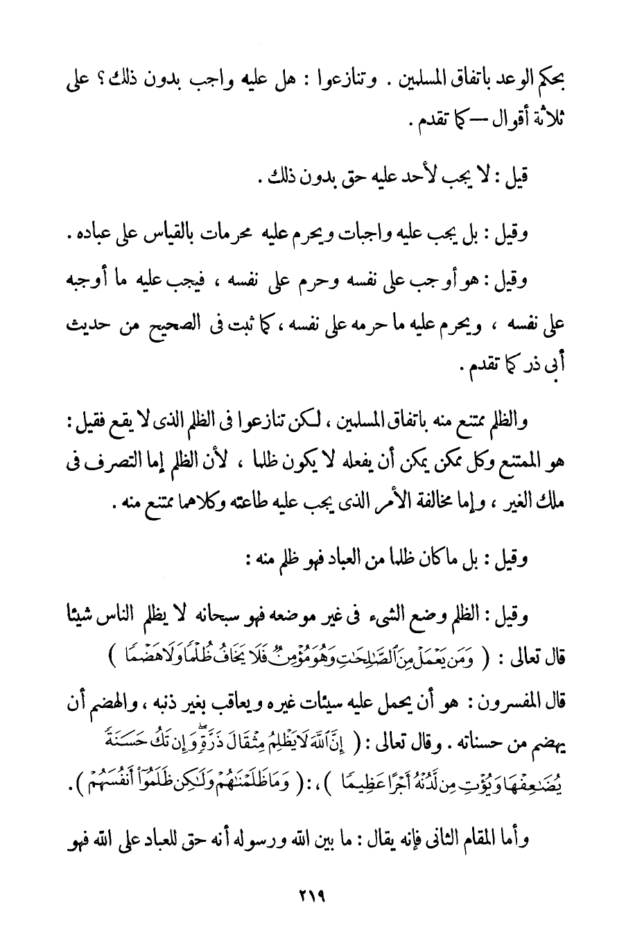بِحُكْمِ الْوَعْدِ بِاتِّفَاقِ الْمُسْلِمِينَ. وَتَنَازَعُوا: هَلْ عَلَيْهِ وَاجِبٌ بِدُونِ ذَلِكَ؟ عَلَى ثَلَاثَةِ أَقْوَالٍ - كَمَا تَقَدَّمَ. قِيلَ: لَا يَجِبُ لِأَحَدِ عَلَيْهِ حَقٌّ بِدُونِ ذَلِكَ. وَقِيلَ: بَلْ يَجِبُ عَلَيْهِ وَاجِبَاتٌ وَيَحْرُمُ عَلَيْهِ مُحَرَّمَاتٌ بِالْقِيَاسِ عَلَى عِبَادِهِ. وَقِيلَ: هُوَ أَوْجَبَ عَلَى نَفْسِهِ وَحَرَّمَ عَلَى نَفْسِهِ فَيَجِبُ عَلَيْهِ مَا أَوْجَبَهُ عَلَى نَفْسِهِ وَيَحْرُمُ عَلَيْهِ مَا حَرَّمَهُ عَلَى نَفْسِهِ كَمَا ثَبَتَ فِي الصَّحِيحِ مِنْ حَدِيثِ أَبِي ذَرٍّ كَمَا تَقَدَّمَ. وَالظُّلْمُ مُمْتَنِعٌ مِنْهُ بِاتِّفَاقِ الْمُسْلِمِينَ لَكِنْ تَنَازَعُوا فِي الظُّلْمِ الَّذِي لَا يَقَعُ فَقِيلَ: هُوَ الْمُمْتَنِعُ وَكُلُّ مُمْكِنٍ يُمْكِنُ أَنْ يَفْعَلَهُ لَا يَكُونُ ظُلْمًا لِأَنَّ الظُّلْمَ إمَّا التَّصَرُّفُ فِي مِلْكِ الْغَيْرِ وَإِمَّا مُخَالَفَةُ الْأَمْرِ الَّذِي يَجِبُ عَلَيْهِ طَاعَتُهُ وَكِلَاهُمَا مُمْتَنِعٌ مِنْهُ. وَقِيلَ: بَلْ مَا كَانَ ظُلْمًا مِنْ الْعِبَادِ فَهُوَ ظُلْمٌ مِنْهُ: وَقِيلَ: الظُّلْمُ وَضْعُ الشَّيْءِ فِي غَيْرِ مَوْضِعِهِ فَهُوَ سُبْحَانَهُ لَا يَظْلِمُ النَّاسَ شَيْئًا قَالَ تَعَالَى: {وَمَنْ يَعْمَلْ مِنَ الصَّالِحَاتِ وَهُوَ مُؤْمِنٌ فَلَا يَخَافُ ظُلْمًا وَلَا هَضْمًا} قَالَ الْمُفَسِّرُونَ: هُوَ أَنْ يُحْمَلَ عَلَيْهِ سَيِّئَاتُ غَيْرِهِ وَيُعَاقَبَ بِغَيْرِ ذَنْبِهِ وَالْهَضْمُ أَنْ يُهْضَمَ مِنْ حَسَنَاتِهِ. وَقَالَ تَعَالَى: {إنَّ اللَّهَ لَا يَظْلِمُ مِثْقَالَ ذَرَّةٍ وَإِنْ تَكُ حَسَنَةً يُضَاعِفْهَا وَيُؤْتِ مِنْ لَدُنْهُ أَجْرًا عَظِيمًا} {وَمَا ظَلَمْنَاهُمْ وَلَكِنْ ظَلَمُوا أَنْفُسَهُمْ} . وَأَمَّا الْمَقَامُ الثَّانِي فَإِنَّهُ يُقَالُ: مَا بَيَّنَ اللَّهُ وَرَسُولُهُ أَنَّهُ حَقٌّ لِلْعِبَادِ عَلَى اللَّهِ فَهُوَ
