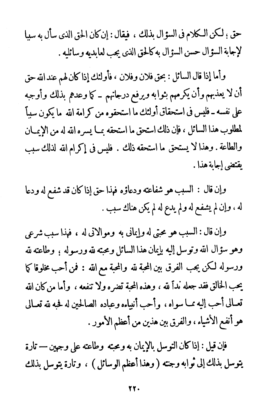 حَقٌّ؛ لَكِنَّ الْكَلَامَ فِي السُّؤَالِ بِذَلِكَ فَيُقَالُ: إنْ كَانَ الْحَقُّ الَّذِي سَأَلَ بِهِ سَبَبًا لِإِجَابَةِ السُّؤَالِ حَسُنَ السُّؤَالُ بِهِ كَالْحَقِّ الَّذِي يَجِبُ لِعَابِدِيهِ وَسَائِلِيهِ. وَأَمَّا إذَا قَالَ السَّائِلُ: بِحَقِّ فُلَانٍ وَفُلَانٍ فَأُولَئِكَ إذَا كَانَ لَهُمْ عِنْدَ اللَّهِ حَقٌّ أَنْ لَا يُعَذِّبَهُمْ وَأَنْ يُكْرِمَهُمْ بِثَوَابِهِ وَيَرْفَعَ دَرَجَاتِهِمْ - كَمَا وَعَدَهُمْ بِذَلِكَ وَأَوْجَبَهُ عَلَى نَفْسِهِ - فَلَيْسَ فِي اسْتِحْقَاقِ أُولَئِكَ مَا اسْتَحَقُّوهُ مِنْ كَرَامَةِ اللَّهِ مَا يَكُونُ سَبَبًا لِمَطْلُوبِ هَذَا السَّائِلِ فَإِنَّ ذَلِكَ اسْتَحَقَّ مَا اسْتَحَقَّهُ بِمَا يَسَّرَهُ اللَّهُ لَهُ مِنْ الْإِيمَانِ وَالطَّاعَةِ. وَهَذَا لَا يَسْتَحِقُّ مَا اسْتَحَقَّهُ ذَلِكَ. فَلَيْسَ فِي إكْرَامِ اللَّهِ لِذَلِكَ سَبَبٌ يَقْتَضِي إجَابَةَ هَذَا. وَإِنْ قَالَ: السَّبَبُ هُوَ شَفَاعَتُهُ وَدُعَاؤُهُ فَهَذَا حَقٌّ إذَا كَانَ قَدْ شَفَعَ لَهُ وَدَعَا لَهُ وَإِنْ لَمْ يَشْفَعْ لَهُ وَلَمْ يَدْعُ لَهُ لَمْ يَكُنْ هُنَاكَ سَبَبٌ. وَإِنْ قَالَ: السَّبَبُ هُوَ مَحَبَّتِي لَهُ وَإِيمَانِي بِهِ وَمُوَالَاتِي لَهُ فَهَذَا سَبَبٌ شَرْعِيٌّ وَهُوَ سُؤَالُ اللَّهِ وَتَوَسُّلٌ إلَيْهِ بِإِيمَانِ هَذَا السَّائِلِ وَمَحَبَّتِهِ لِلَّهِ وَرَسُولِهِ؛ وَطَاعَتِهِ لِلَّهِ وَرَسُولِهِ لَكِنْ يَجِبُ الْفَرْقُ بَيْنَ الْمَحَبَّةِ لِلَّهِ وَالْمَحَبَّةِ مَعَ اللَّهِ: فَمَنْ أَحَبَّ مَخْلُوقًا كَمَا يُحِبُّ الْخَالِقَ فَقَدْ جَعَلَهُ نِدًّا لِلَّهِ وَهَذِهِ الْمَحَبَّةُ تَضُرُّهُ وَلَا تَنْفَعُهُ وَأَمَّا مَنْ كَانَ اللَّهُ تَعَالَى أَحَبَّ إلَيْهِ مِمَّا سِوَاهُ وَأَحَبَّ أَنْبِيَاءَهُ وَعِبَادَهُ الصَّالِحِينَ لَهُ فَحُبُّهُ لِلَّهِ تَعَالَى هُوَ أَنْفَع الْأَشْيَاءِ وَالْفَرْقُ بَيْنَ هَذَيْنِ مِنْ أَعْظَمِ الْأُمُورِ.